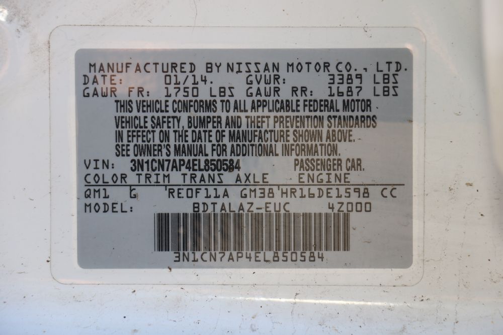2014 Nissan Versa Sedan FWD with a 1.6L L4 DOHC 16V engine, Automatic. VIN: 3N1CN7AP4EL850584. Odometer Reading: 100,082 Miles. Cloth interior, power locks, manual windows, cruise control, equipped with Apple CarPlay/Android Auto & Bluetooth, heat & A/C. Seller Reports: Has new tires and was a non-smoking vehicle. Runs & drives. Title, bill of sale & keys available.