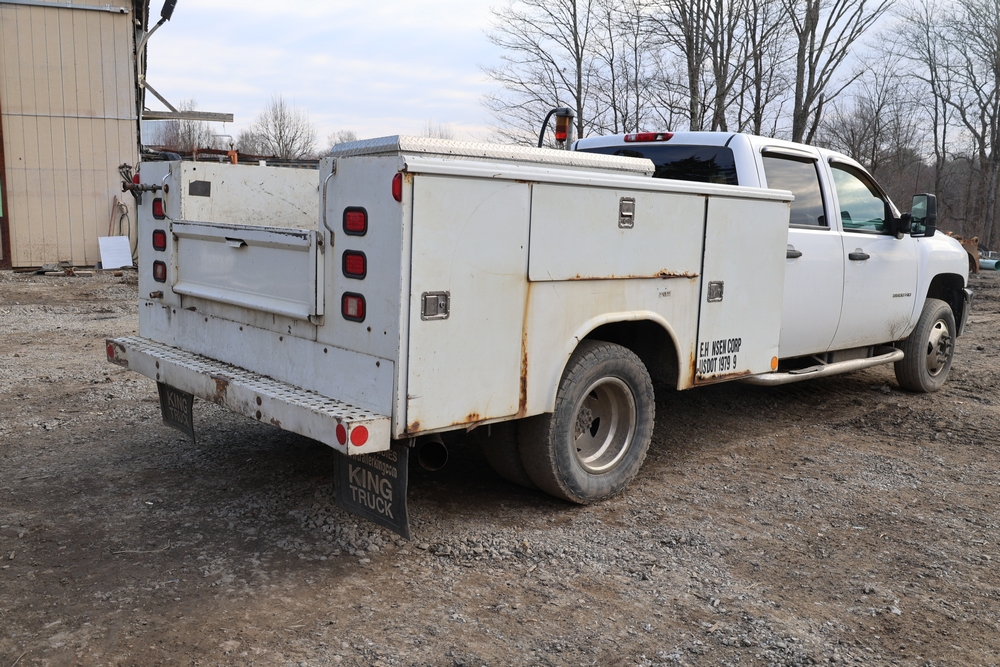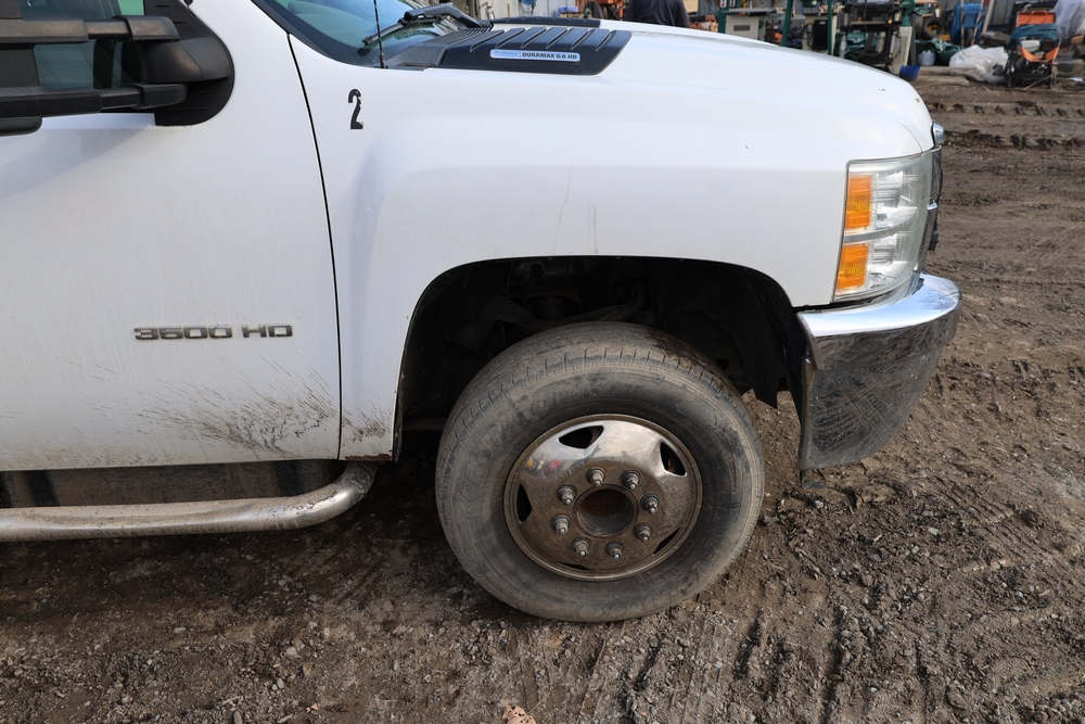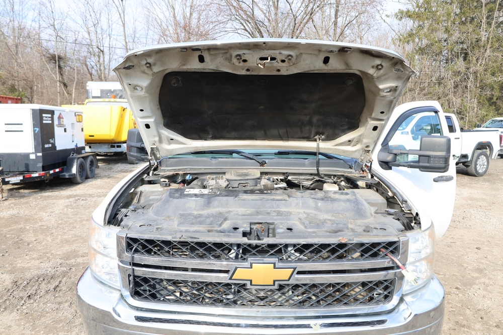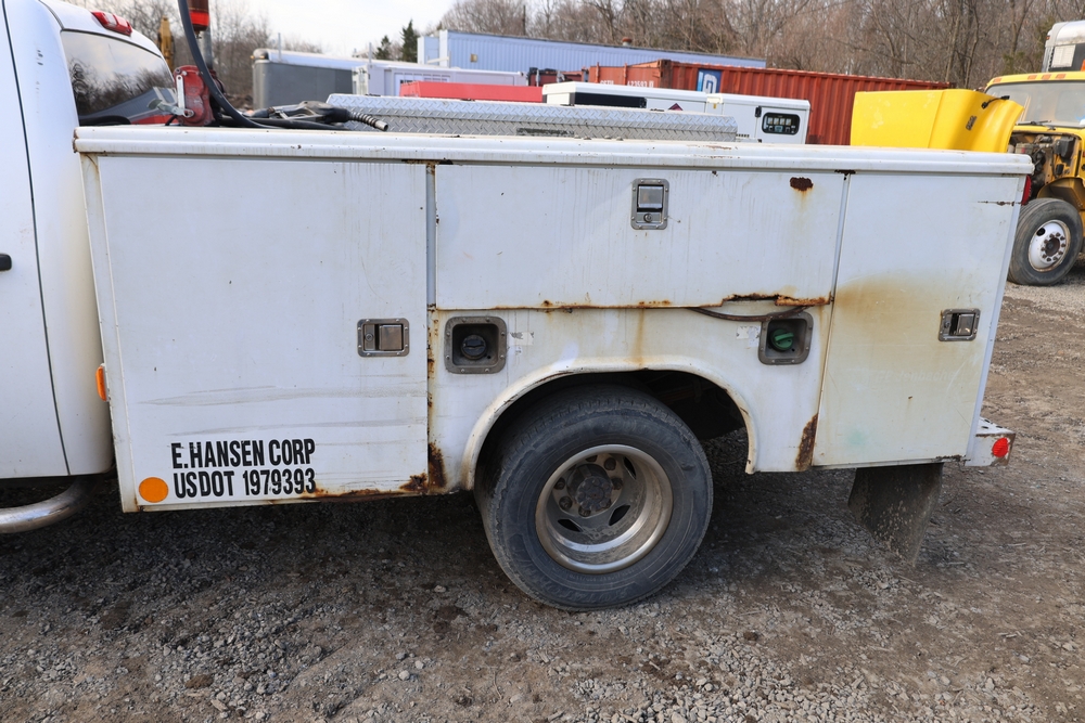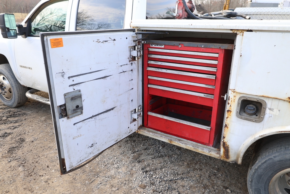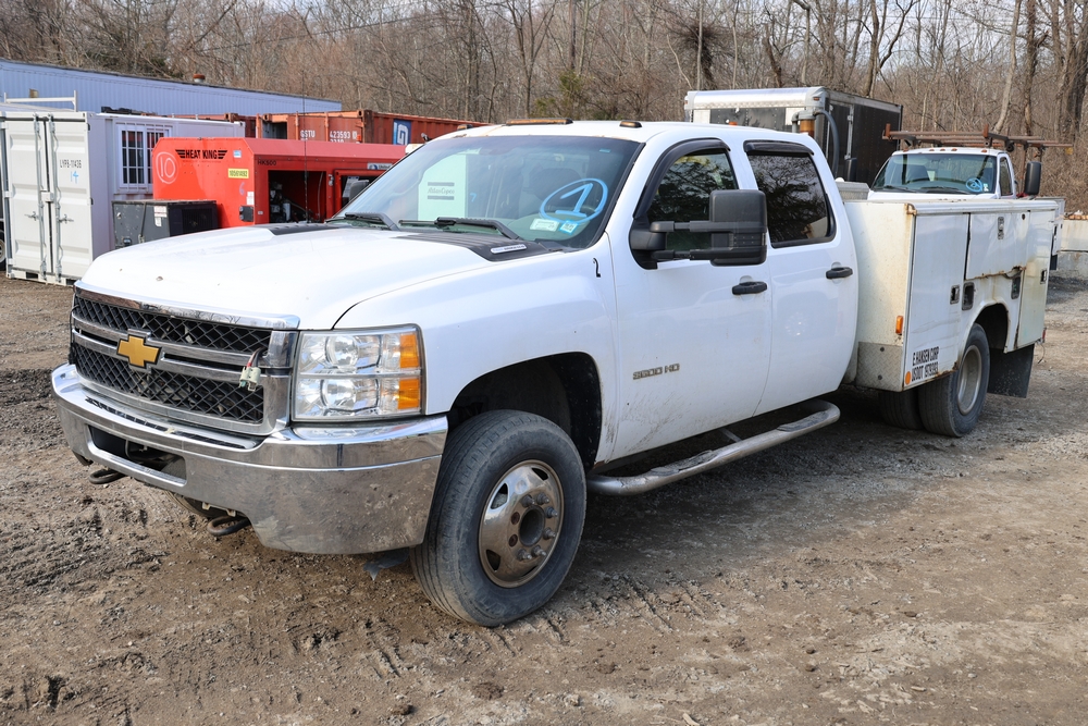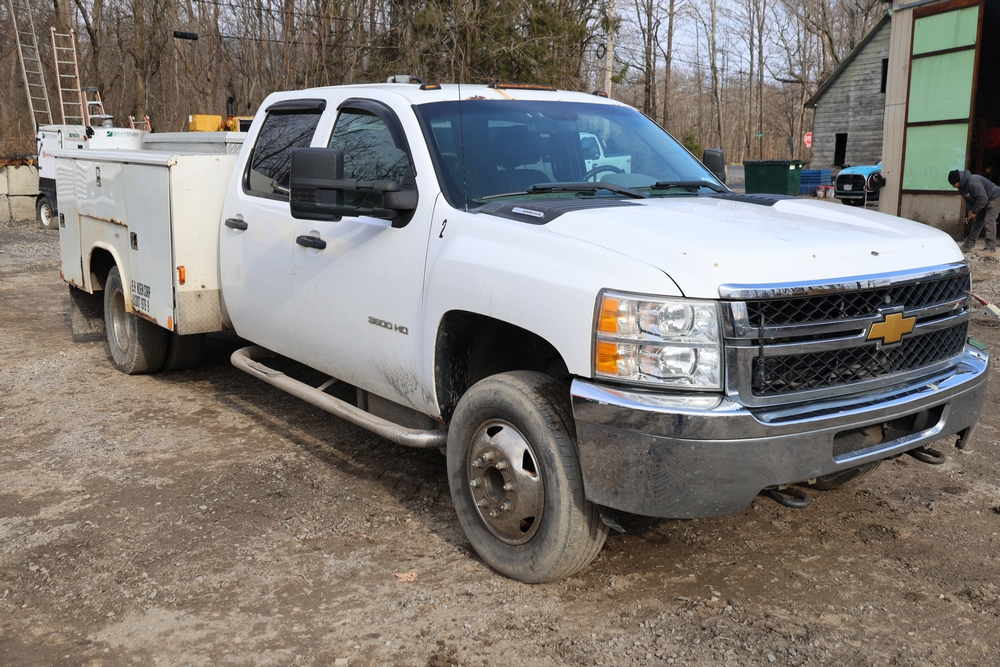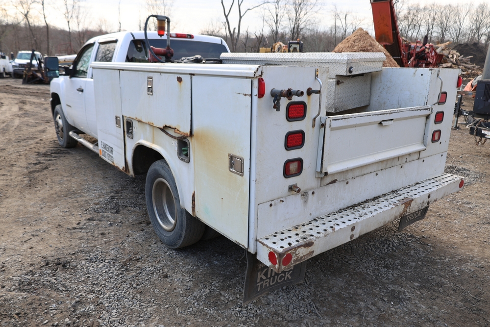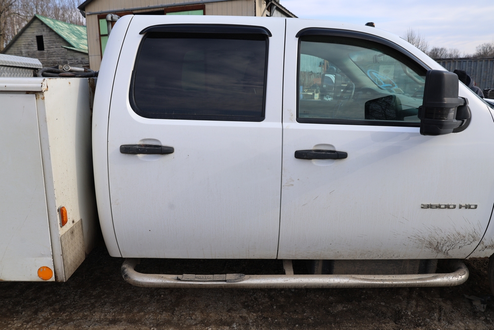 2012 Chevrolet Silverado 3500HD Work Truck Crew Cab 2WD service truck with a 6.6L V8 OHV 32V TURBO DIESEL engine. VIN: 1GB4CZCL1CF172191. Odometer reading: 276690. Body: crew cab pickup 4-dr. RWD, 6-speed automatic transmission, locking differential, utility body, dual rear wheels, running boards, tow hooks, 100 gallon fuel transfer tank with pump and nozzle, diamond plate crossover toolbox, beacon light, steel wheels, tow hitch receiver, air conditioning, cruise control, tilt steering, AM/FM radio, power door locks. Runs and drives. Title and key available.