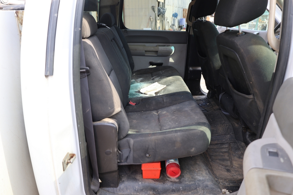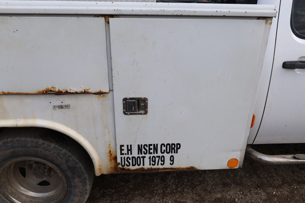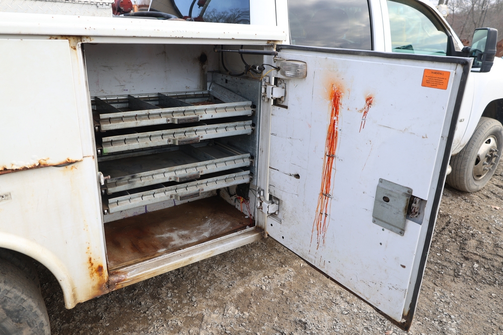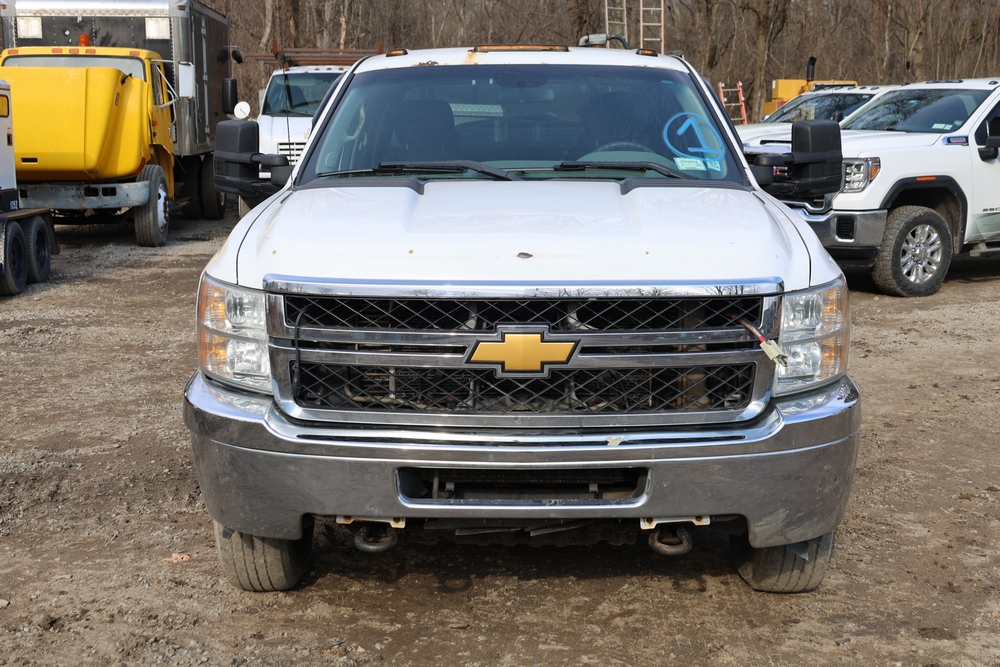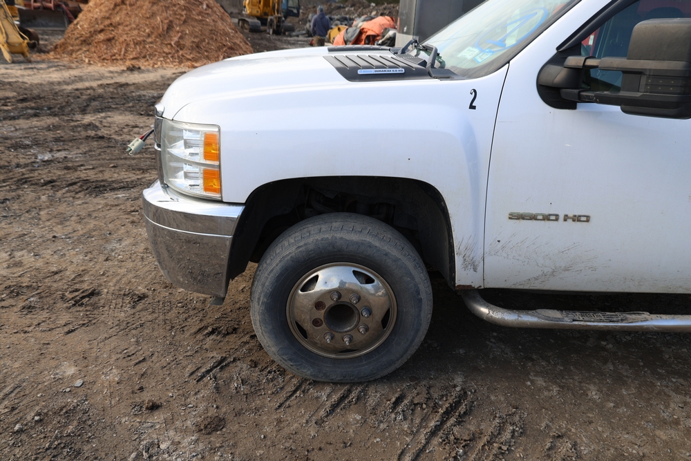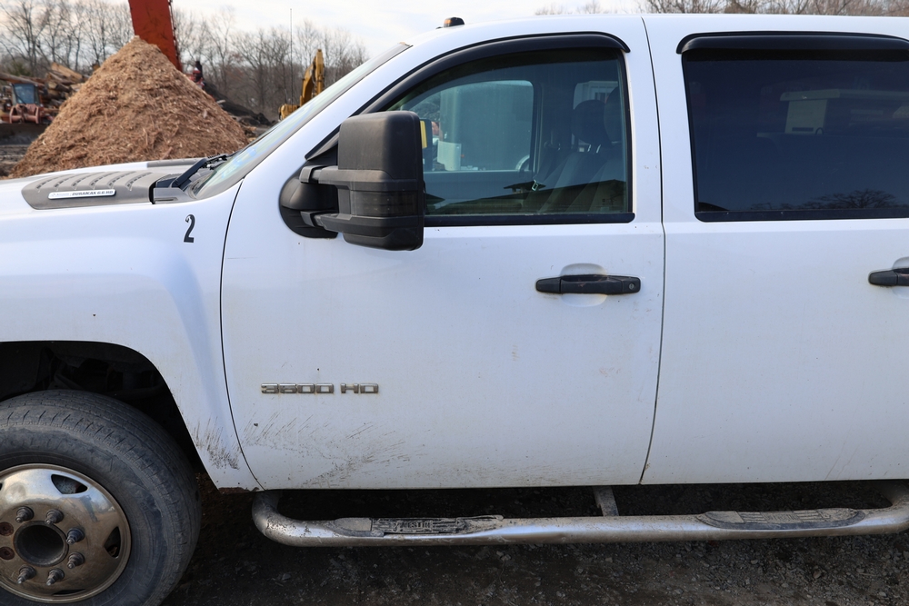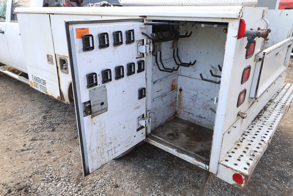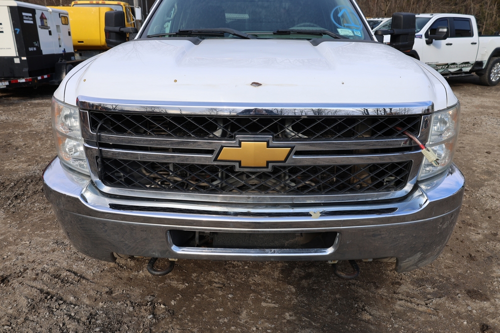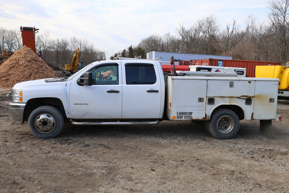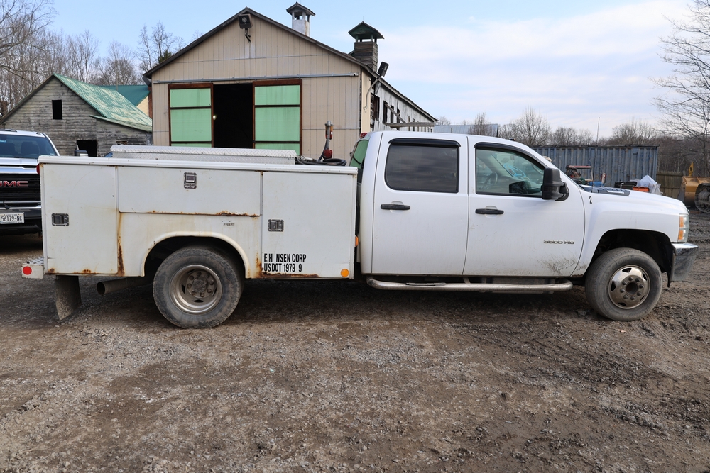 2012 Chevrolet Silverado 3500HD Work Truck Crew Cab 2WD service truck with a 6.6L V8 OHV 32V TURBO DIESEL engine. VIN: 1GB4CZCL1CF172191. Odometer reading: 276690. Body: crew cab pickup 4-dr. RWD, 6-speed automatic transmission, locking differential, utility body, dual rear wheels, running boards, tow hooks, 100 gallon fuel transfer tank with pump and nozzle, diamond plate crossover toolbox, beacon light, steel wheels, tow hitch receiver, air conditioning, cruise control, tilt steering, AM/FM radio, power door locks. Runs and drives. Title and key available.