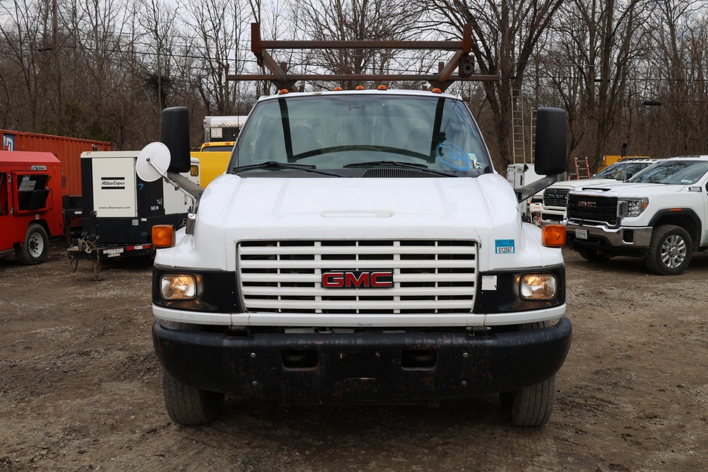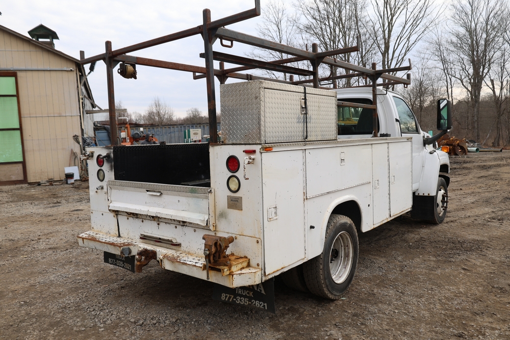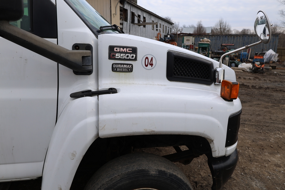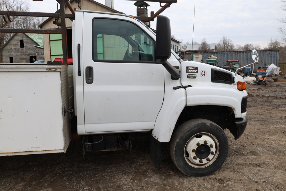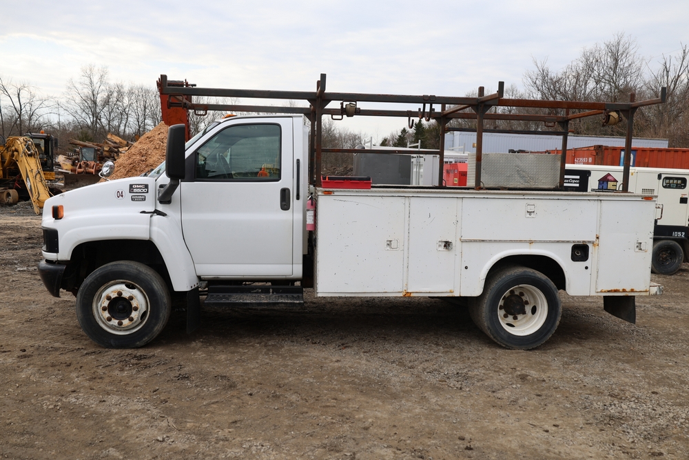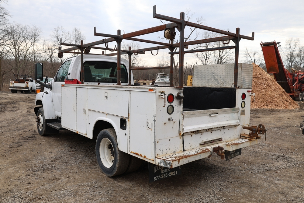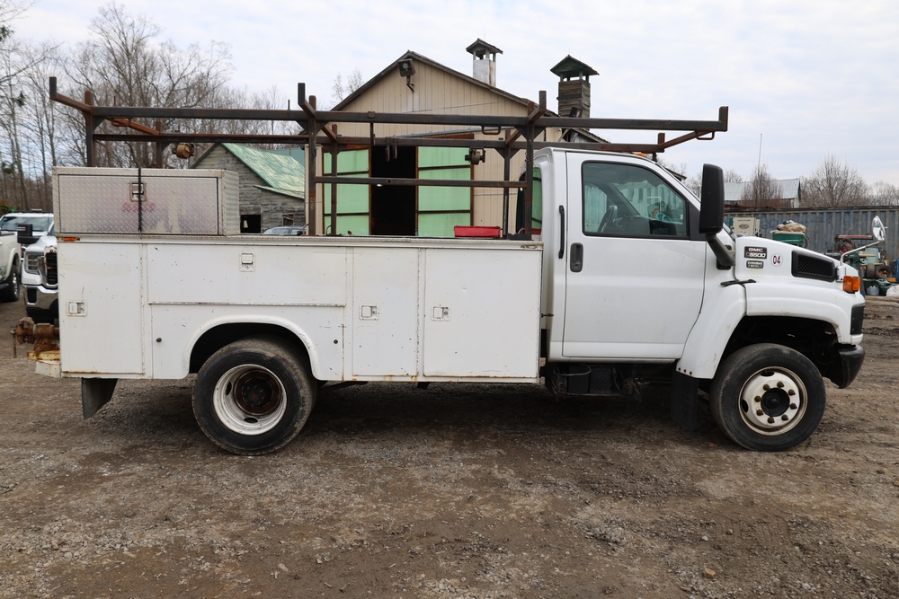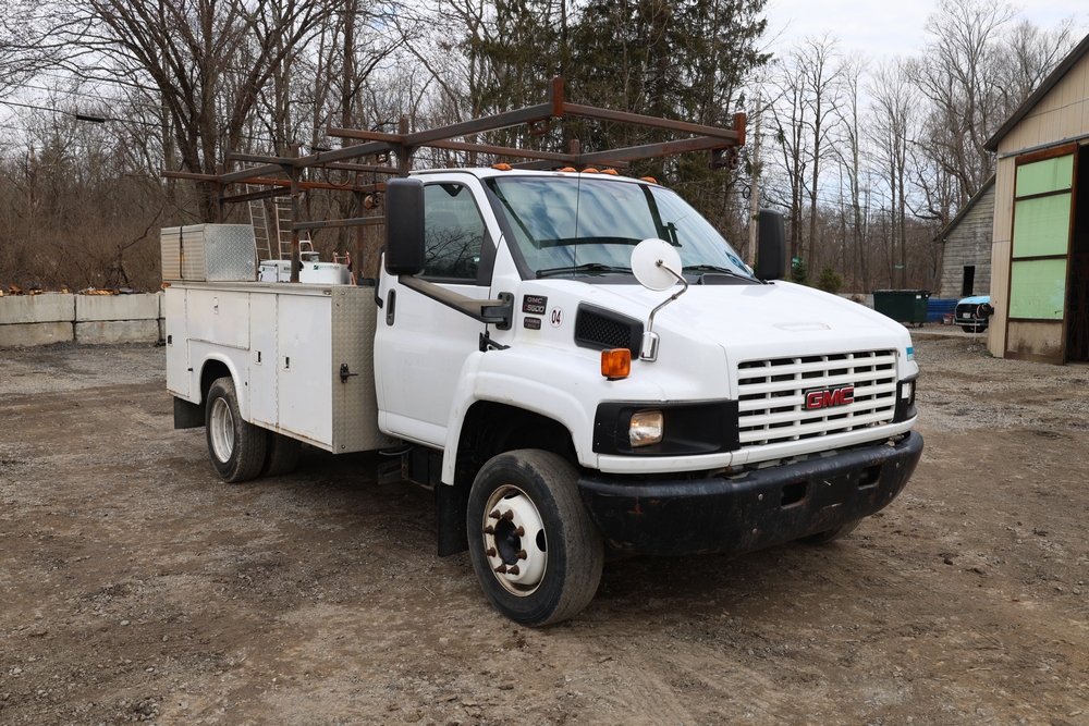 2006 GMC C5C042 service truck with a 6.6L V8 TURBO DIESEL engine. VIN: 1GDG5C1216F418943. Odometer reading: 104402. Body: chassis and cab. 4X2, service body, ladder rack, diamond plate toolbox, tow hitch receiver, Boss Industries hydraulic pump, AM/FM radio, trailer brake controller. Runs and drives. Title and key available.