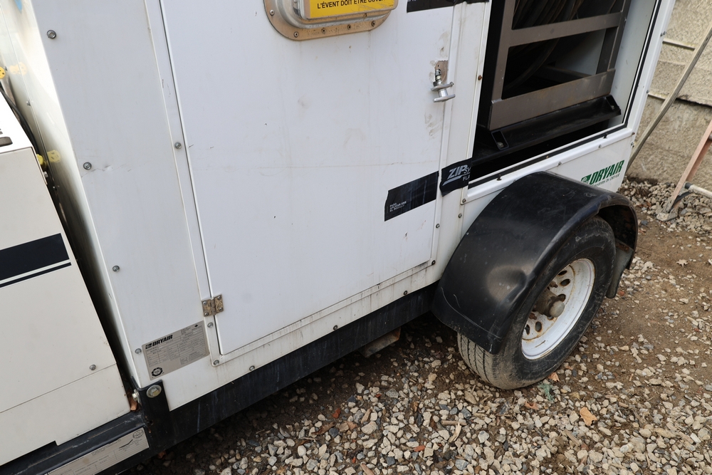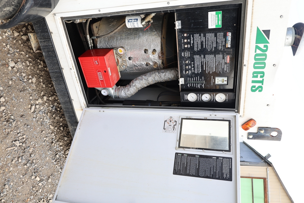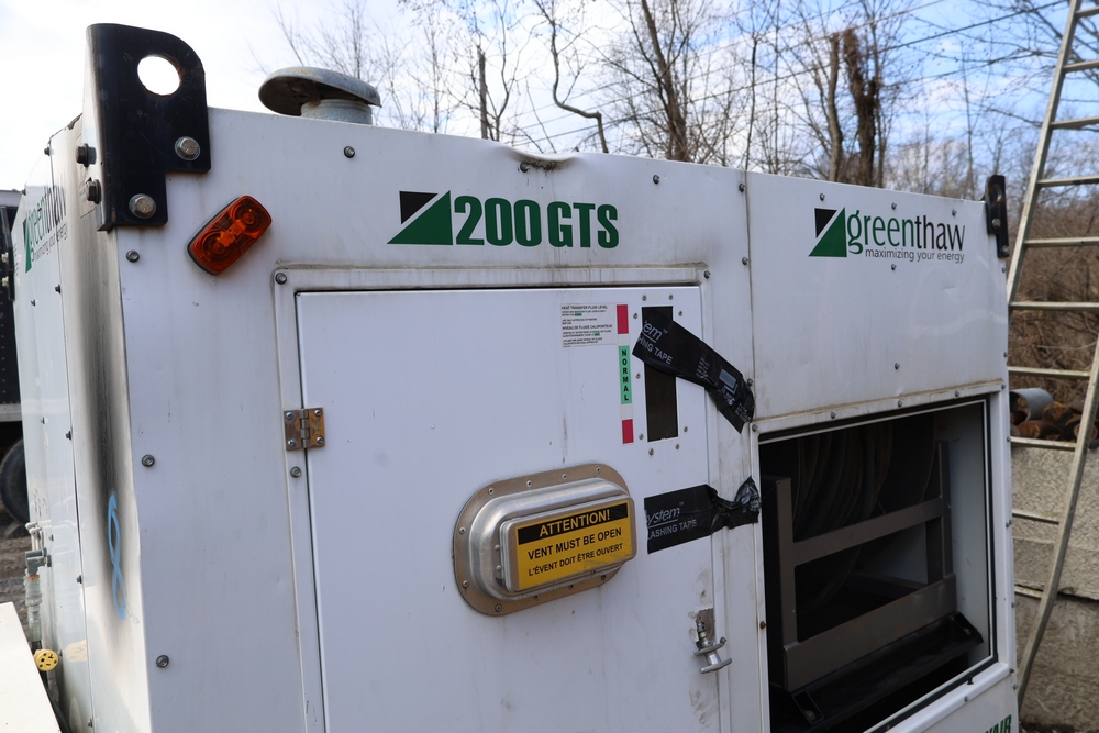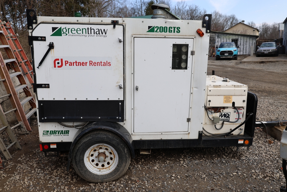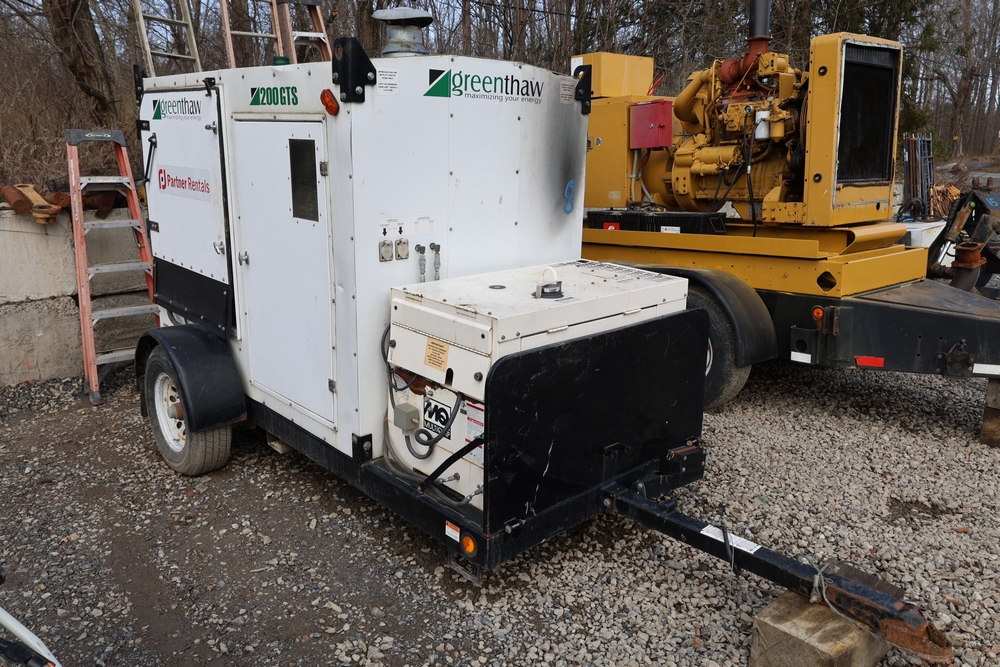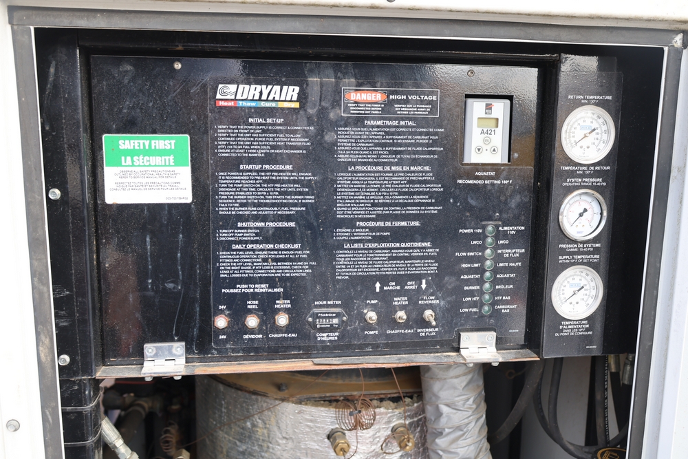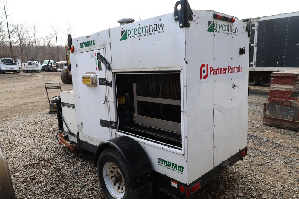 DryAir Greenthaw heat thaw unit, model 200-GTS, serial number 175701, date of manufacture January 2019, trailer mounted, VIN 2DRUS4163KS175701, GVWR 2721 kg (6000 lb.), single axle, equipped with Hannay hose reel model EP 6032-39-40-15.5 RT (serial 2712304), includes MultiQuip WhisperWatt diesel powered AC generator model DAC-7000SSA (serial 5764853), 6000 W, 120/240 V, 25 A, 60 Hz, single phase, Kubota diesel engine model Z482, hour meter reading 2368.1 hours on generator and 3961.4 hours on heat unit. Includes dual zones, 600 feet of hose per zone, reverse flow, will run on generator or outlet, produces up to 180 degree water, hot water heater fan blower heater and 100 gallon fuel capacity. Seller reports: Operational.