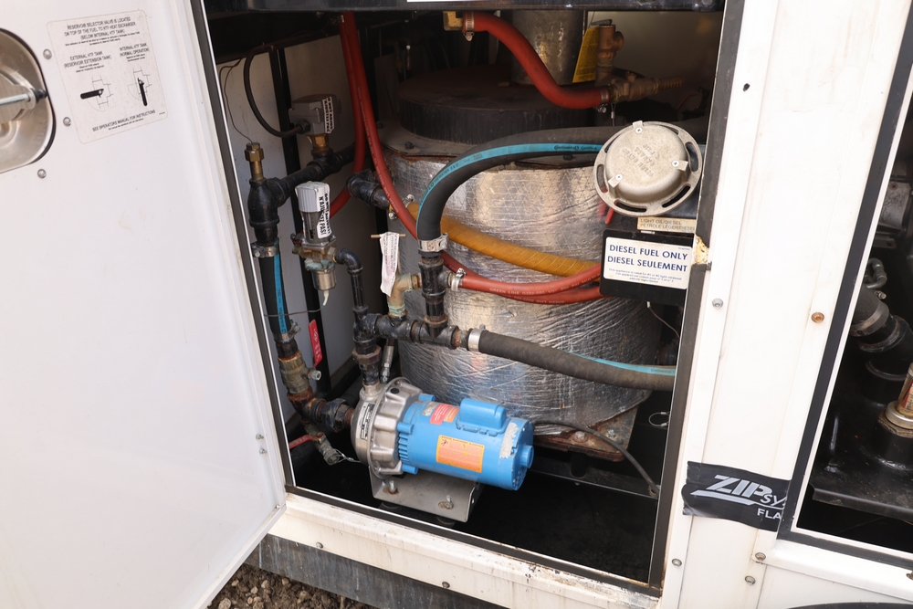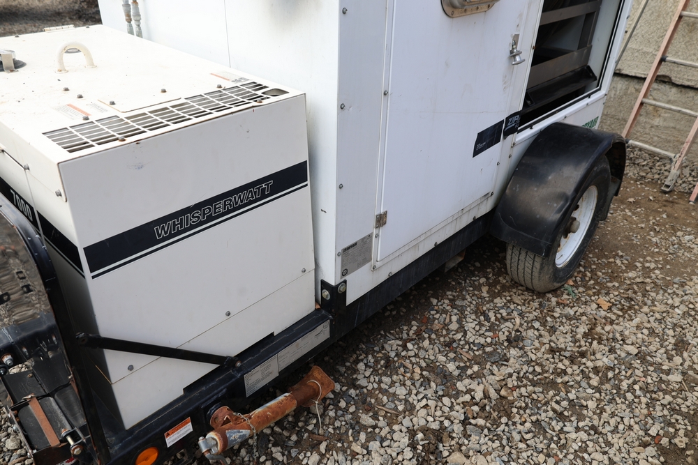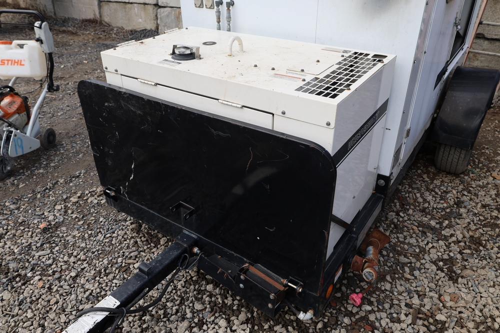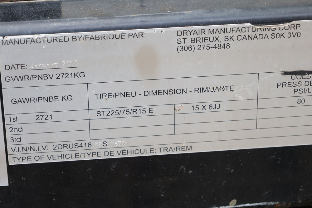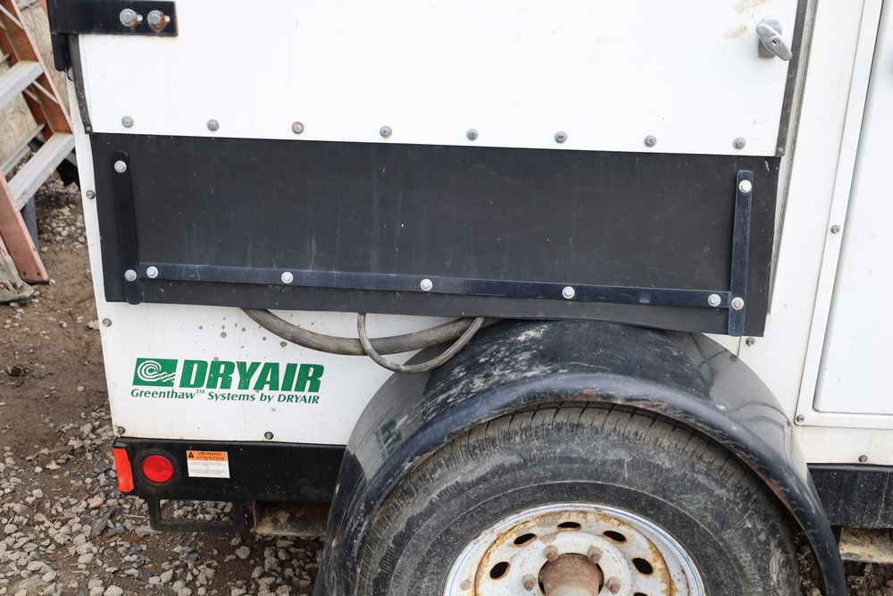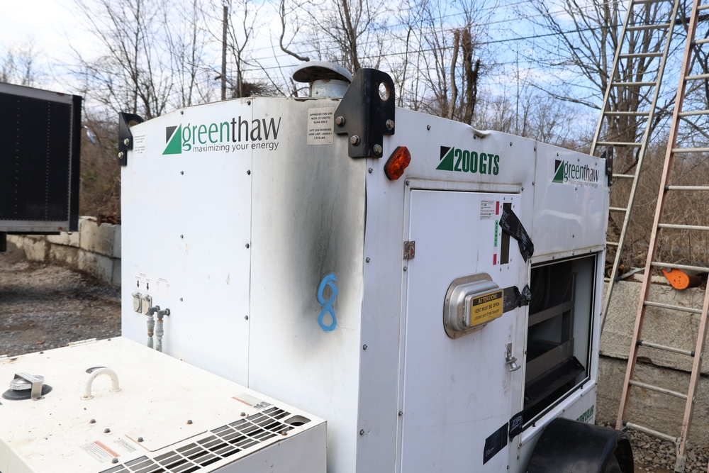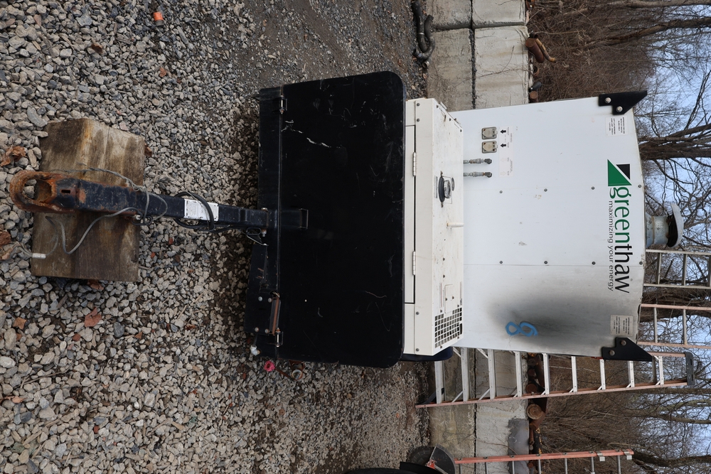 DryAir Greenthaw heat thaw unit, model 200-GTS, serial number 175701, date of manufacture January 2019, trailer mounted, VIN 2DRUS4163KS175701, GVWR 2721 kg (6000 lb.), single axle, equipped with Hannay hose reel model EP 6032-39-40-15.5 RT (serial 2712304), includes MultiQuip WhisperWatt diesel powered AC generator model DAC-7000SSA (serial 5764853), 6000 W, 120/240 V, 25 A, 60 Hz, single phase, Kubota diesel engine model Z482, hour meter reading 2368.1 hours on generator and 3961.4 hours on heat unit. Includes dual zones, 600 feet of hose per zone, reverse flow, will run on generator or outlet, produces up to 180 degree water, hot water heater fan blower heater and 100 gallon fuel capacity. Seller reports: Operational.