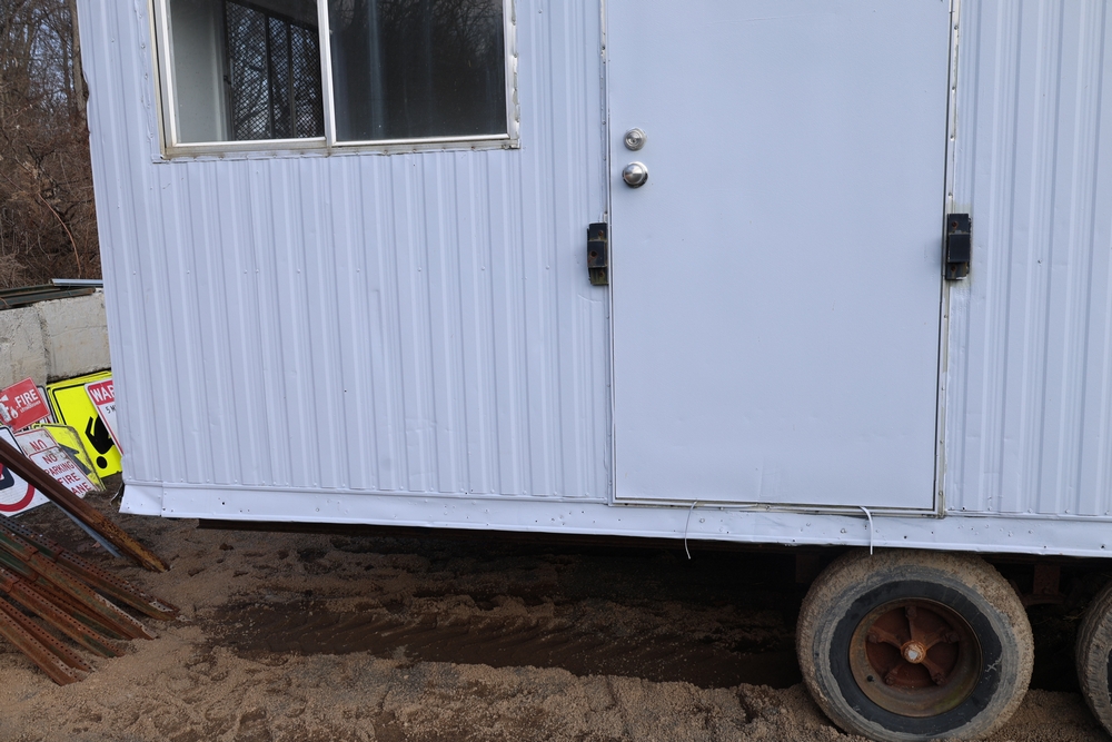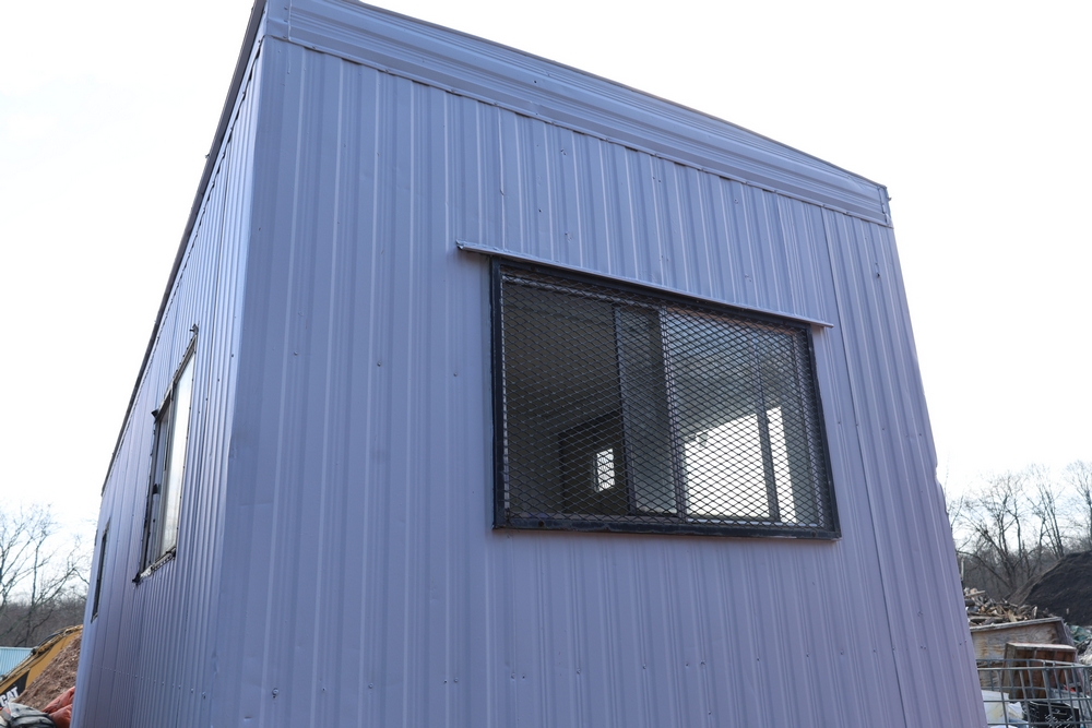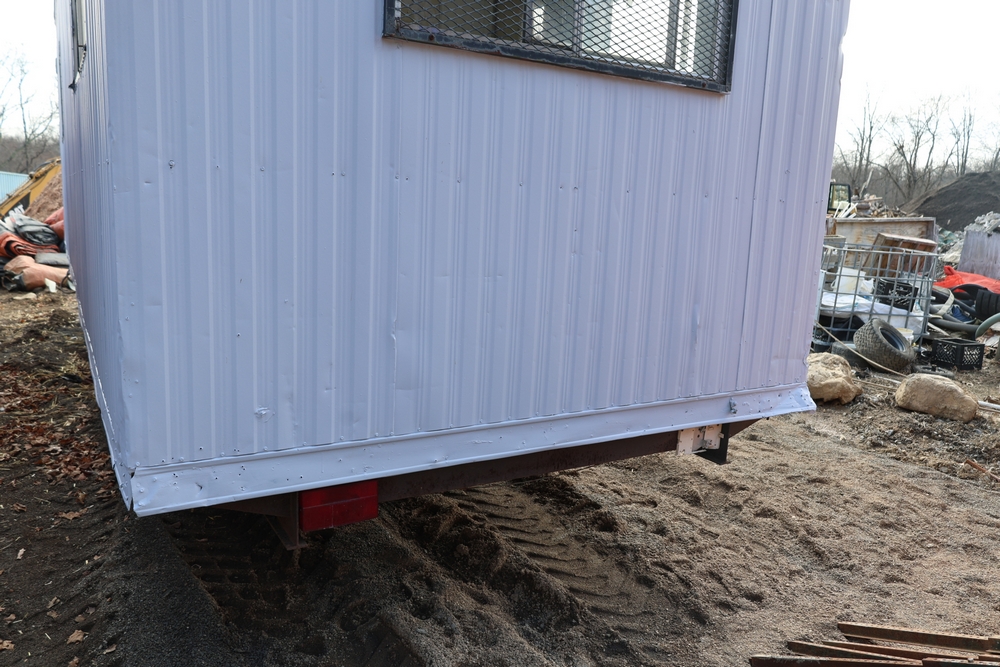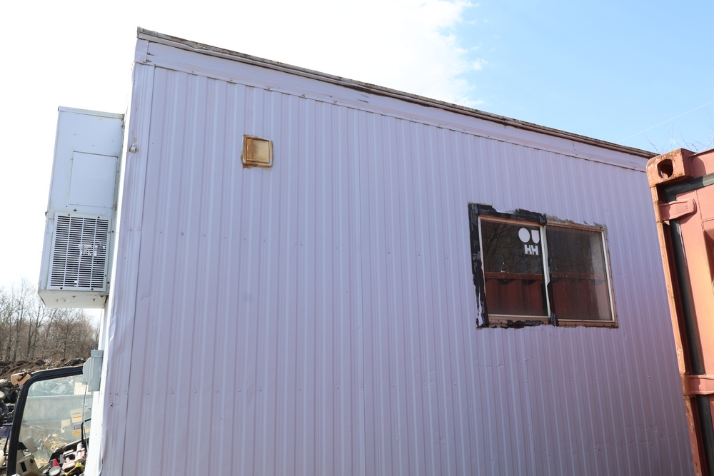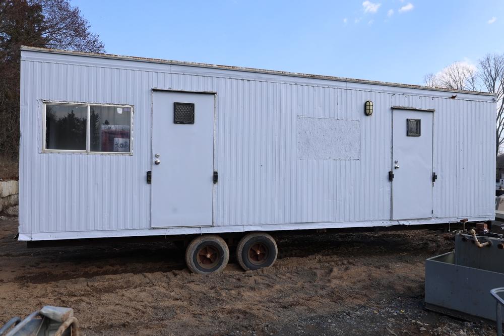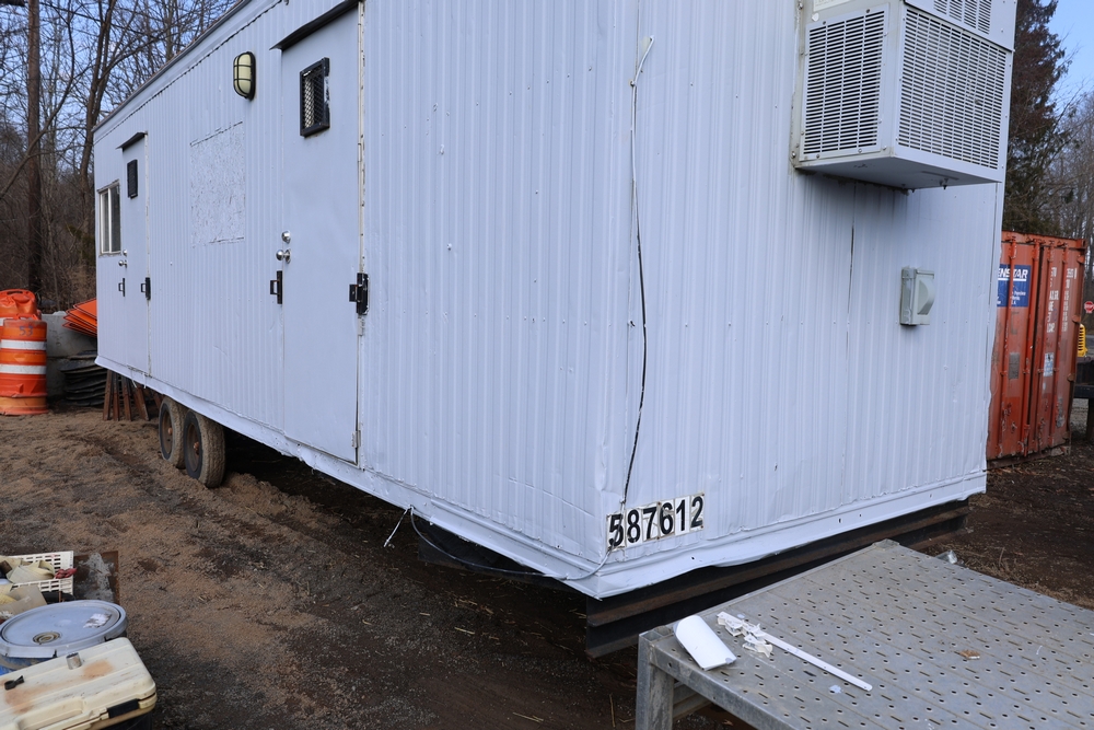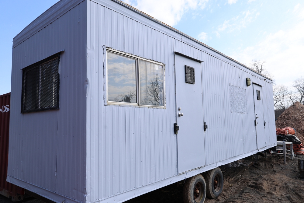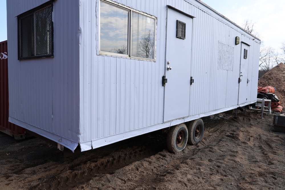 Mobile office trailer. White exterior. Tandem axle. Two entry doors. Multiple windows with exterior security bars. Wall-mounted air conditioning unit. Interior includes fluorescent lighting, electrical panel, outlets, and wall-mounted shelving. Includes metal entry steps/platform. Bill of sale only.