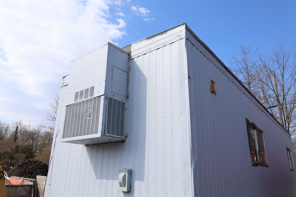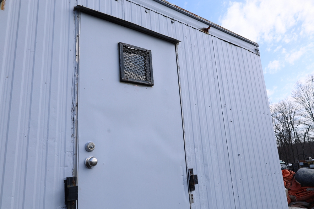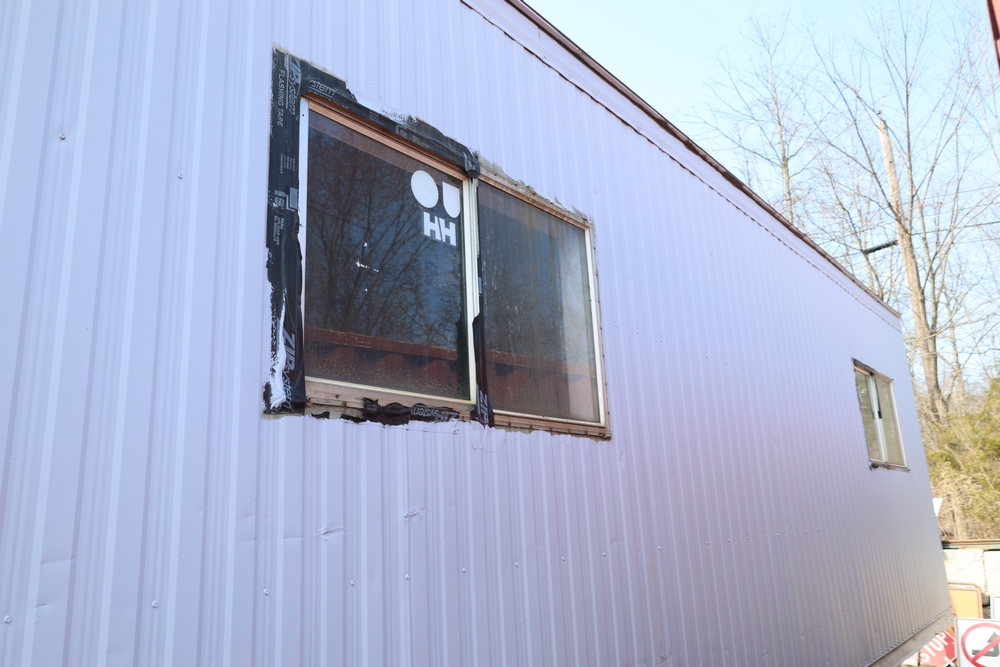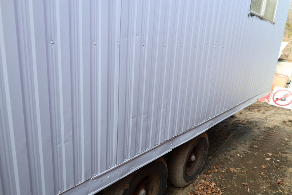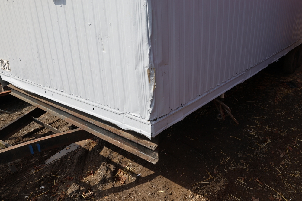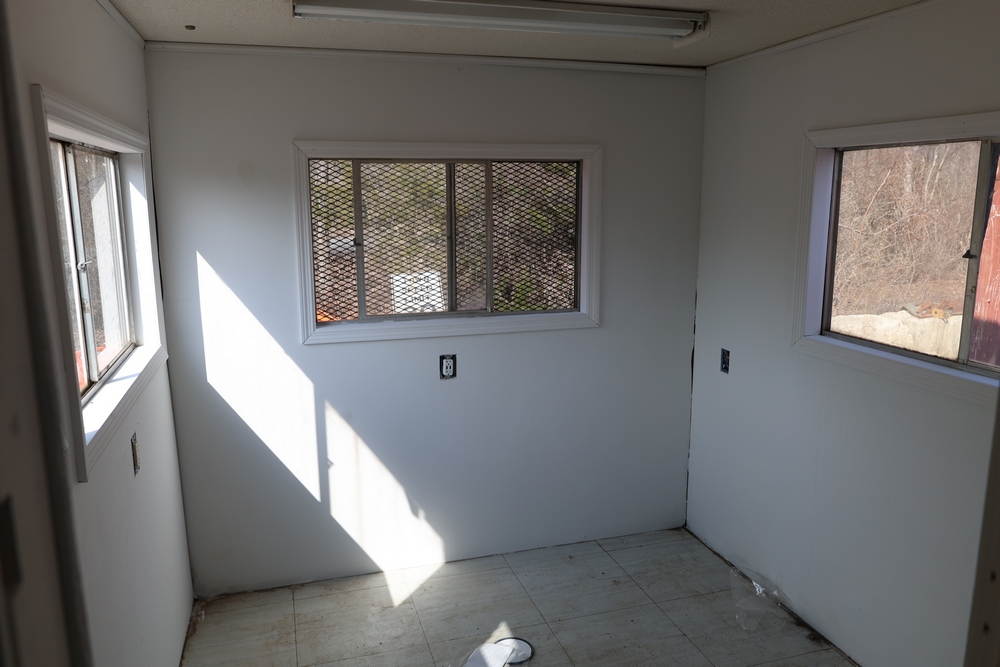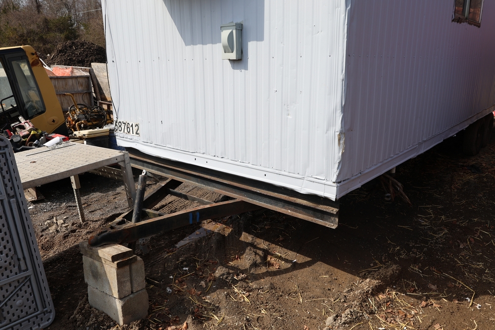 Mobile office trailer. White exterior. Tandem axle. Two entry doors. Multiple windows with exterior security bars. Wall-mounted air conditioning unit. Interior includes fluorescent lighting, electrical panel, outlets, and wall-mounted shelving. Includes metal entry steps/platform. Bill of sale only.
