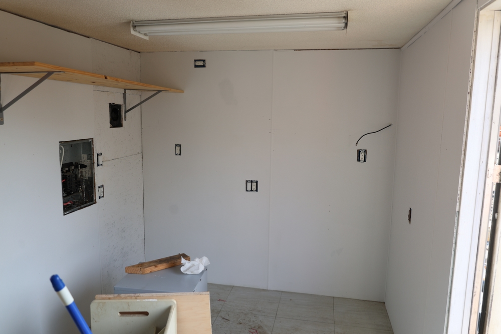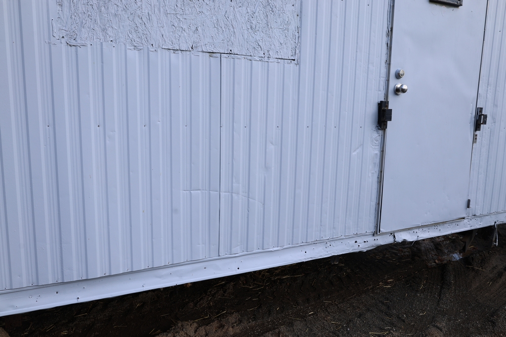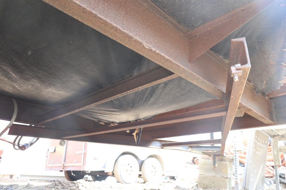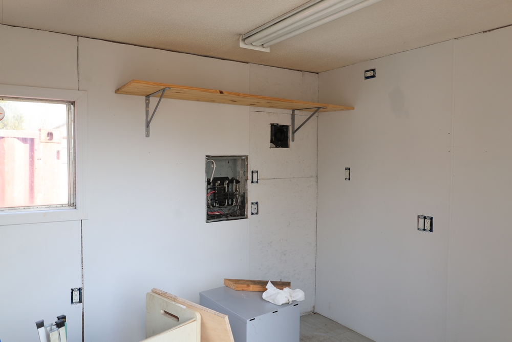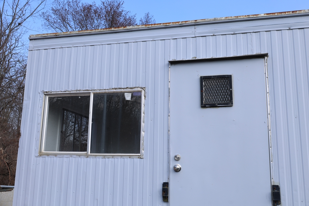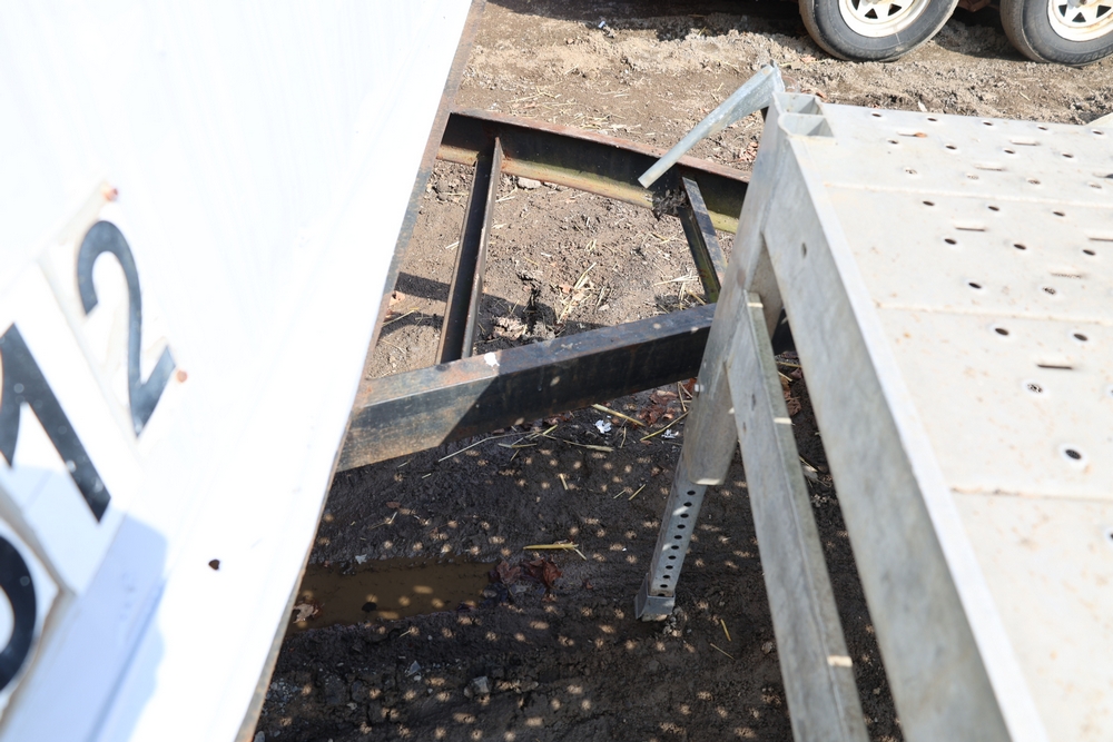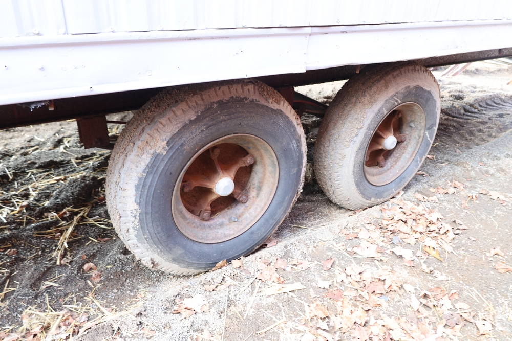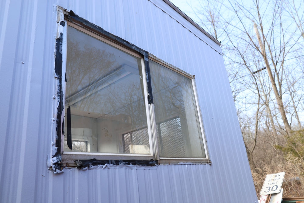 Mobile office trailer. White exterior. Tandem axle. Two entry doors. Multiple windows with exterior security bars. Wall-mounted air conditioning unit. Interior includes fluorescent lighting, electrical panel, outlets, and wall-mounted shelving. Includes metal entry steps/platform. Bill of sale only.
