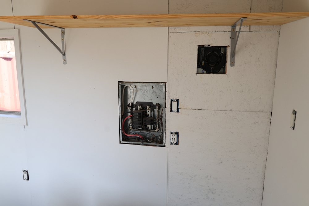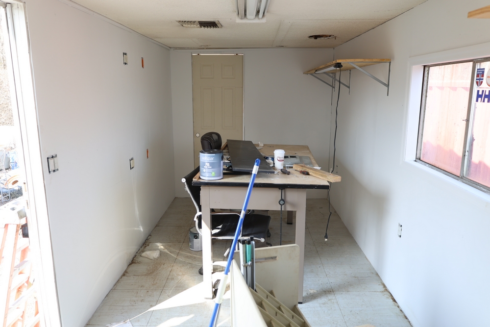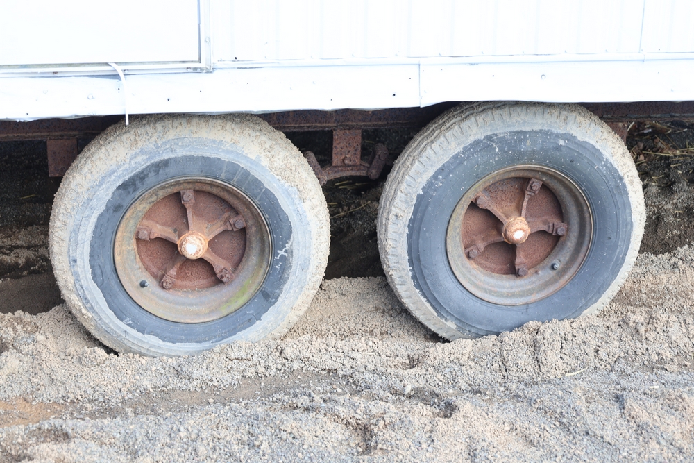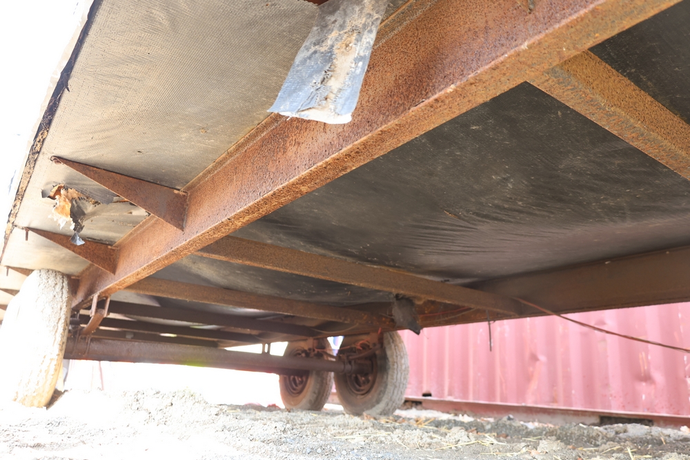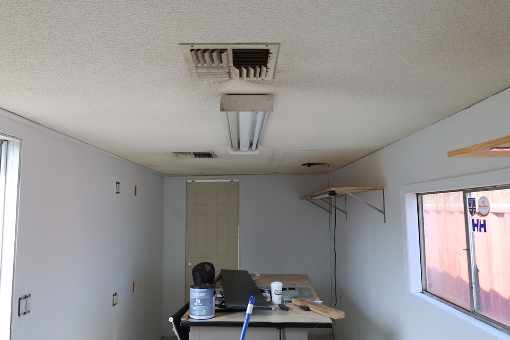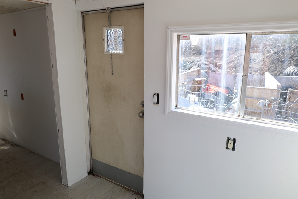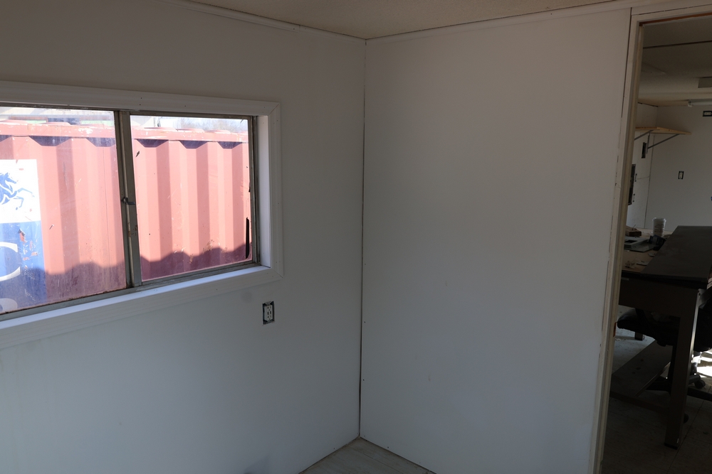Mobile office trailer. White exterior. Tandem axle. Two entry doors. Multiple windows with exterior security bars. Wall-mounted air conditioning unit. Interior includes fluorescent lighting, electrical panel, outlets, and wall-mounted shelving. Includes metal entry steps/platform. Bill of sale only.