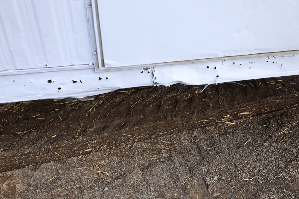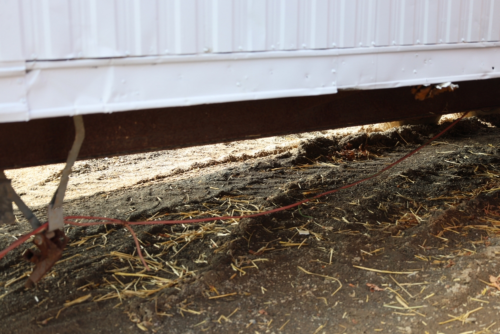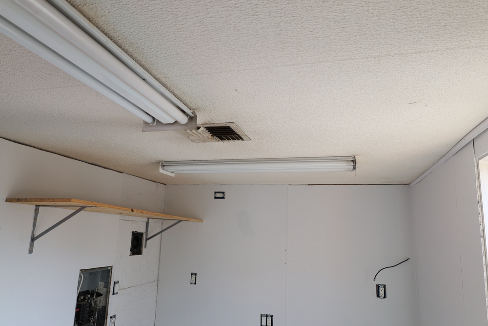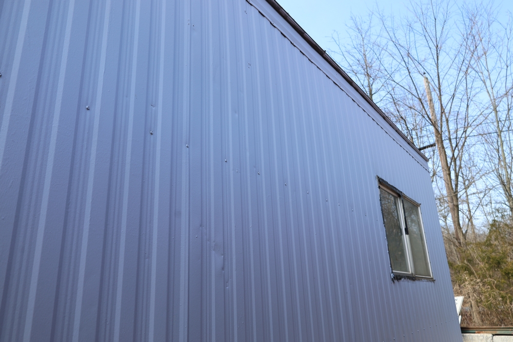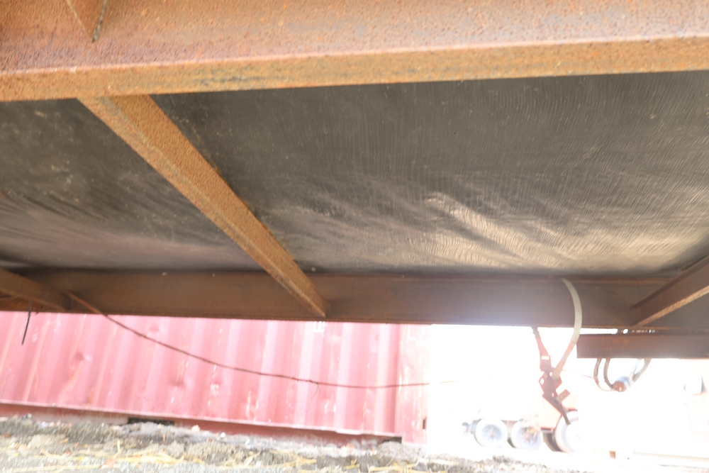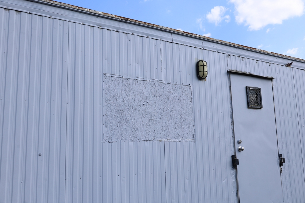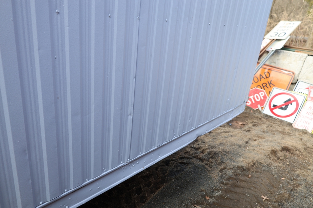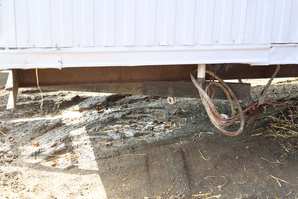 Mobile office trailer. White exterior. Tandem axle. Two entry doors. Multiple windows with exterior security bars. Wall-mounted air conditioning unit. Interior includes fluorescent lighting, electrical panel, outlets, and wall-mounted shelving. Includes metal entry steps/platform. Bill of sale only.