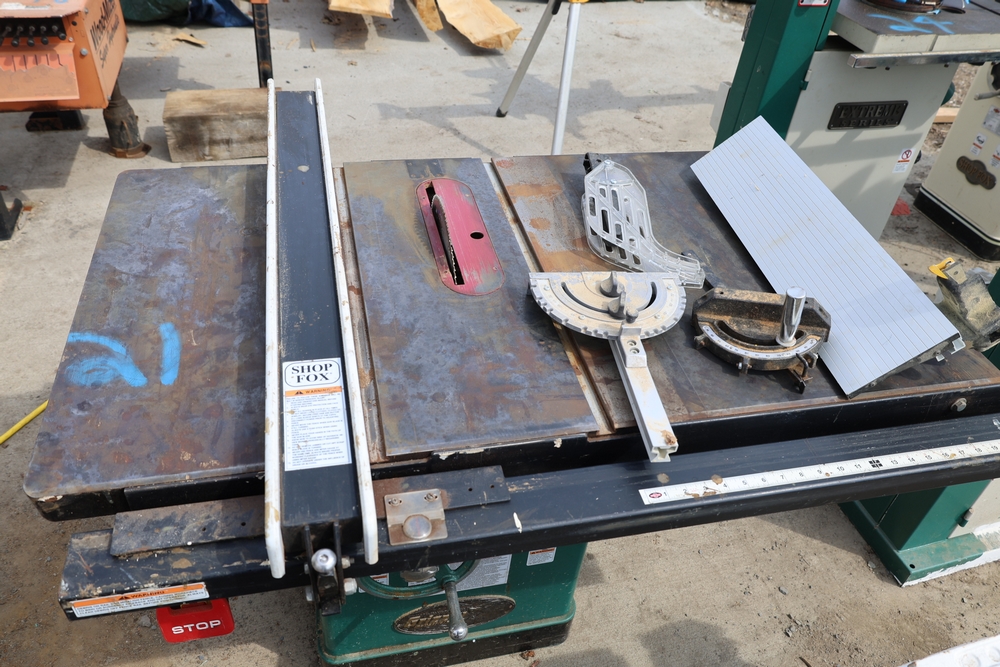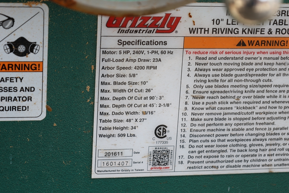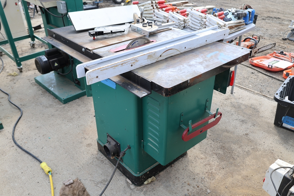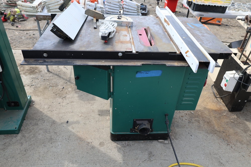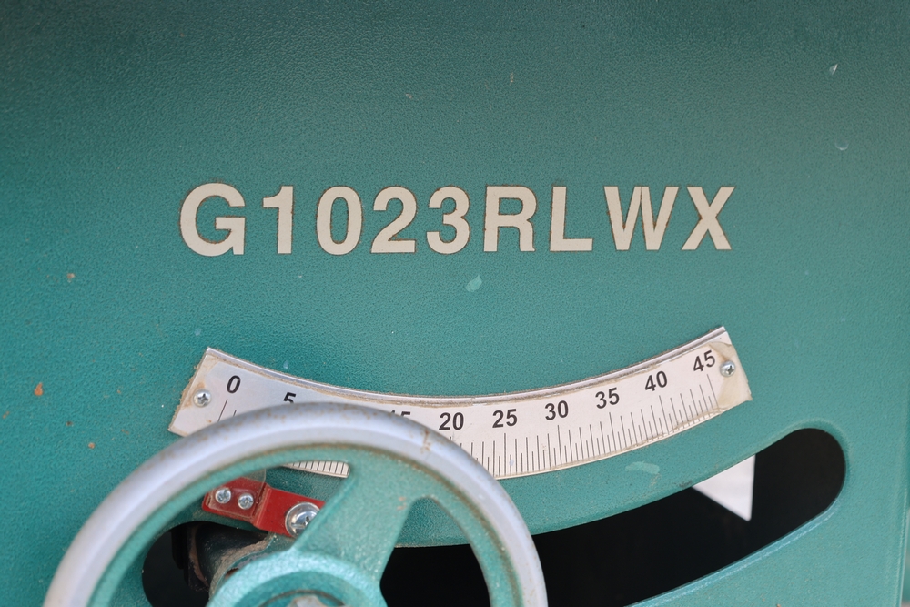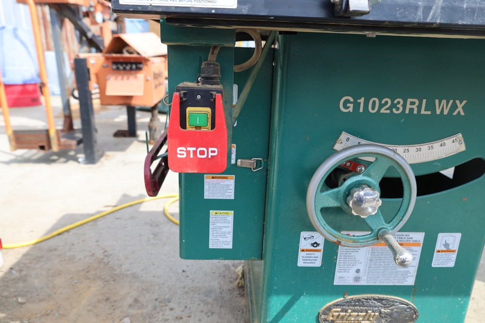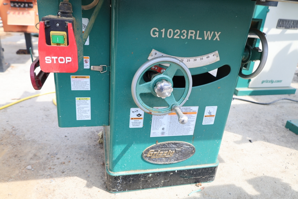 Grizzly Industrial G1023RLWX table saw with fence, miter gauge, and additional table components.