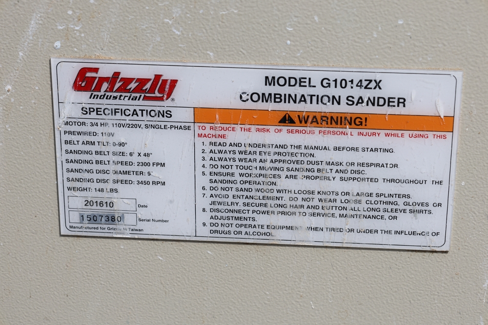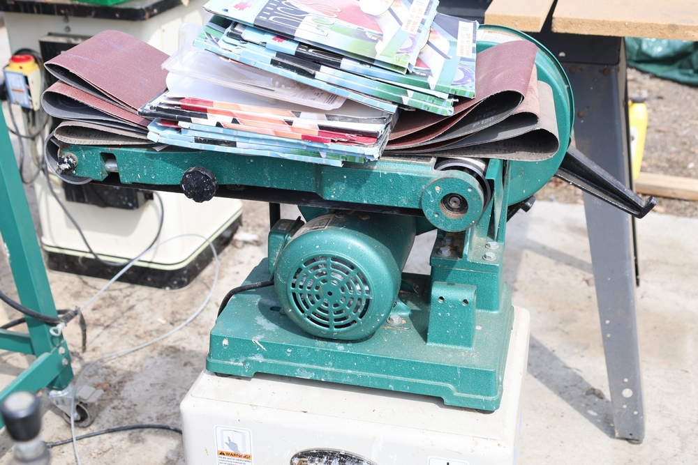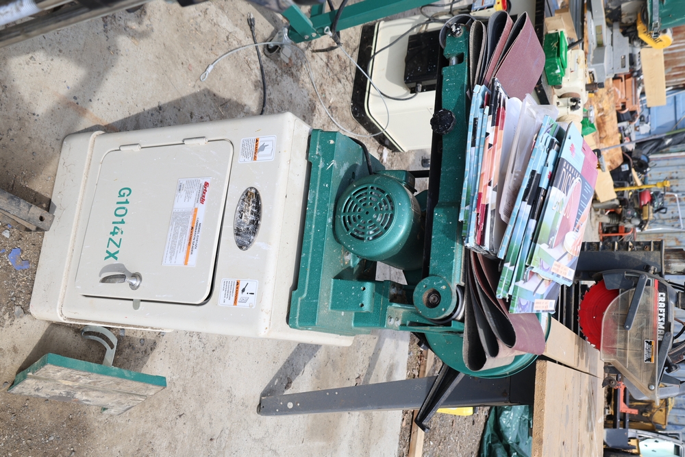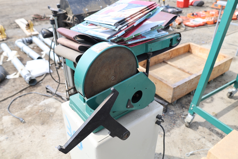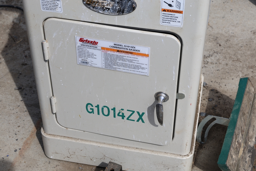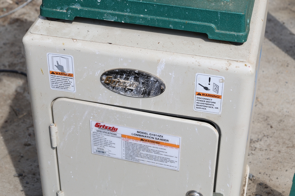Grizzly G1014ZX combination sander with cabinet base, includes sanding belts and sanding discs.