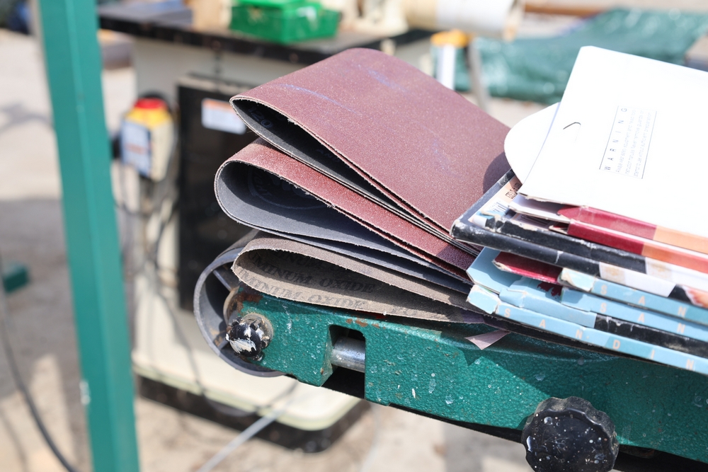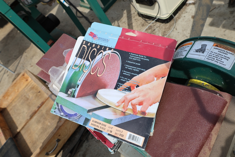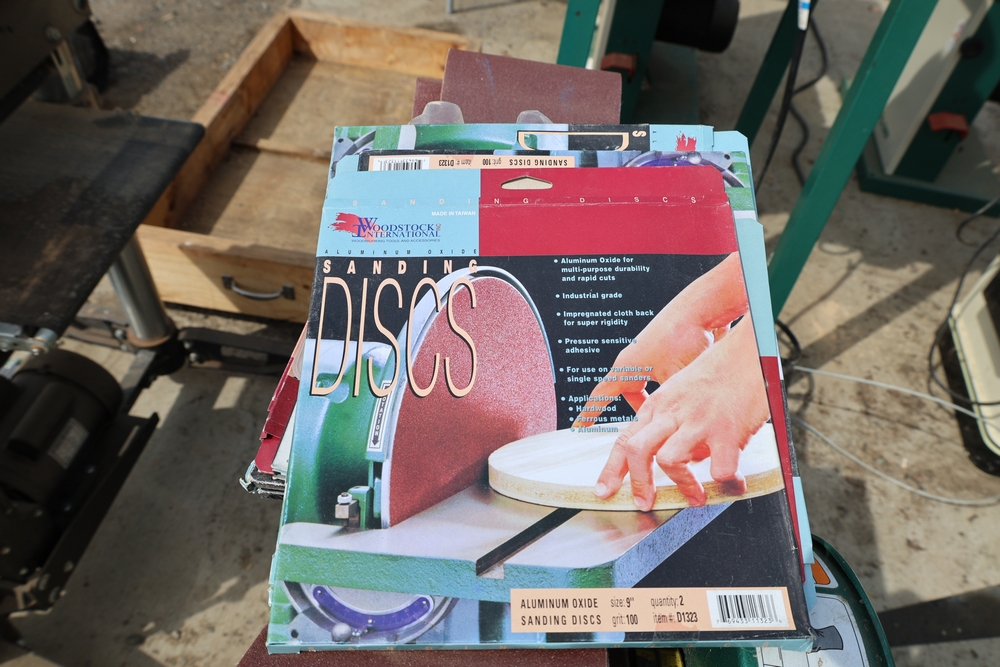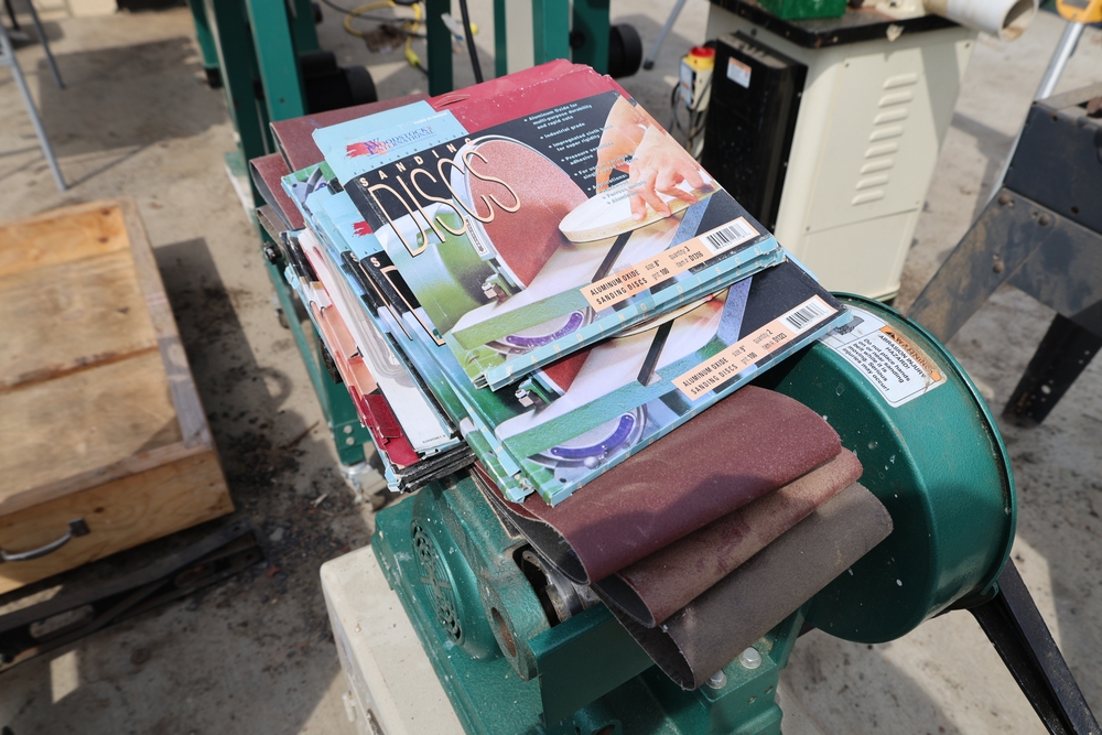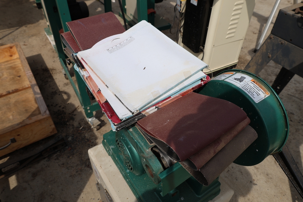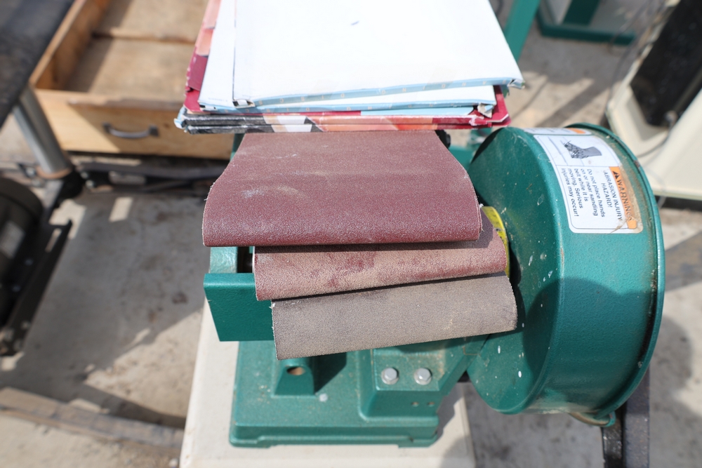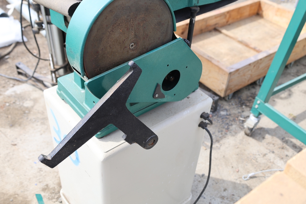 Grizzly G1014ZX combination sander with cabinet base, includes sanding belts and sanding discs.