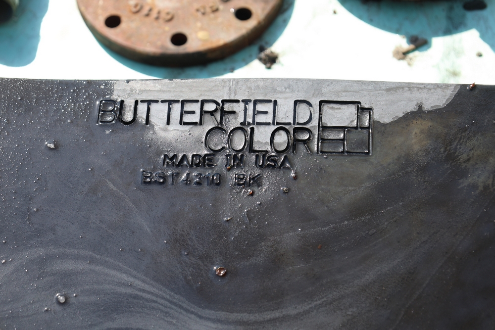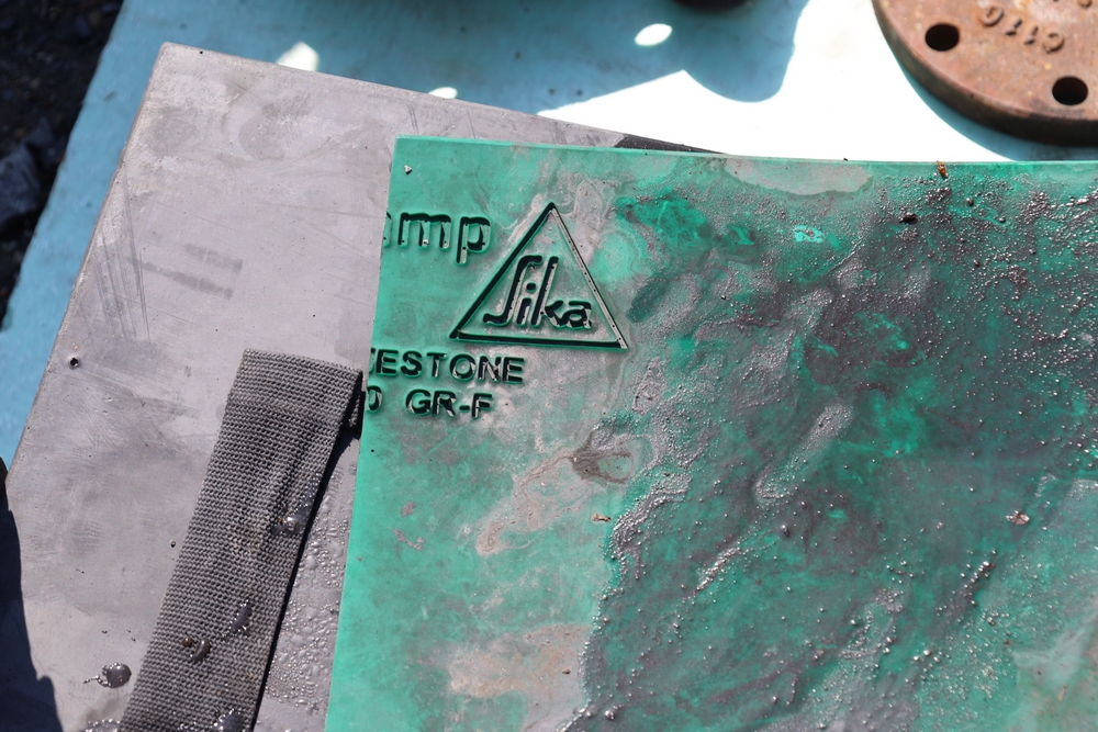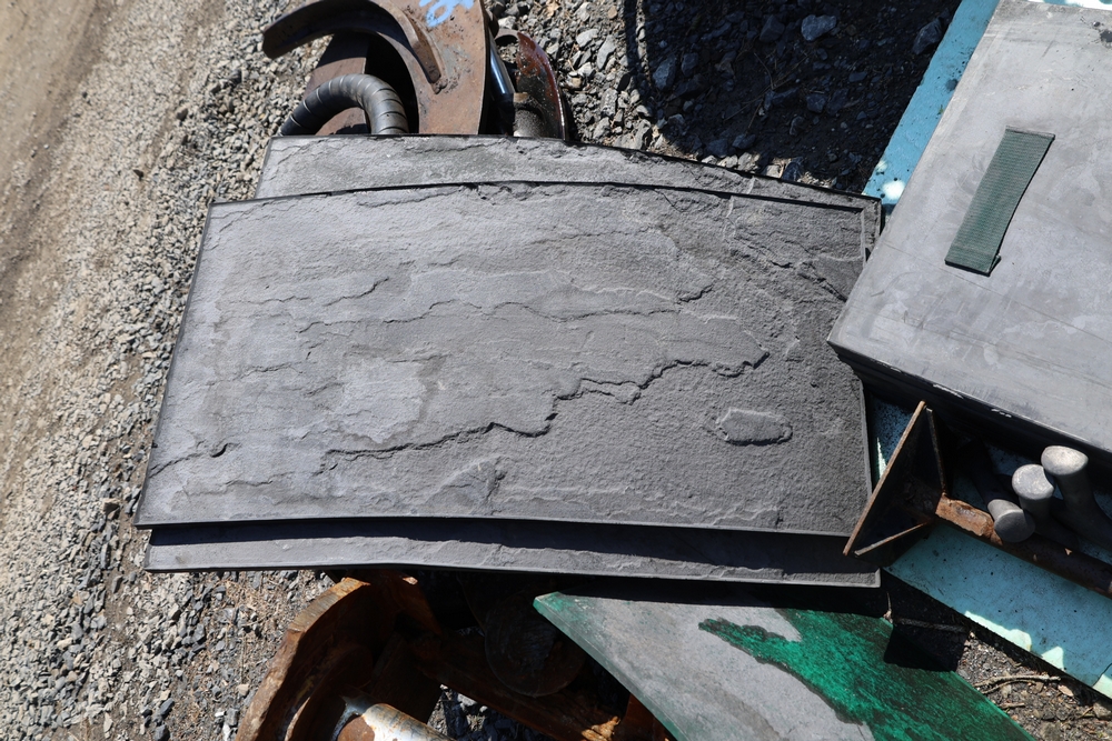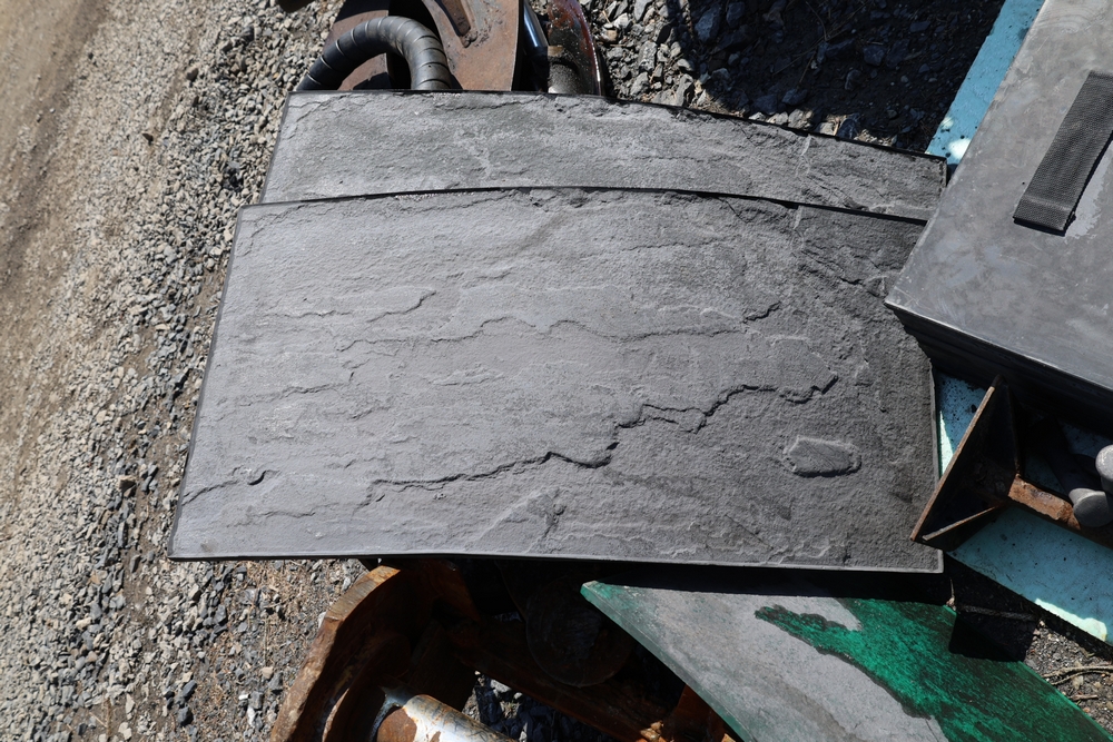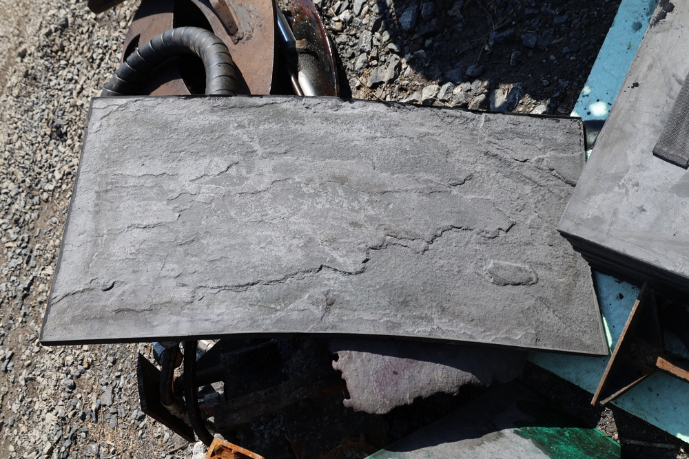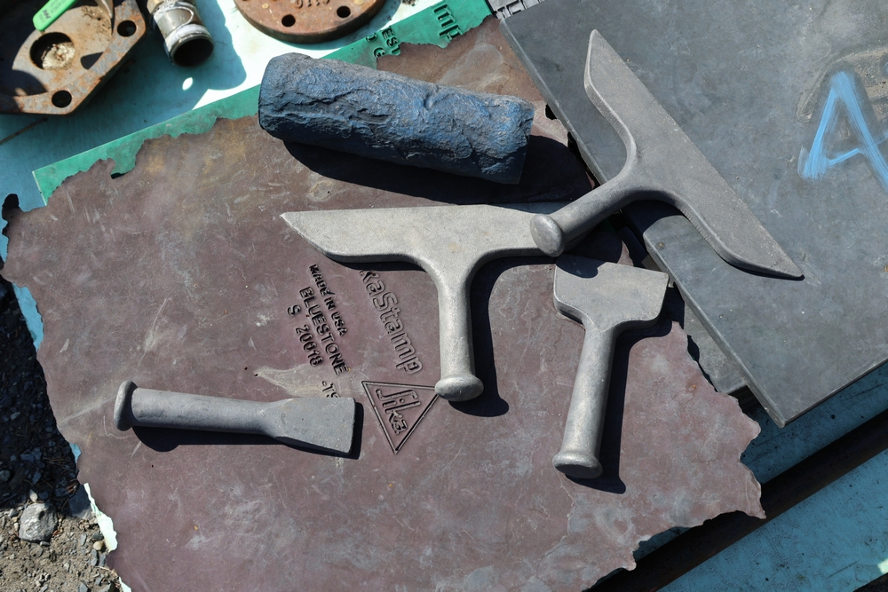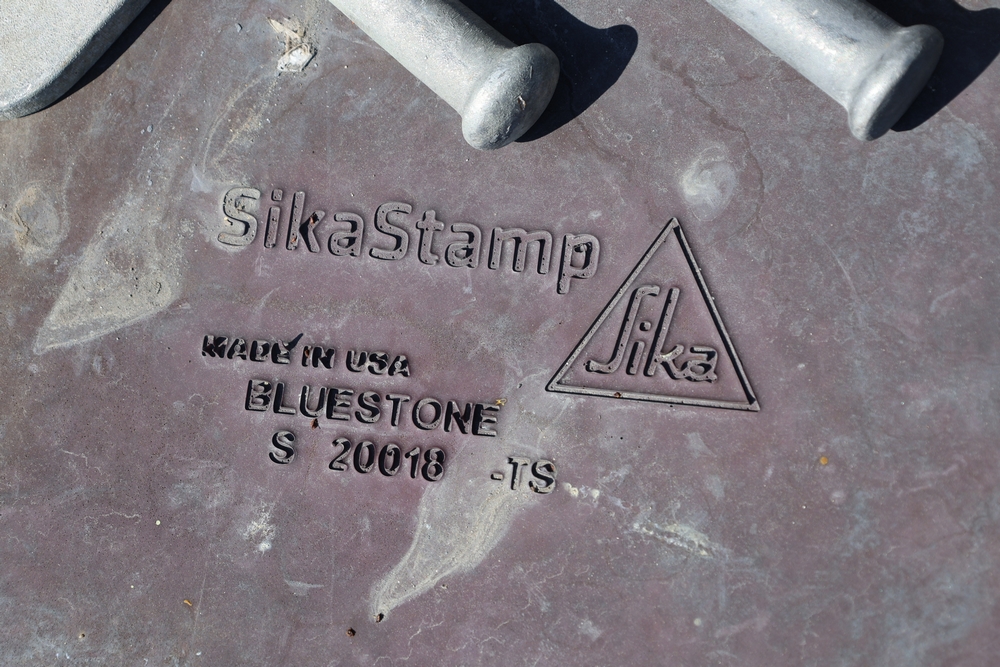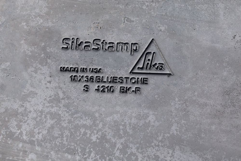 SikaStamp and Butterfield Color "Large Bluestone" concrete stamping mats with hand tools.