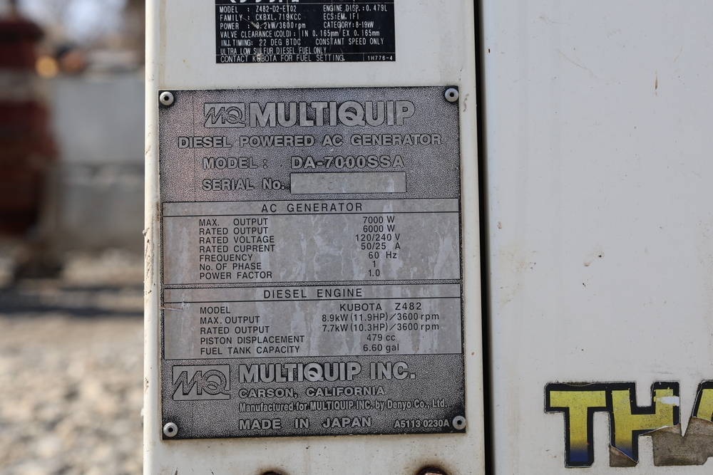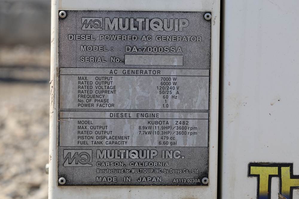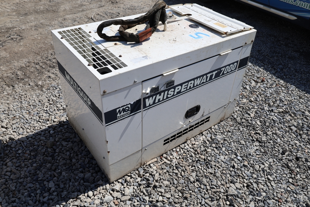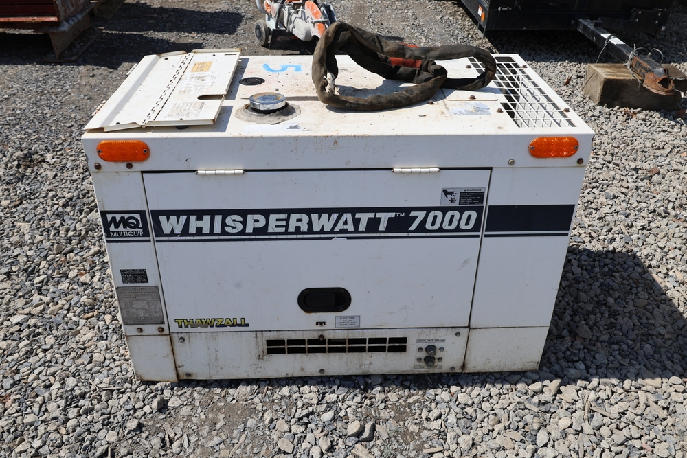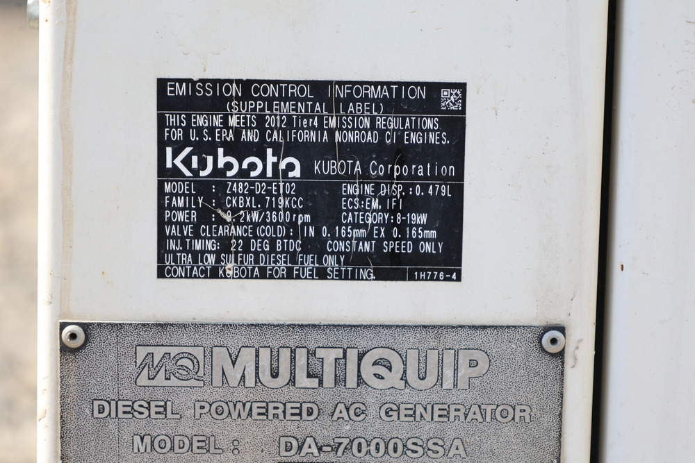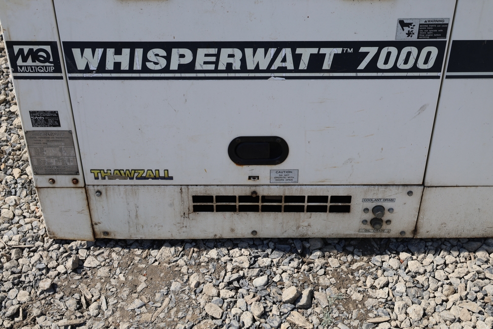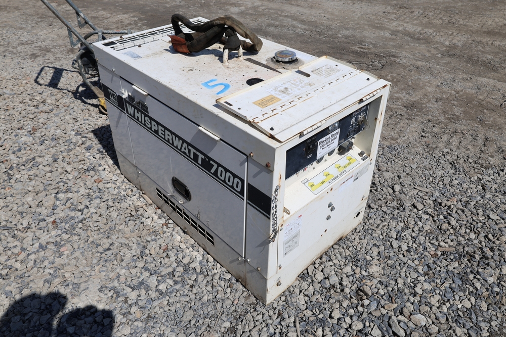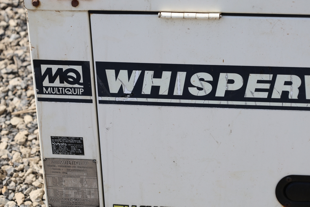 Multiquip Whisperwatt 7000 diesel powered generator, model DA-7000SSA, Kubota Z482 engine, 120/240V, 7000W max output, hour meter reads 5725 hours.
