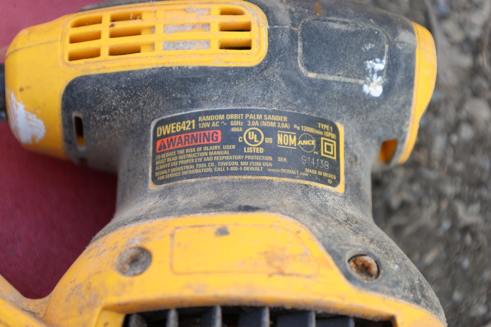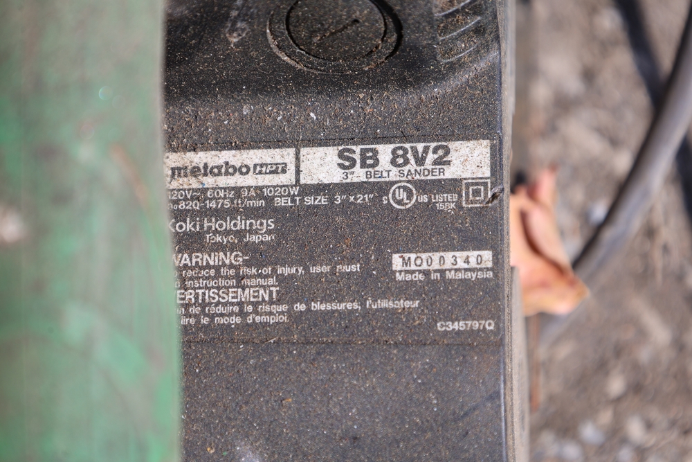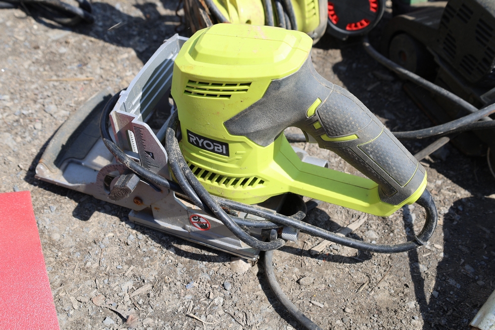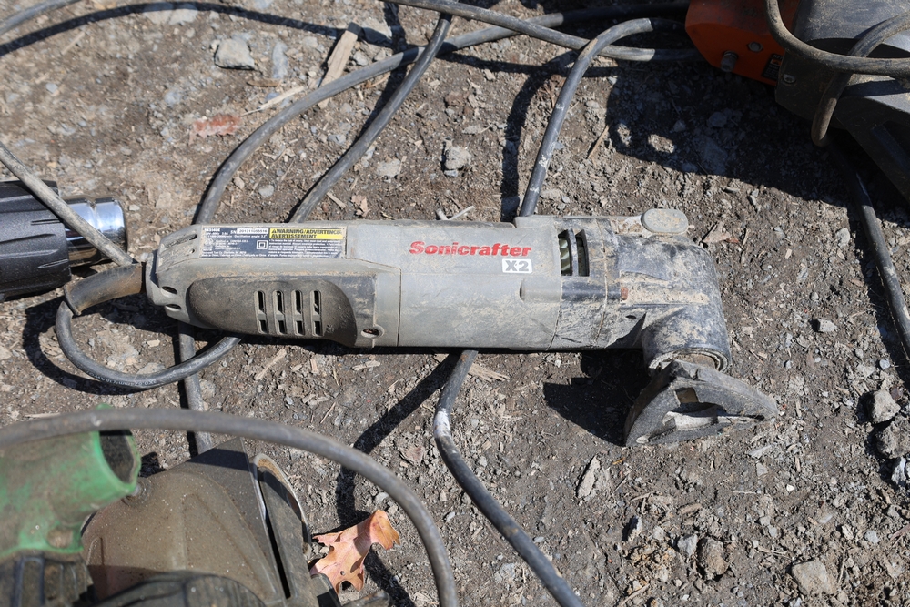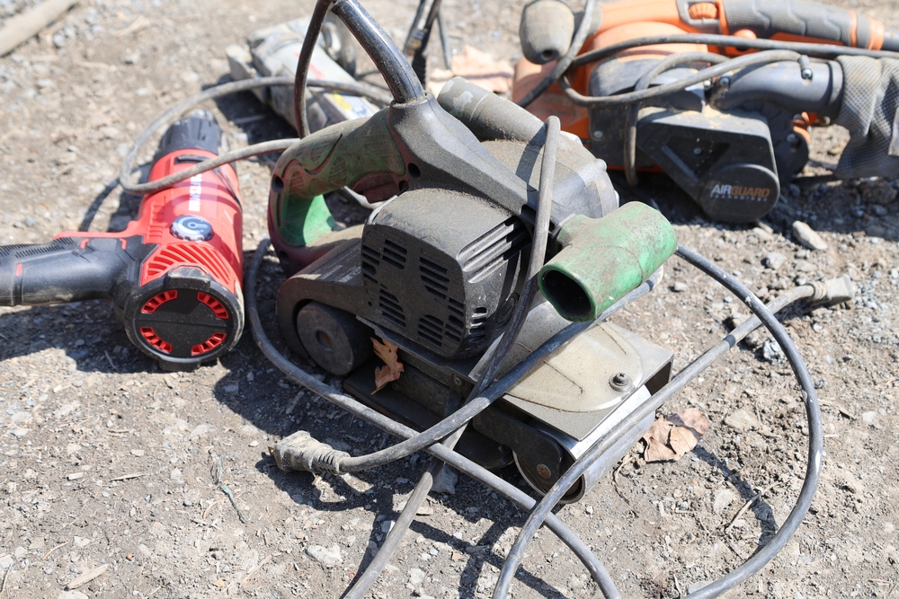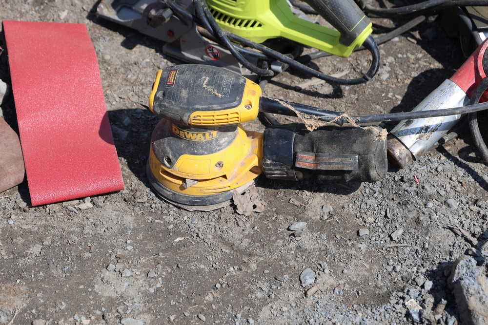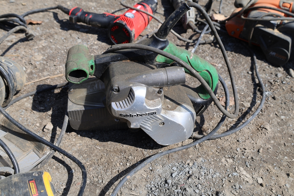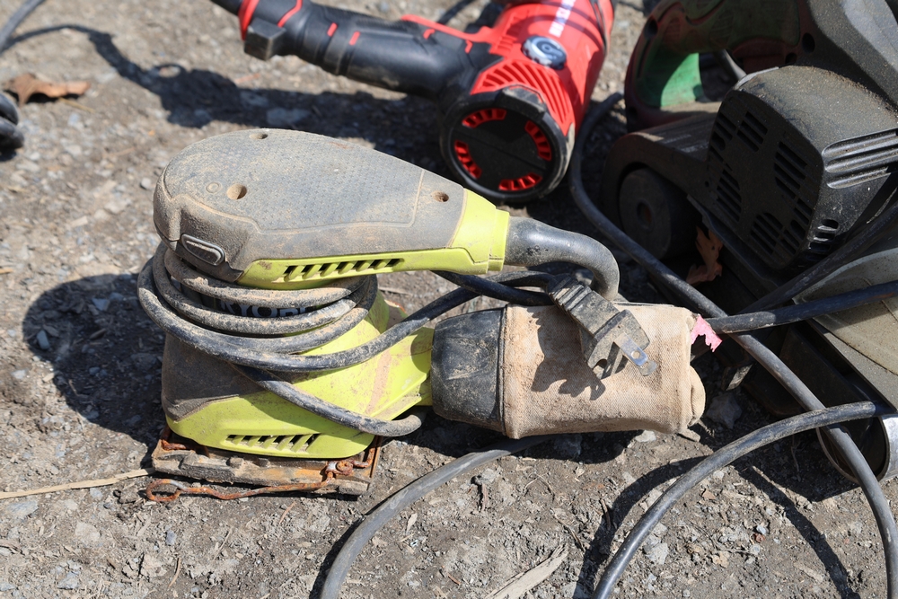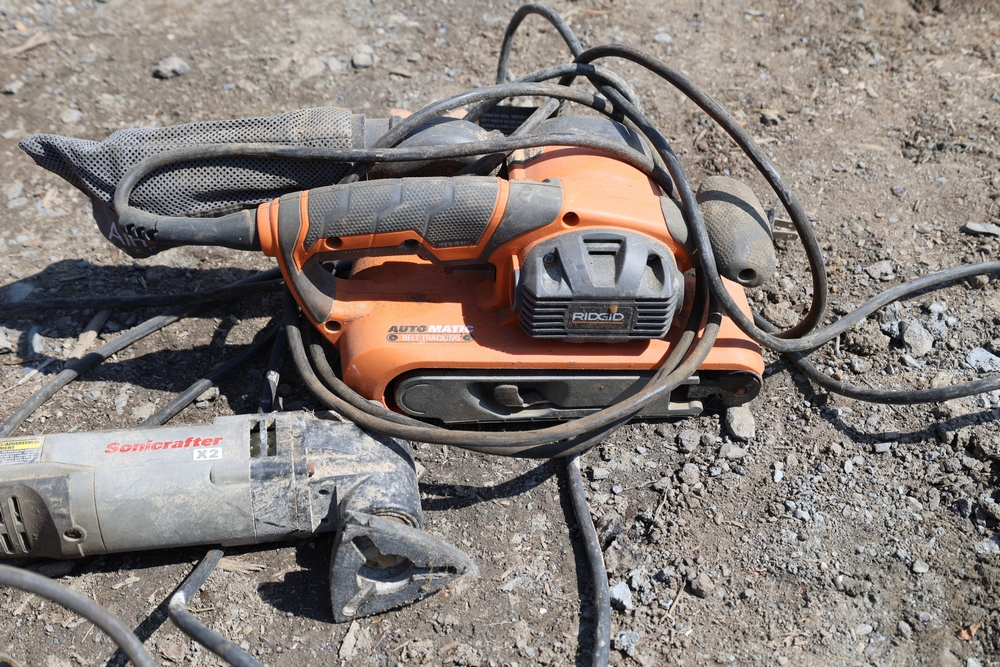 Assorted power tools including DeWalt DWE6421 random orbit sander, Ryobi S652DG 1/4 sheet sander, MHT Products 750 heat gun, Craftsman CMEE531 heat gun, Metabo HPT SB 8V2 belt sander, Sonicrafter X2 oscillating tool, Ridgid belt sander, and additional sanding belts.
