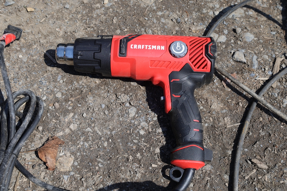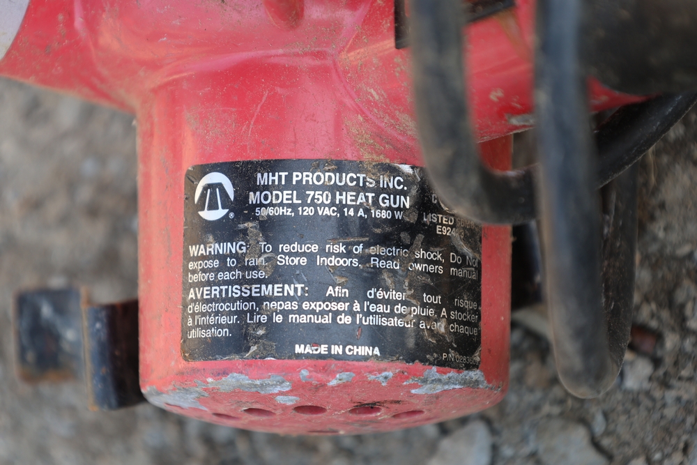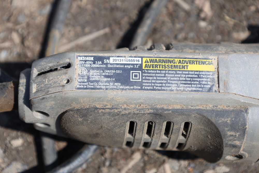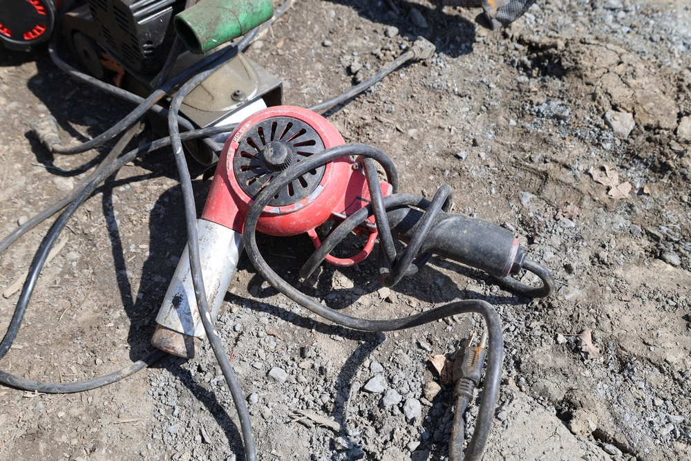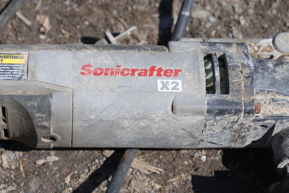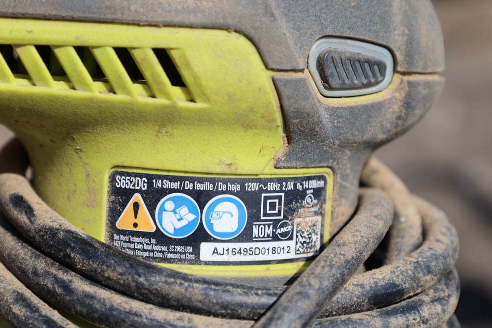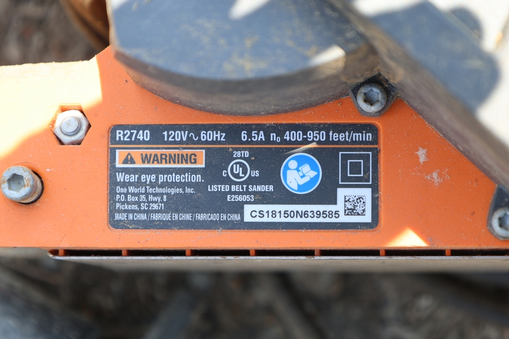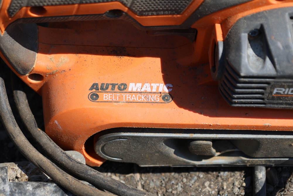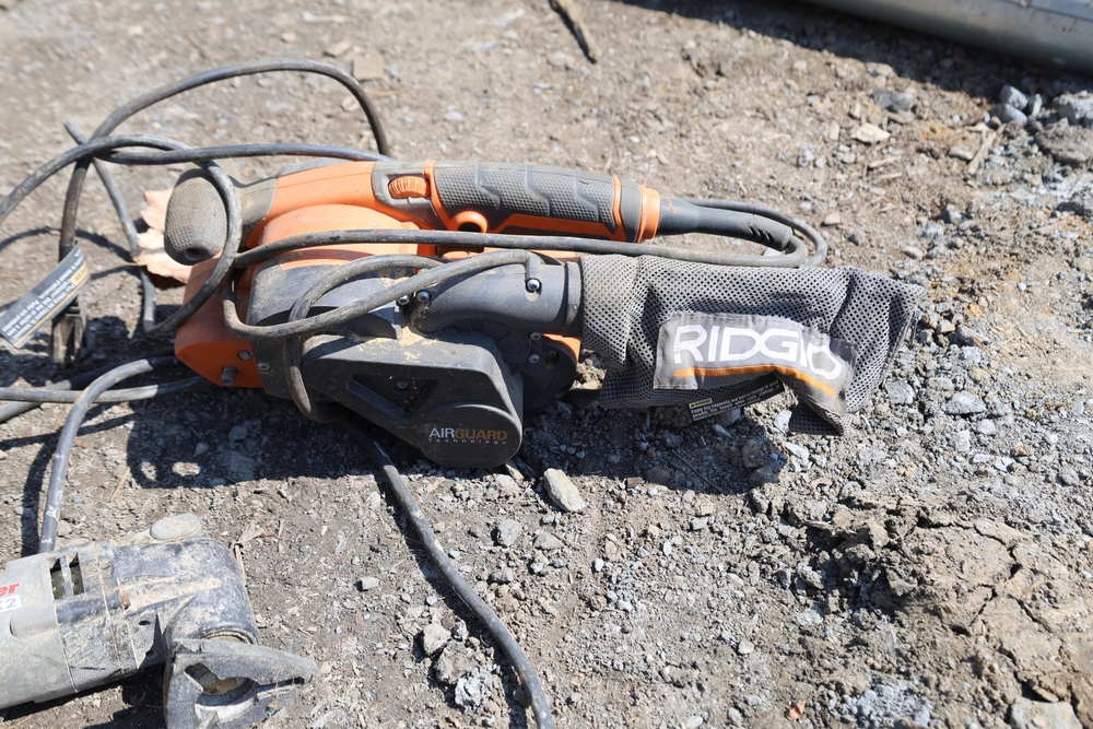 Assorted power tools including DeWalt DWE6421 random orbit sander, Ryobi S652DG 1/4 sheet sander, MHT Products 750 heat gun, Craftsman CMEE531 heat gun, Metabo HPT SB 8V2 belt sander, Sonicrafter X2 oscillating tool, Ridgid belt sander, and additional sanding belts.