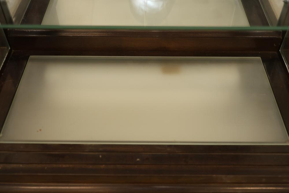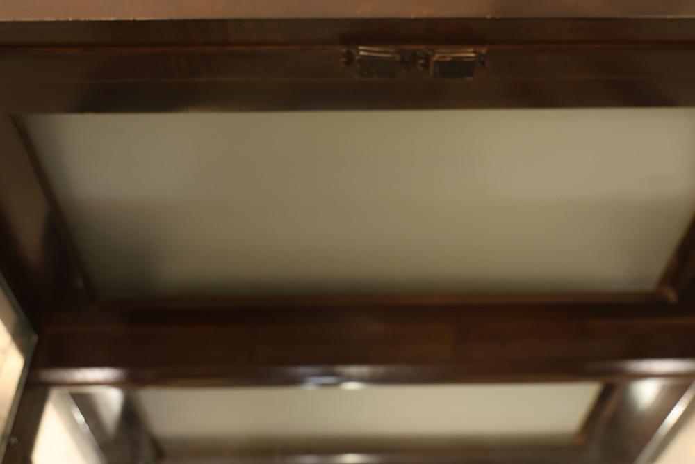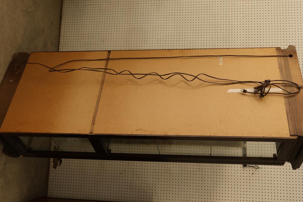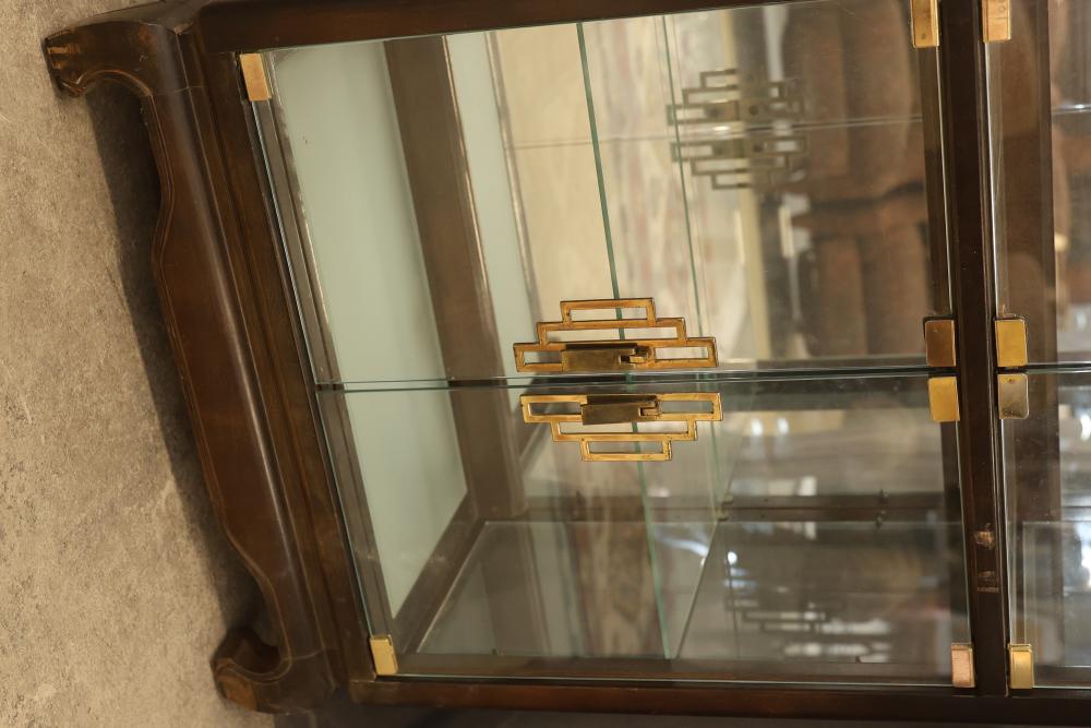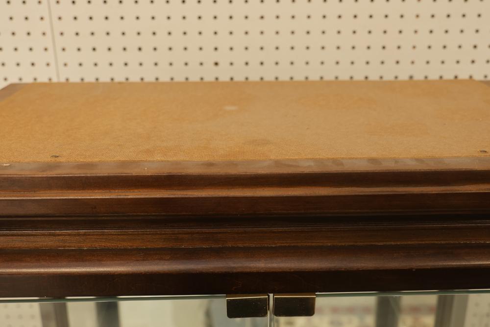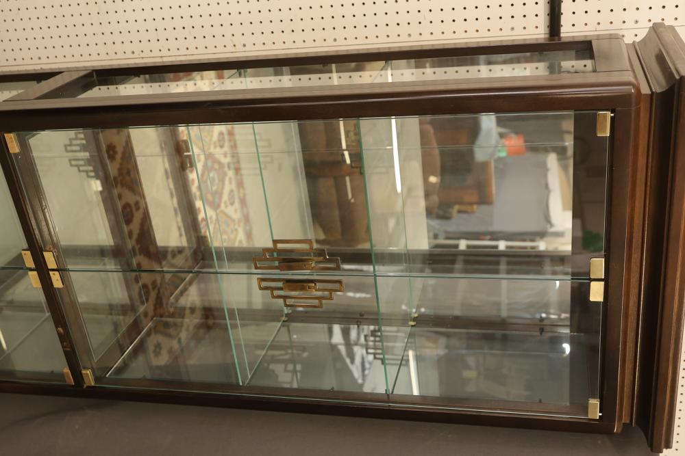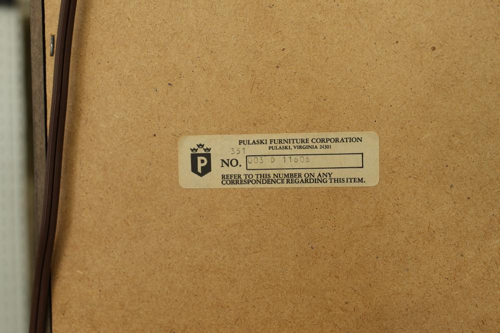 Pulaski Furniture Corporation Mirrored-Back Display Cabinet with Interior Lighting and 5 Removable Glass Shelves. Measures approximately 79.5 inches high, 27.5 inches wide, and 14.25 inches deep. Features glass panel doors, brass-finished pulls, and electrical cord for lighting. Pickup only.