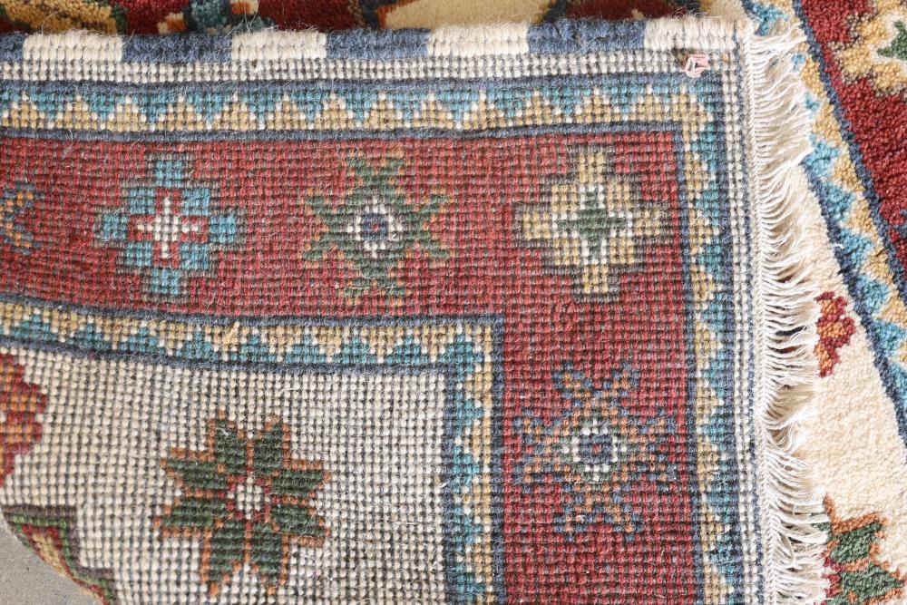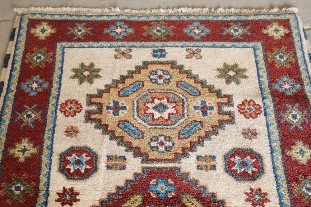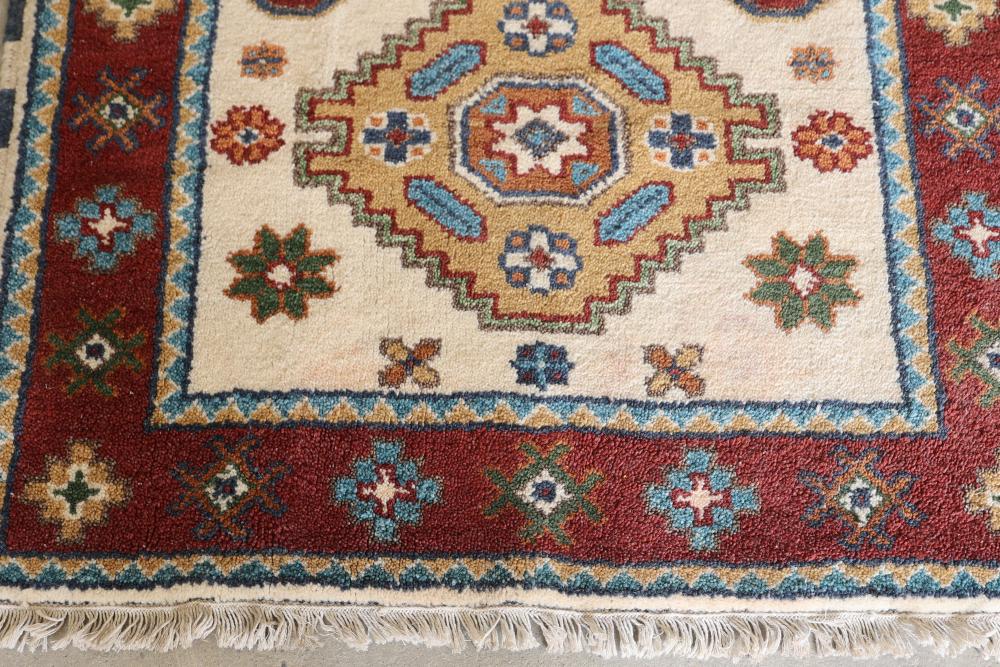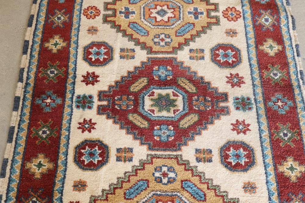 Handmade rug with Kazak design, approximately 60 inches long by 36 inches wide. Features intricate geometric and floral patterns in vibrant hues, accented with fringed edges.