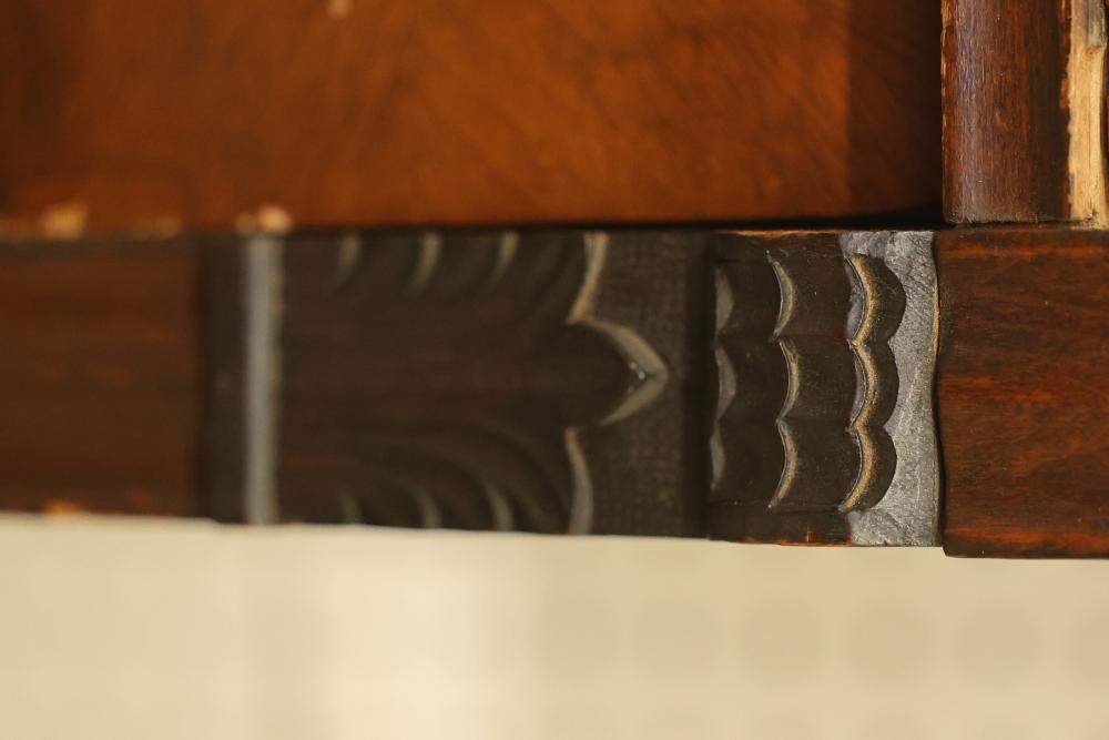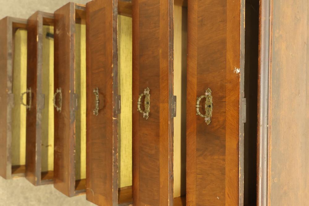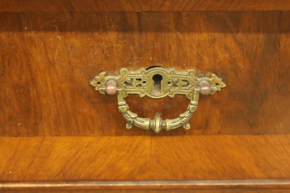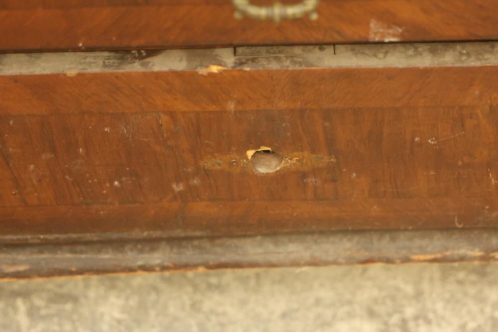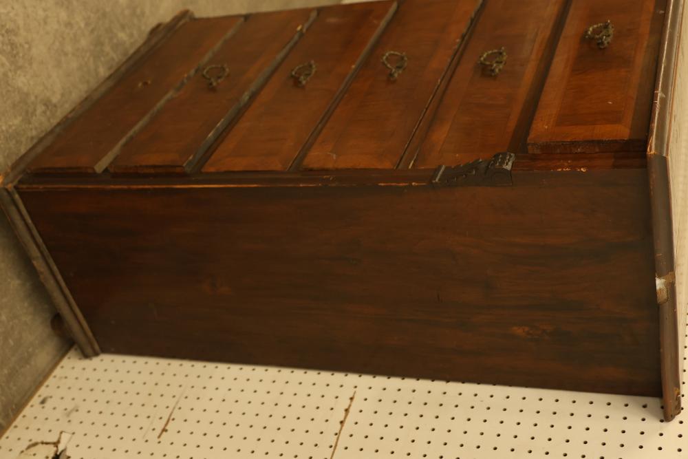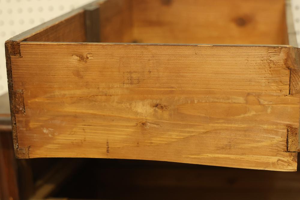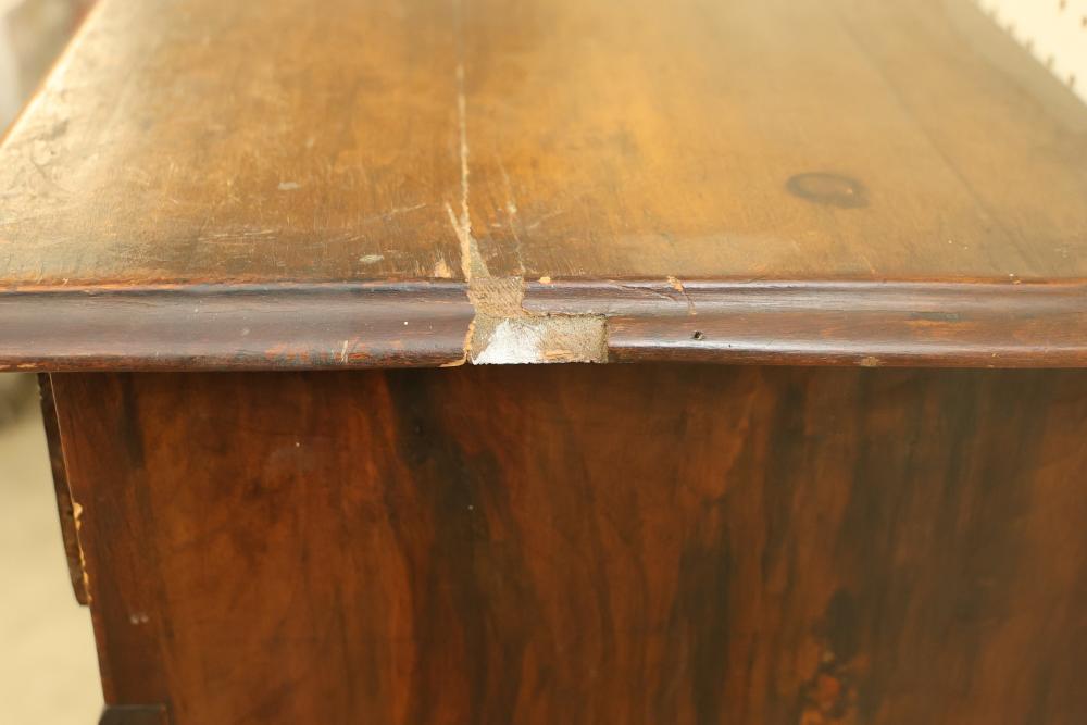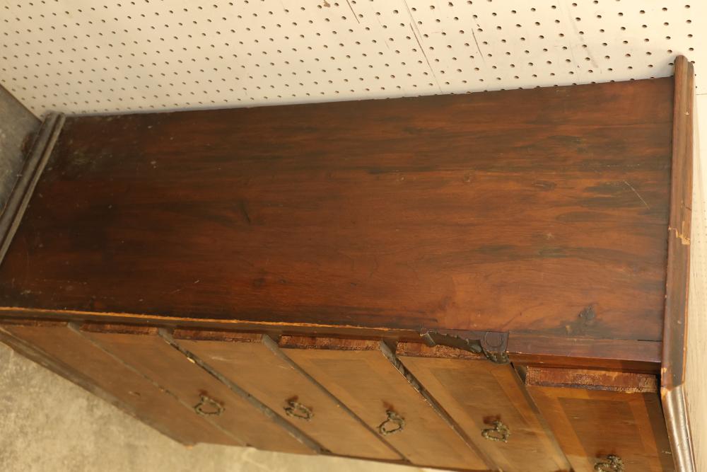 Six Drawer Veneered Dresser, drawers are chamfered dovetail drawers and have locks, but the key is missing and not included. Drawers are equipped with brass pulls except for the bottom drawer, which is missing the brass pull. Some wear and tear is present. Dresser measures approximately 45 inches high, 27 inches wide, and 17.5 inches deep. Pickup only.