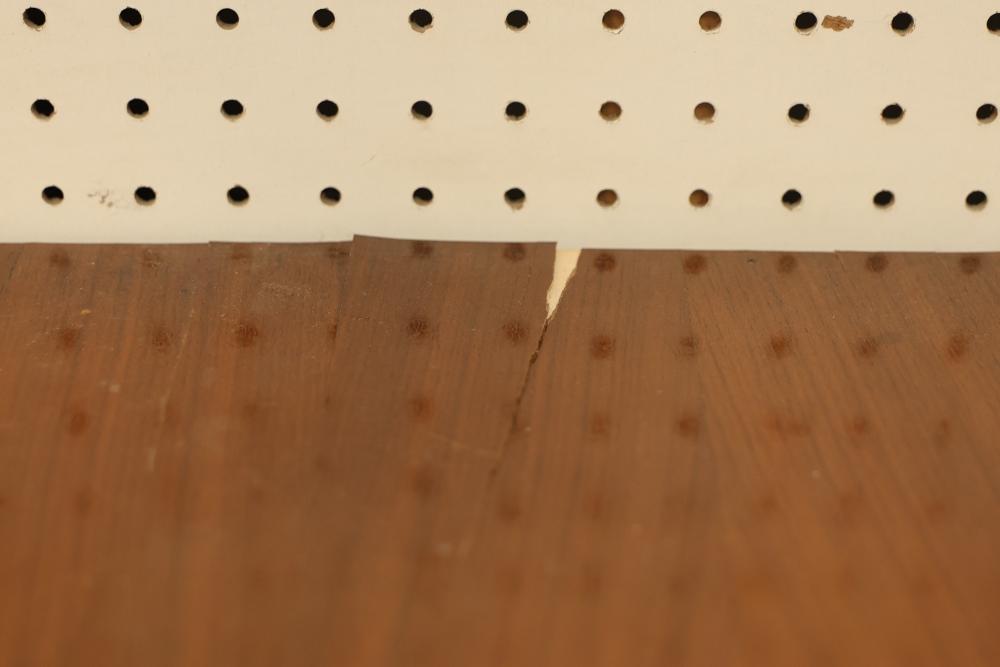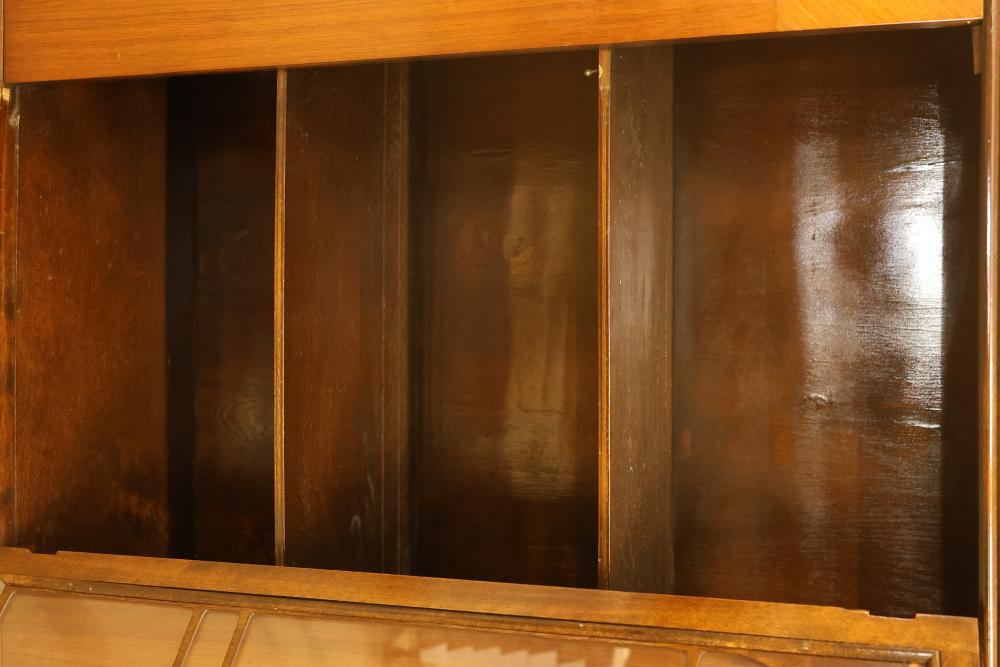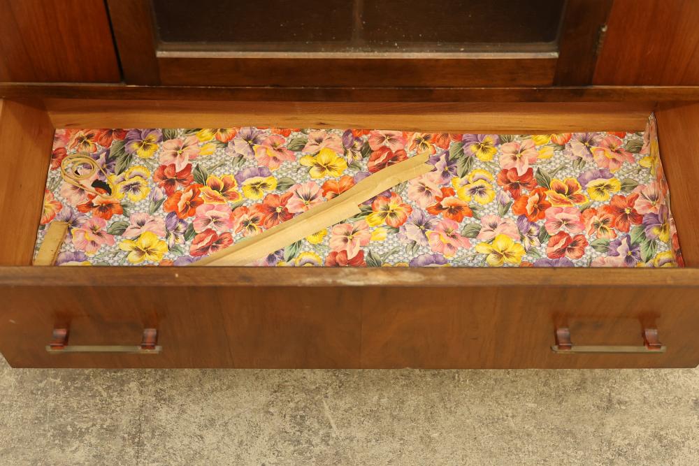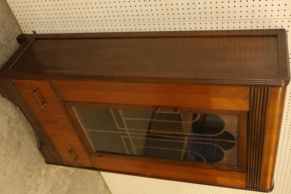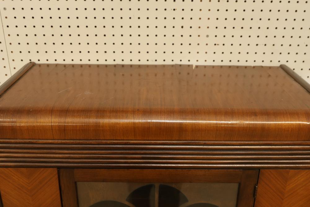 Vintage Art Deco China Cabinet with Patterned Glass and Brass Pulls. Features patterned glass, brass pulls, and a veneer finish. Veneer finish is beginning to peel on the top of the china cabinet. Measures approximately 56 inches high, 32 inches wide, and 14 inches deep. Pickup only.