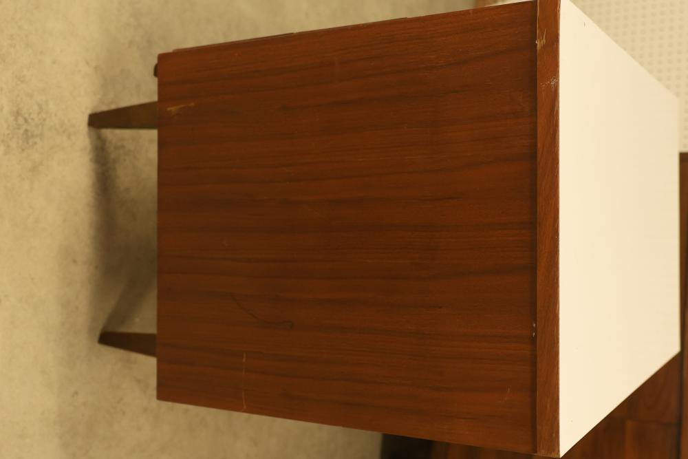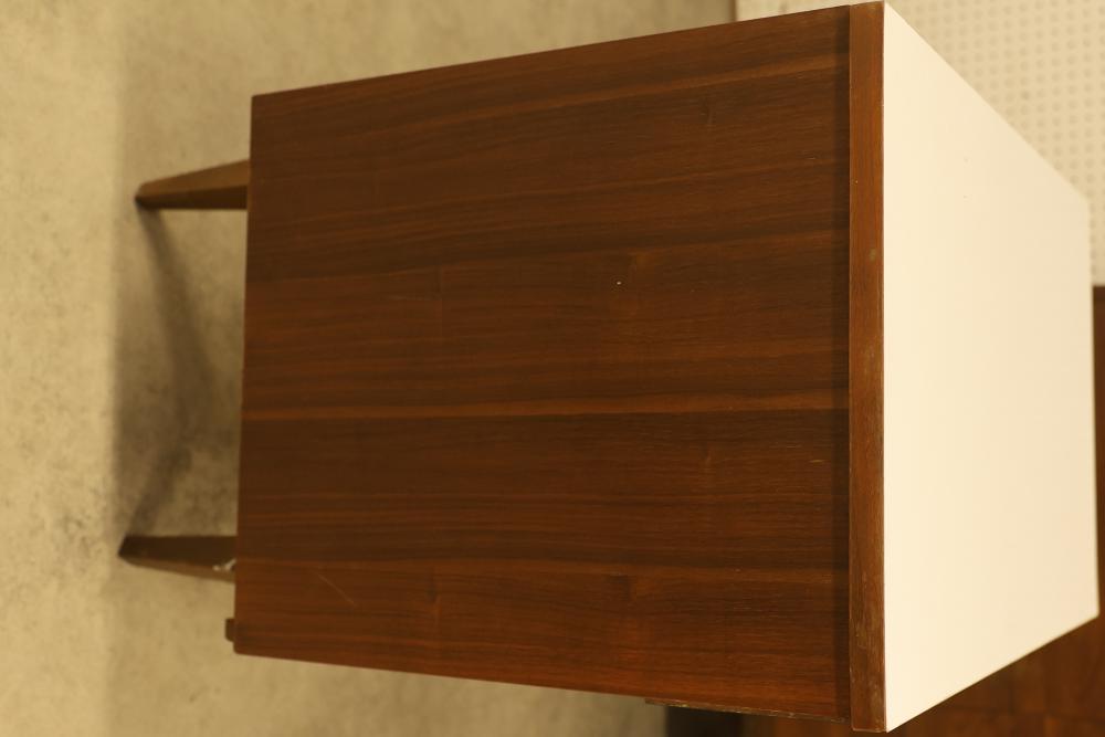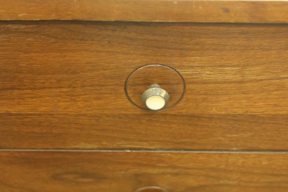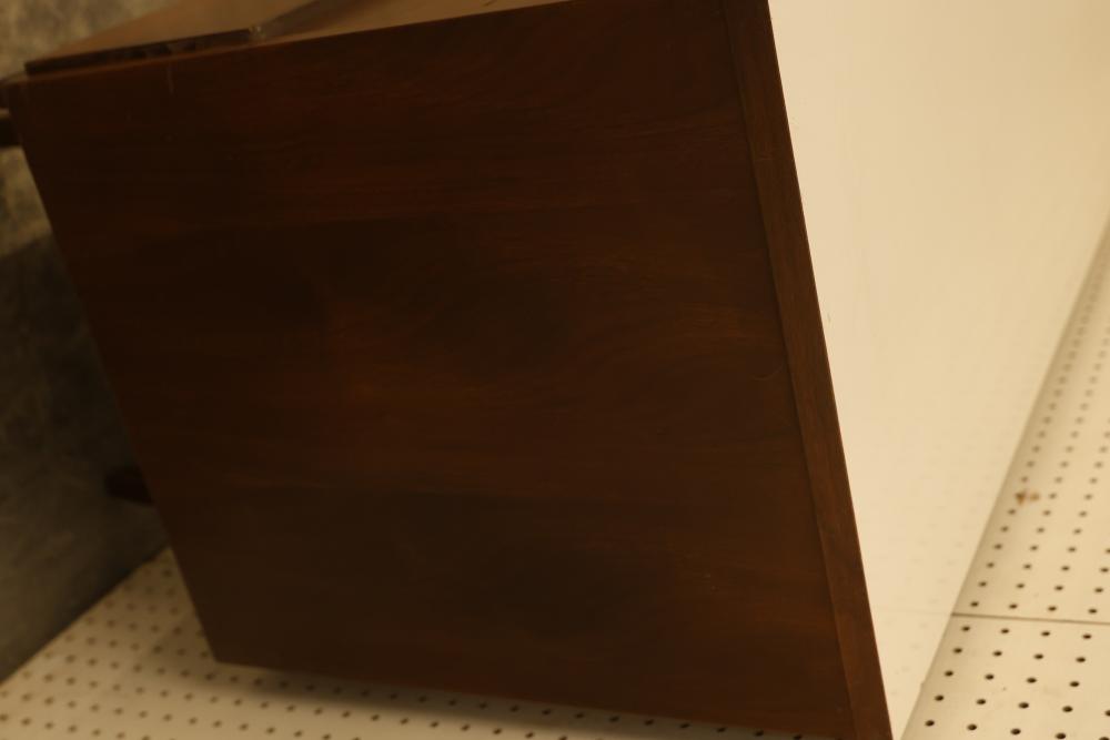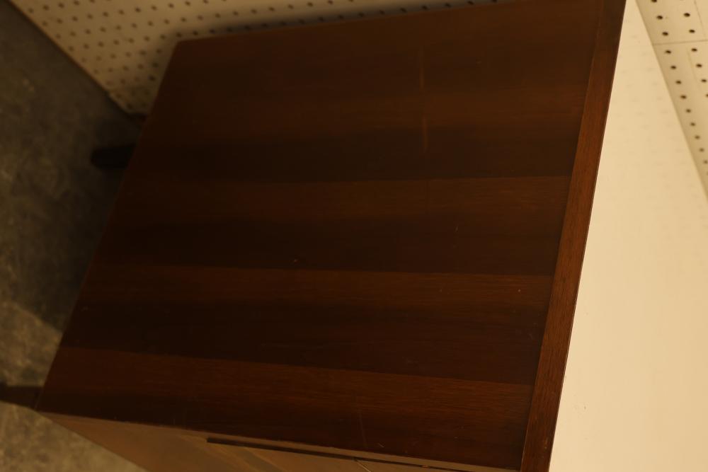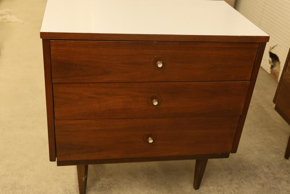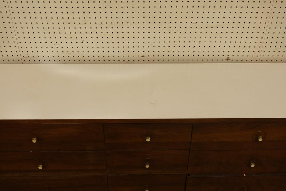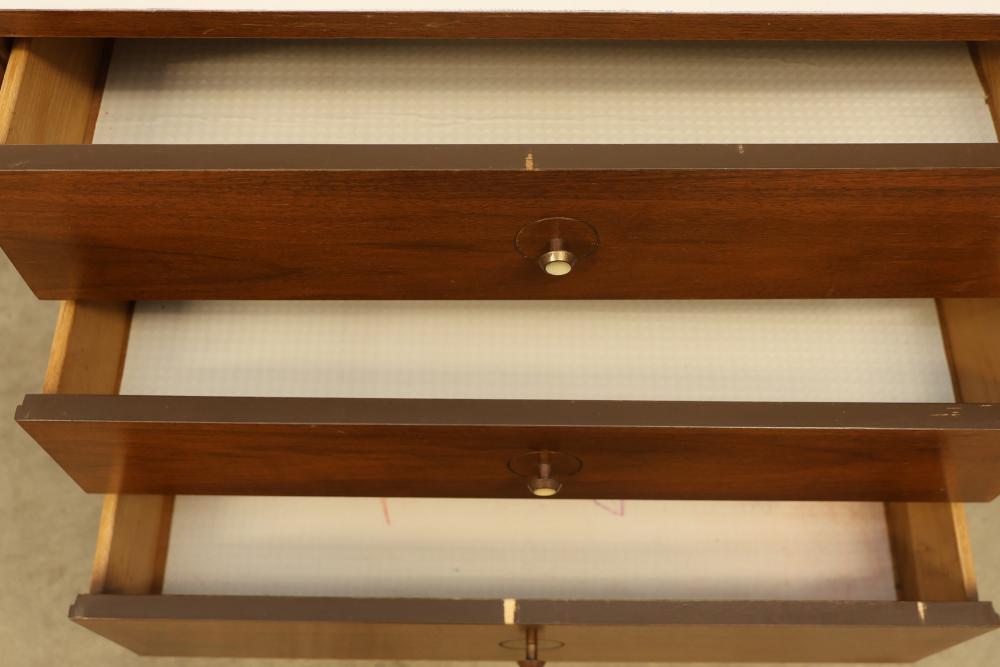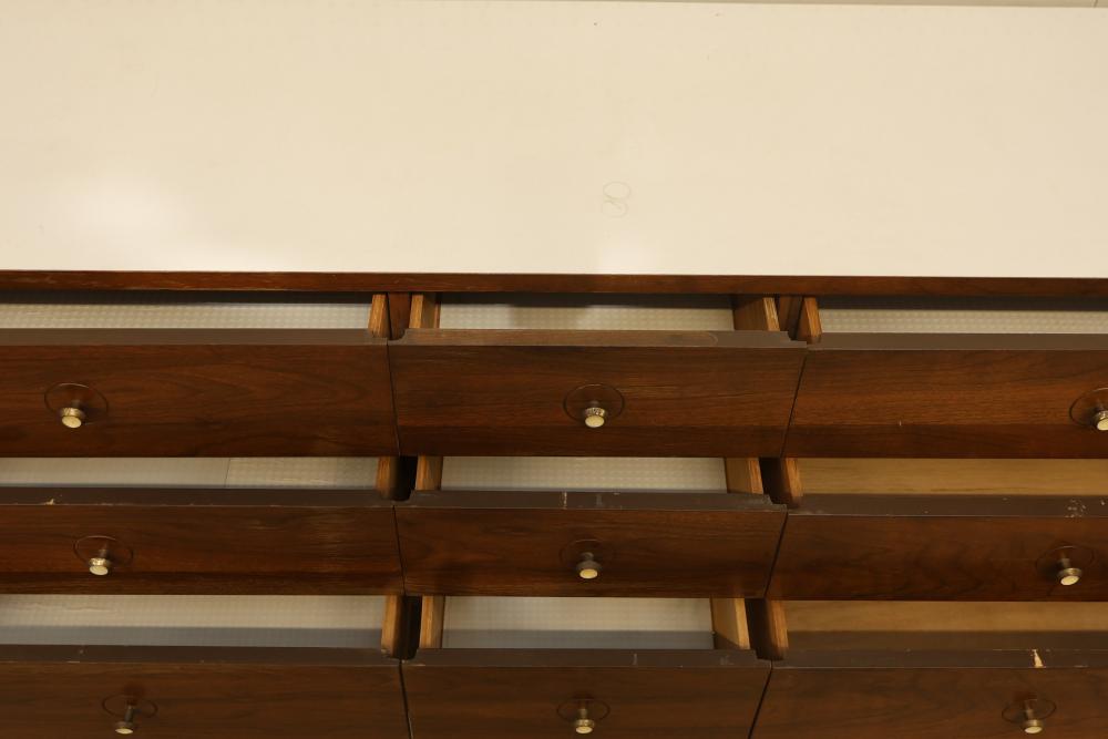 Mid-Century Modern Cabinet and Mid-Century Modern Three-Drawer Dresser. Mid-century modern cabinet features a dark wood front with nine drawers and brass pulls, and measures approximately 30.5 inches high, 60.5 inches wide, and 17.5 inches deep. Mid-century modern three-drawer dresser features a dark wood front and brass pulls, and measures approximately 30.5 inches high, 30.25 inches wide, and 17.5 inches deep. Pickup only.