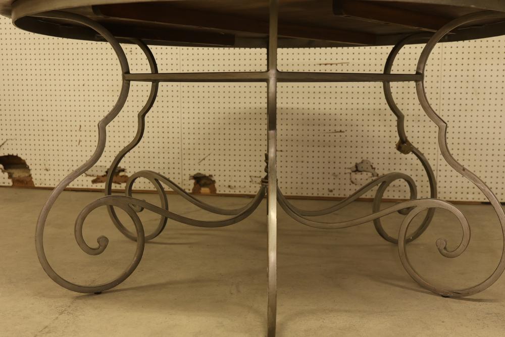 Harden Round Dining Table with Metal Legs. Features wooden finish and metal frame and legs. Hardware is included and attached to the legs. Table measures approximately 30 inches high with a 60 inch diameter. Pickup only.