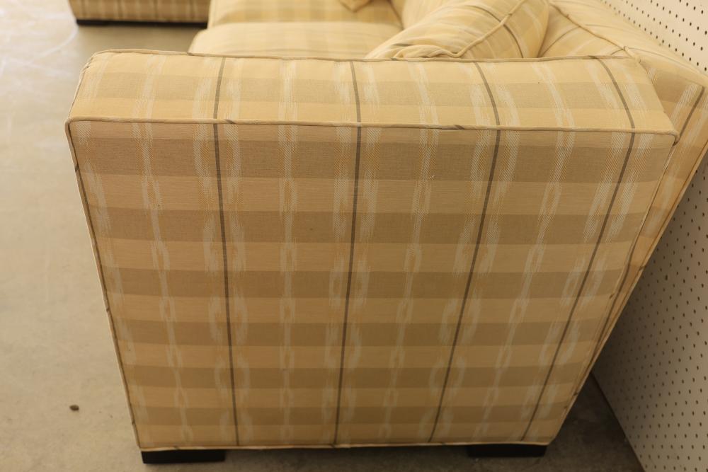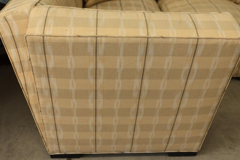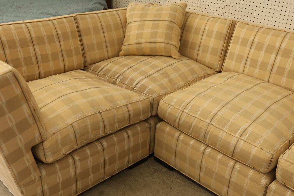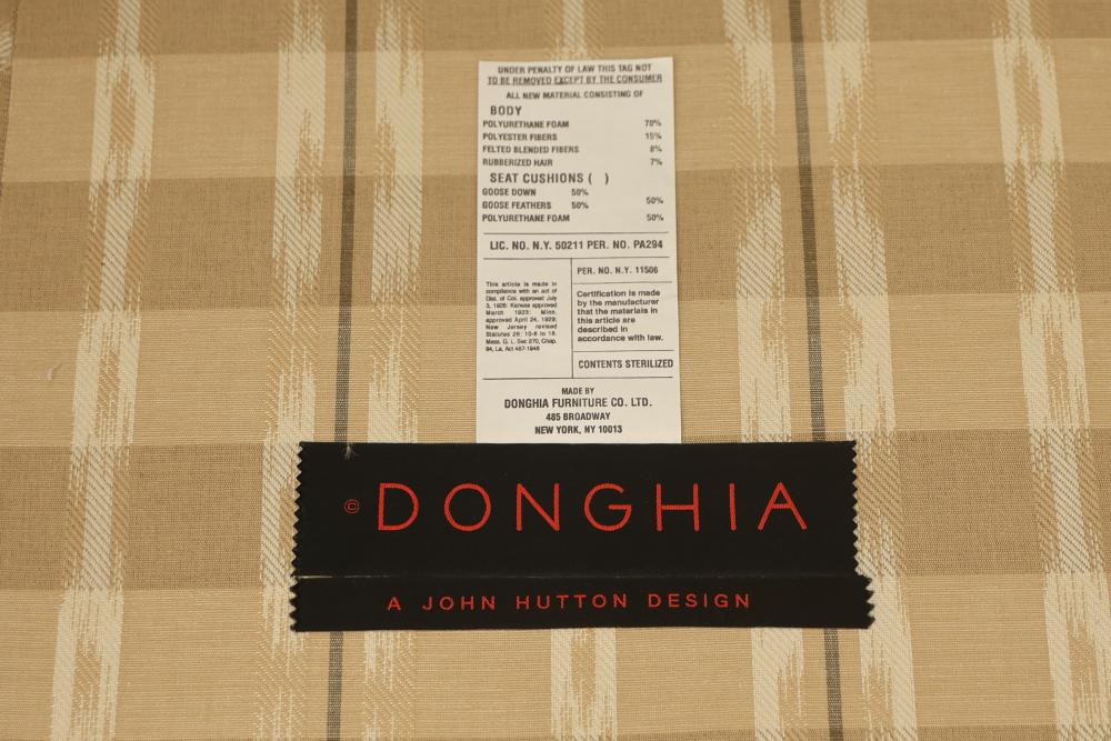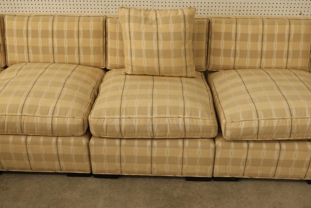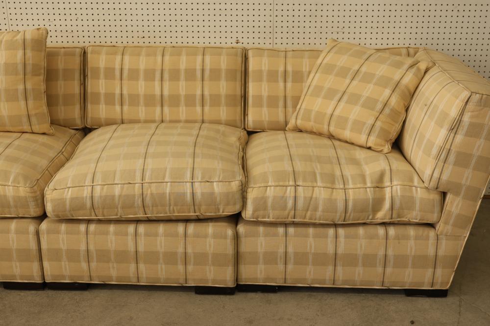 6-Piece Modular Sectional Donghia John Hutton Design. Features cushions, three throw pillows, and a checkered fabric pattern. Measures approximately 29 inches high, 156 inches wide, and 72 inches deep. Pickup only.