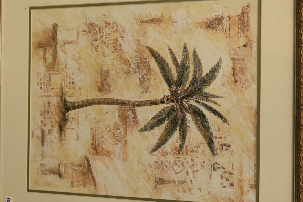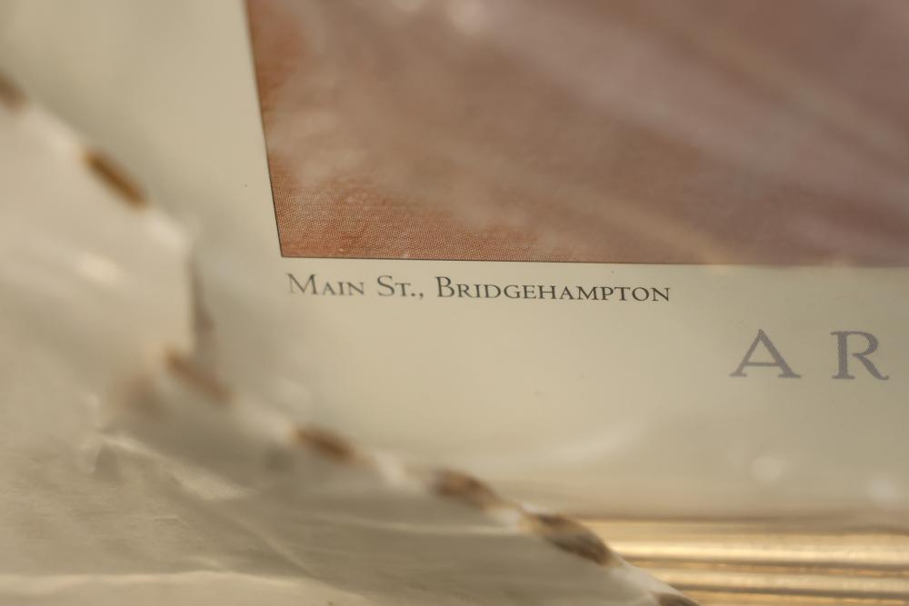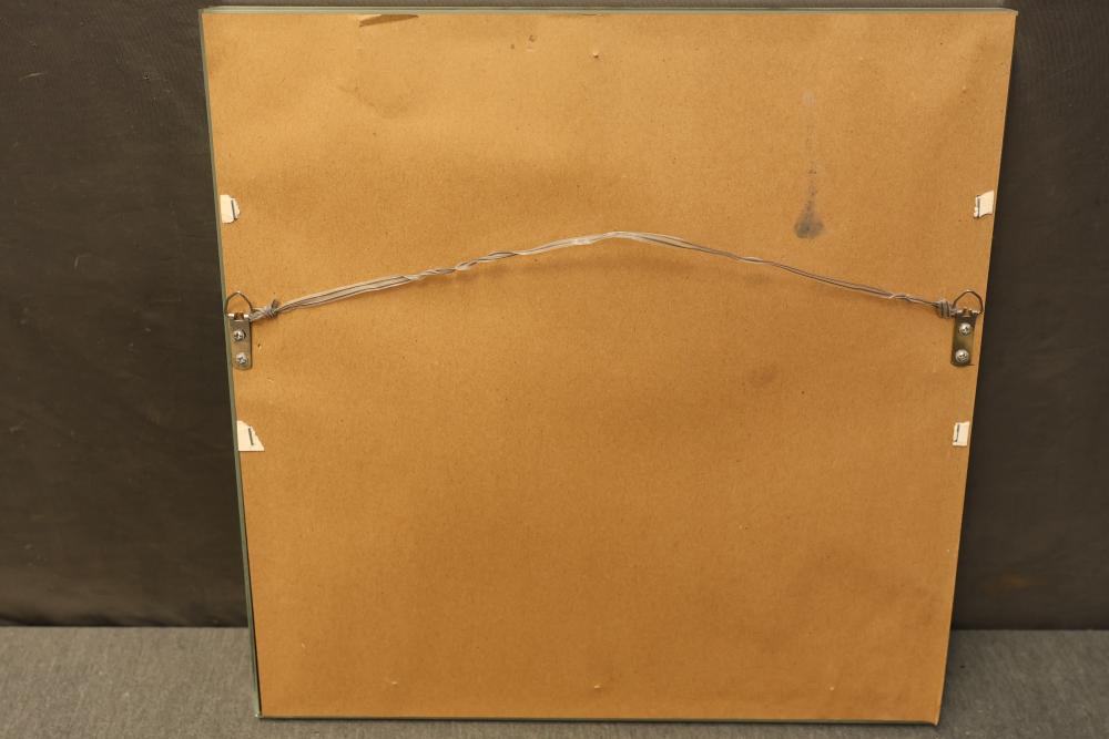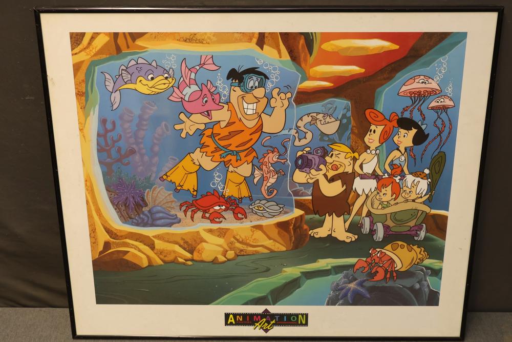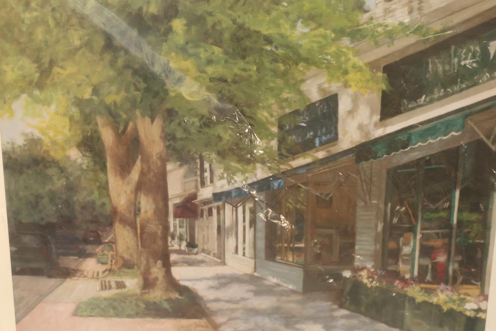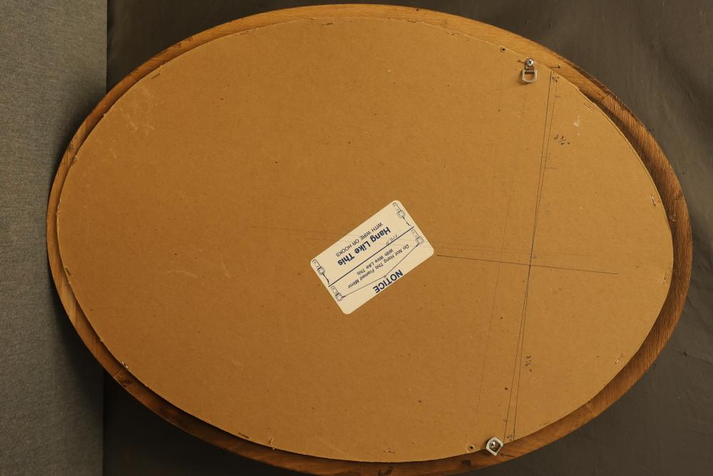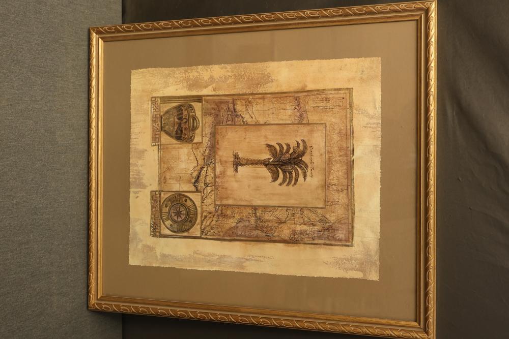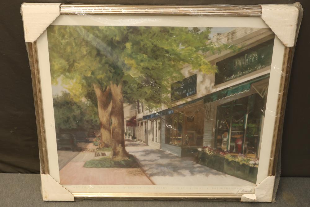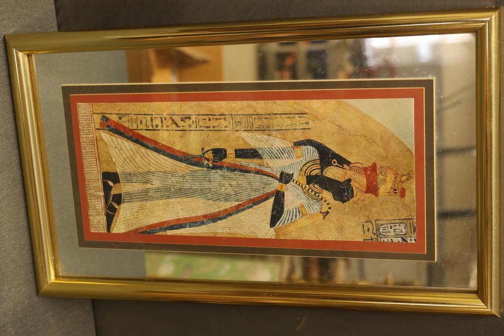 Artwork including 7 prints and 2 mirrors. Pieces include unsigned print of a palm tree, "Quaubcojolli Terenty" print by J Combs(?), Flintstones print by Animation Art, and print of "Main St., Bridgehampton" by Allison Burrell (signature in artwork). Rectangular mirror with golden frame and print of Queen Nefertari of Egypt measures approximately 28.5 inches long and 16.5 inches wide. Oval mirror with wooden frame measures approximately 29.5 inches long and 21.5 inches wide. Artwork piece sizes range from approximately 29.5 inches long by 25.5 inches wide to approximately 15.5 inches long by 15.5 inches wide. Pickup only.