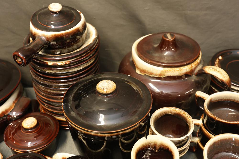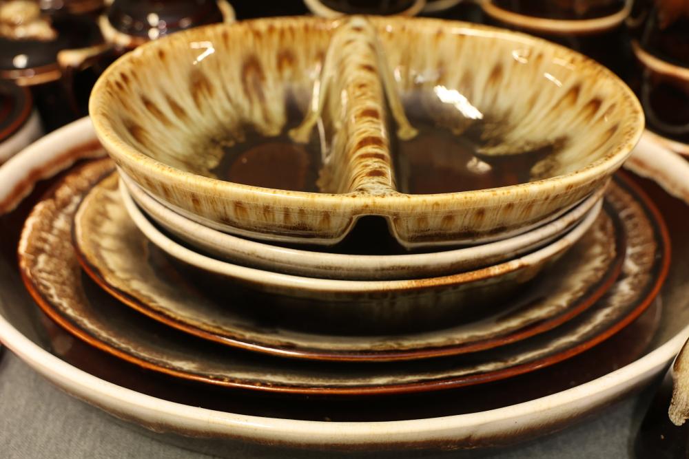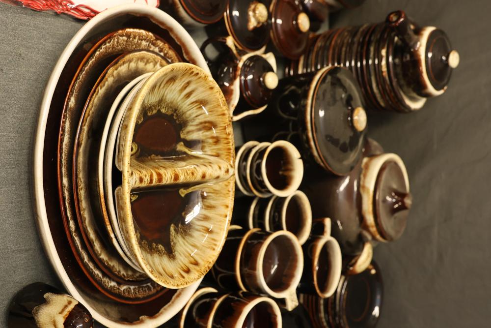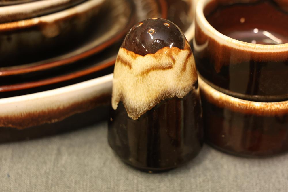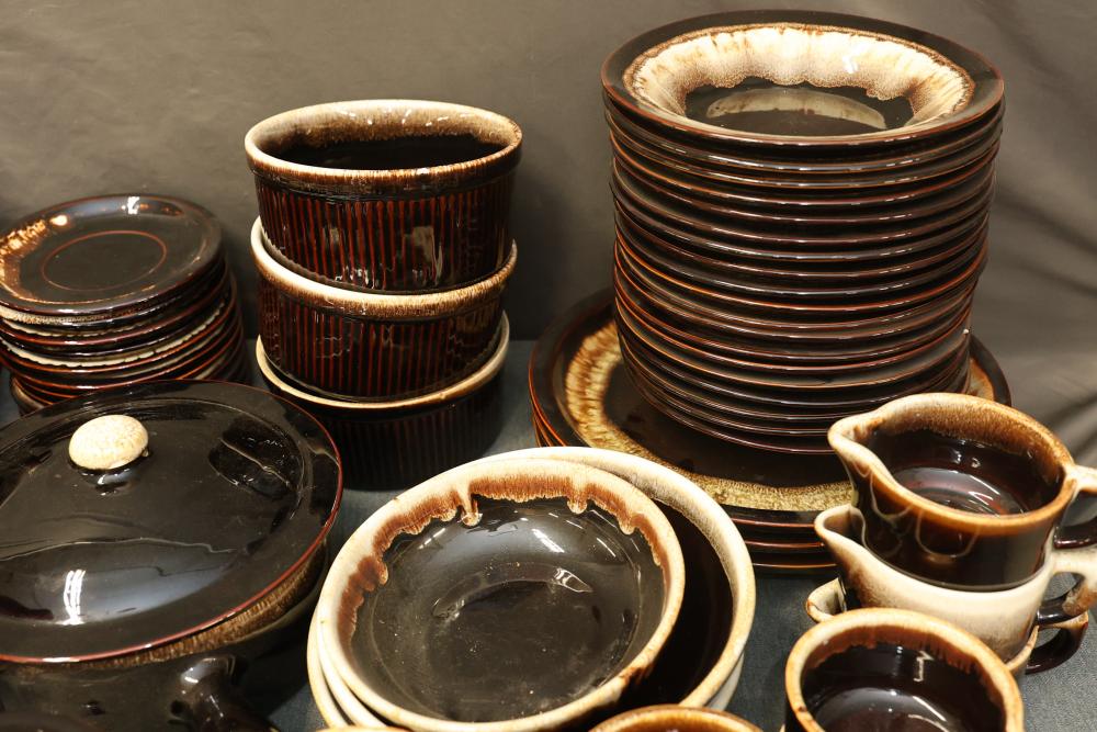 Pfaltzgraff Brown Drip Dinnerware Set with Tablecloth. Includes dinner plates, teapots, coffee mugs, bowls, pans, and a tablecloth. Pickup only.