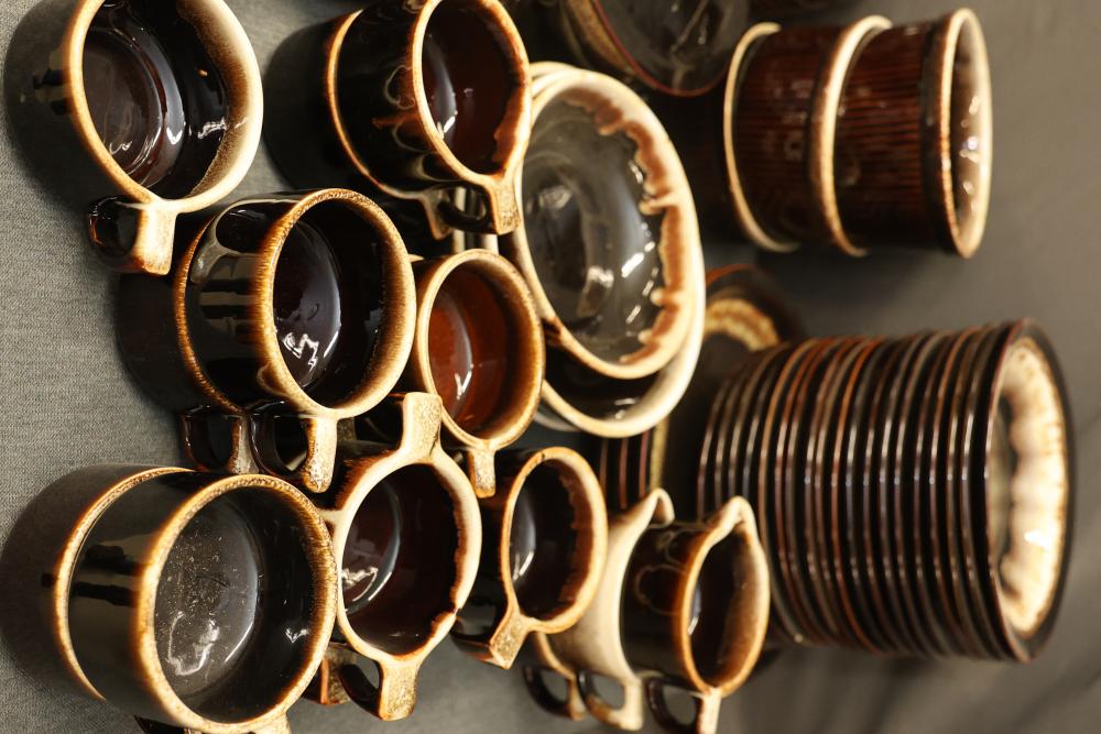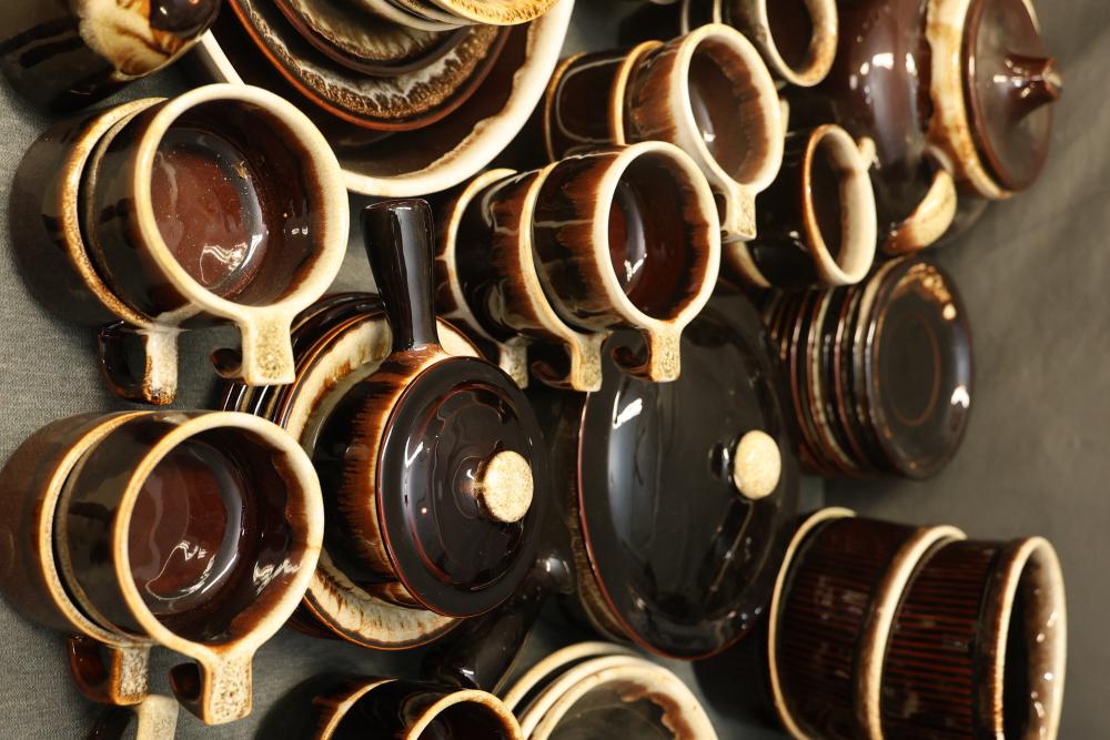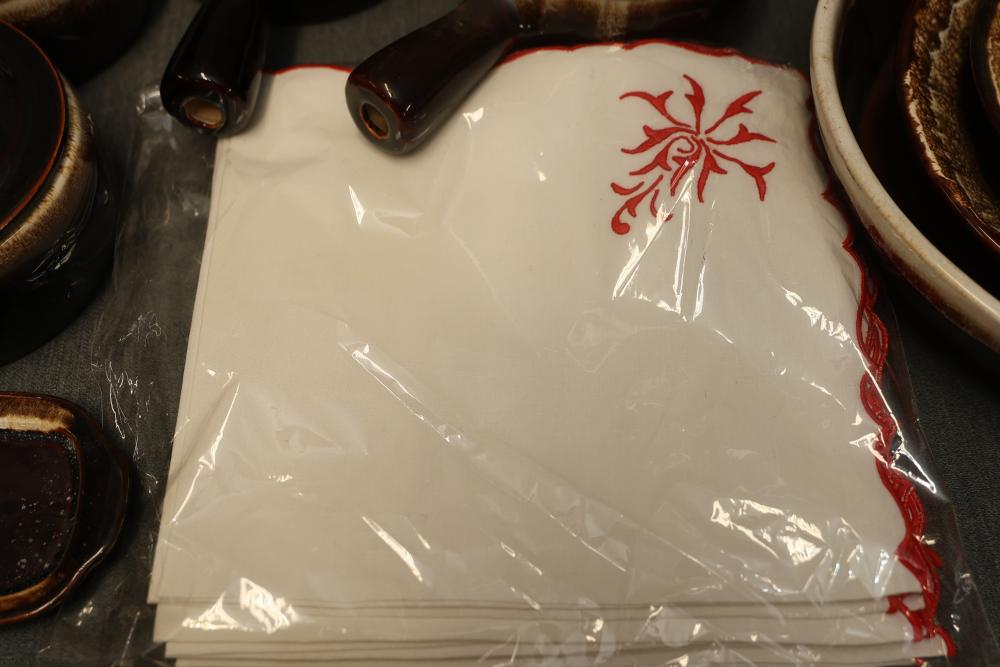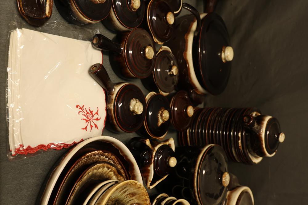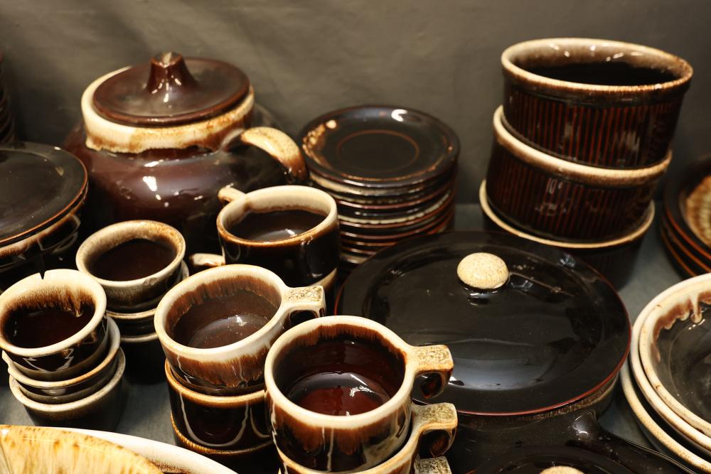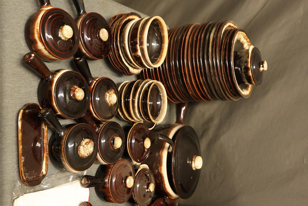 Pfaltzgraff Brown Drip Dinnerware Set with Tablecloth. Includes dinner plates, teapots, coffee mugs, bowls, pans, and a tablecloth. Pickup only.