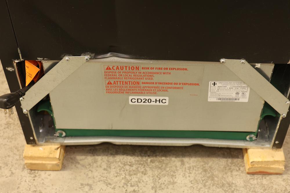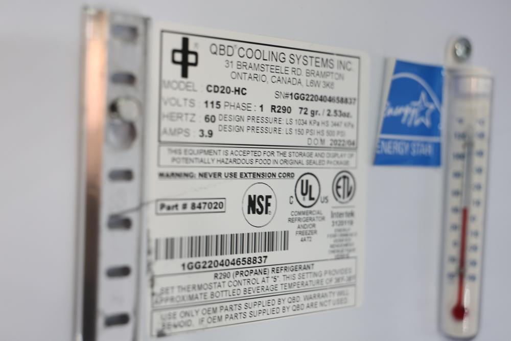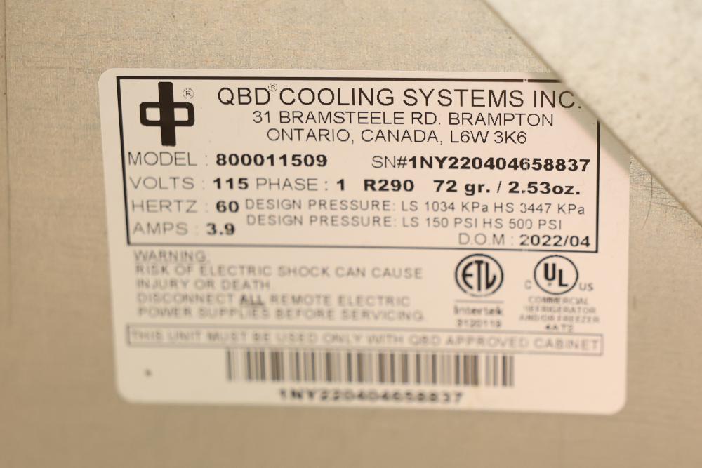 QBD Cooler Model CD20-MC R290 Refrigerant 115 V 60 Hz 3.9 Amp. Comes with installed QBD cooling system model 800011509. Cooler measures approximately 77.5 inches high, 24.75 inches wide, and 24.5 inches deep. Pickup only.