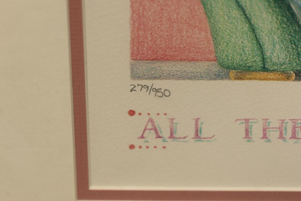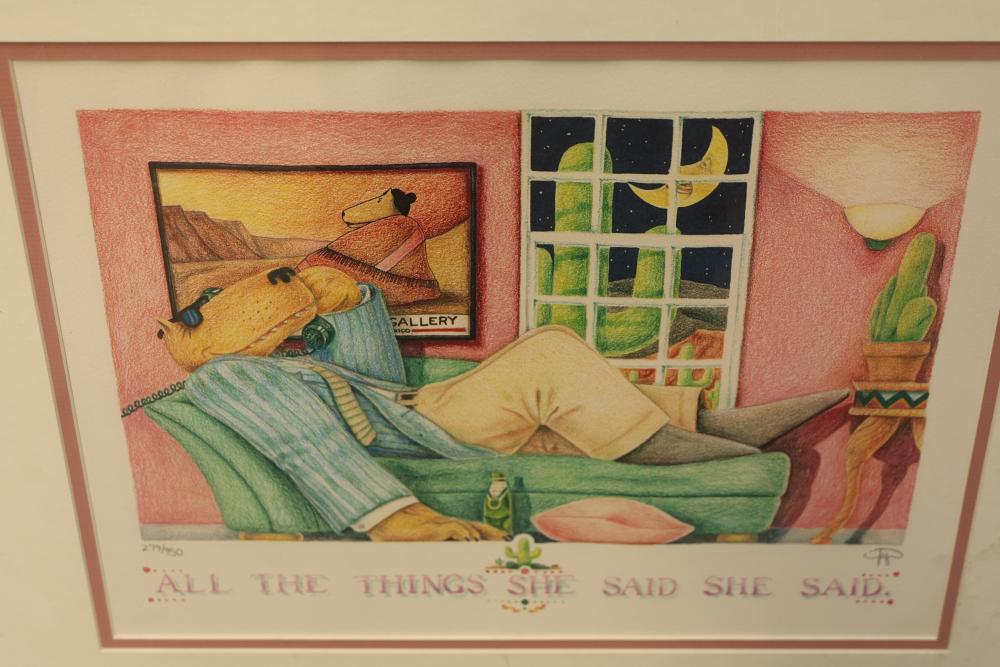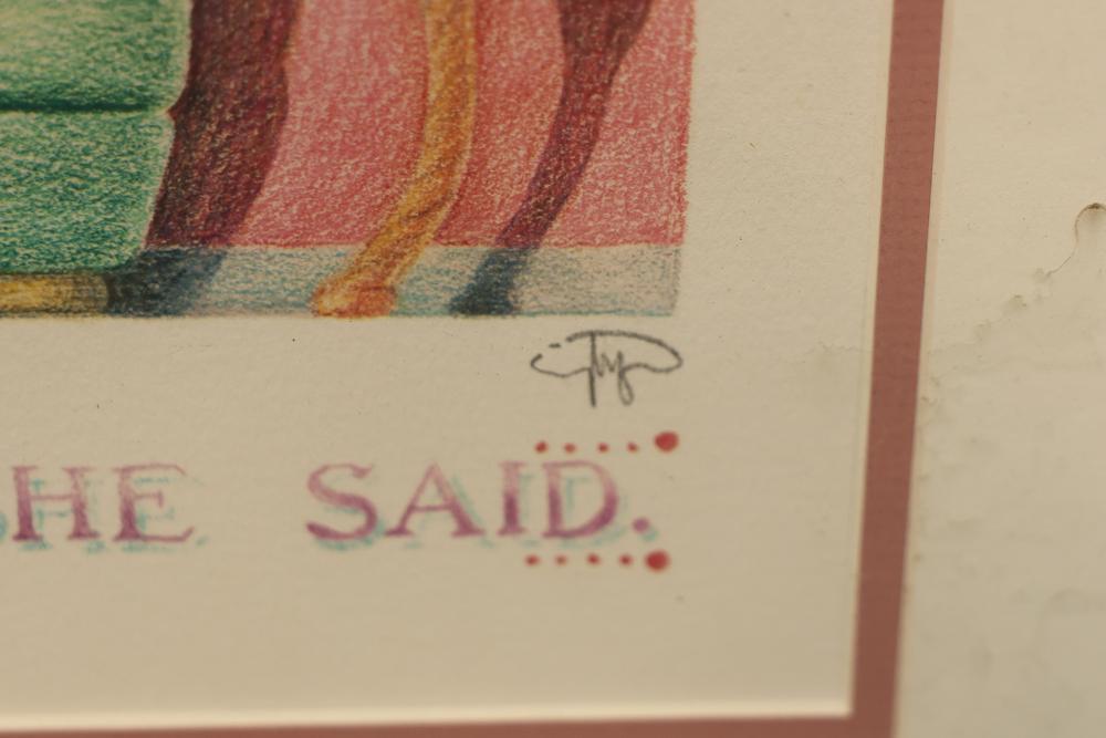 Framed limited edition lithograph of "All The Things She Said She Said," by Markus Pierson. Depicts an animated figure lounging in a room while using a telephone. Limited edition number 279/950. Measures approximately 21.25 inches long by 17.75 inches wide. Pickup only.