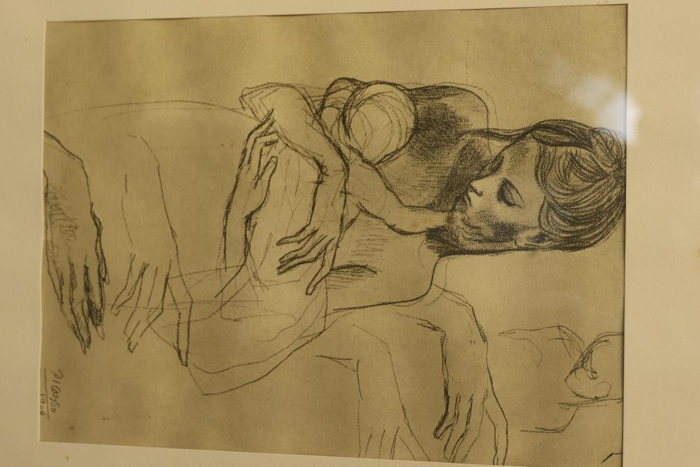 Framed print of "Mother and Child" pencil sketch by Picasso. Depicts a woman cradling a child. Signature in the bottom right of the print. Measures approximately 19.5 inches long and 15.5 inches wide. Pickup only.