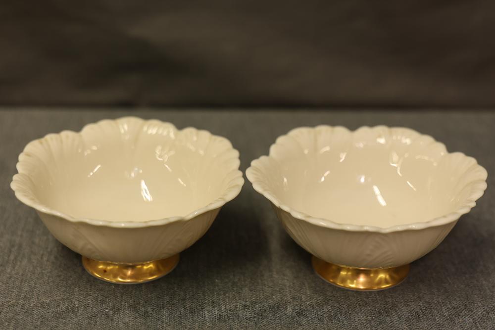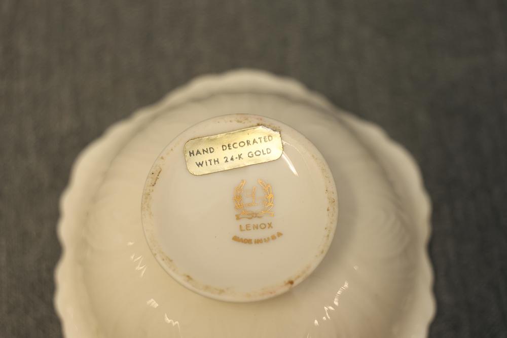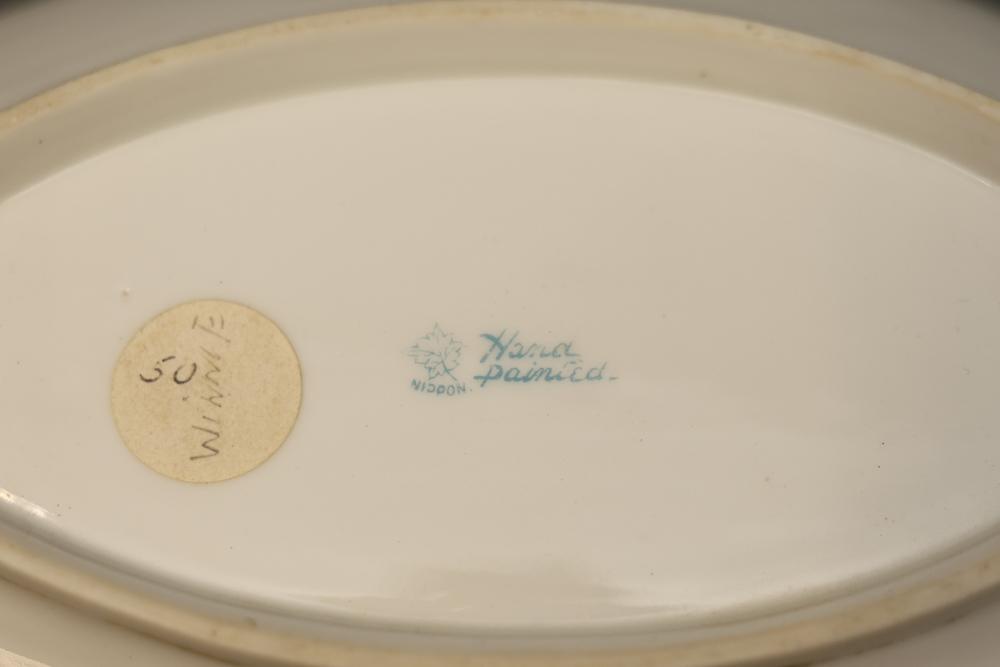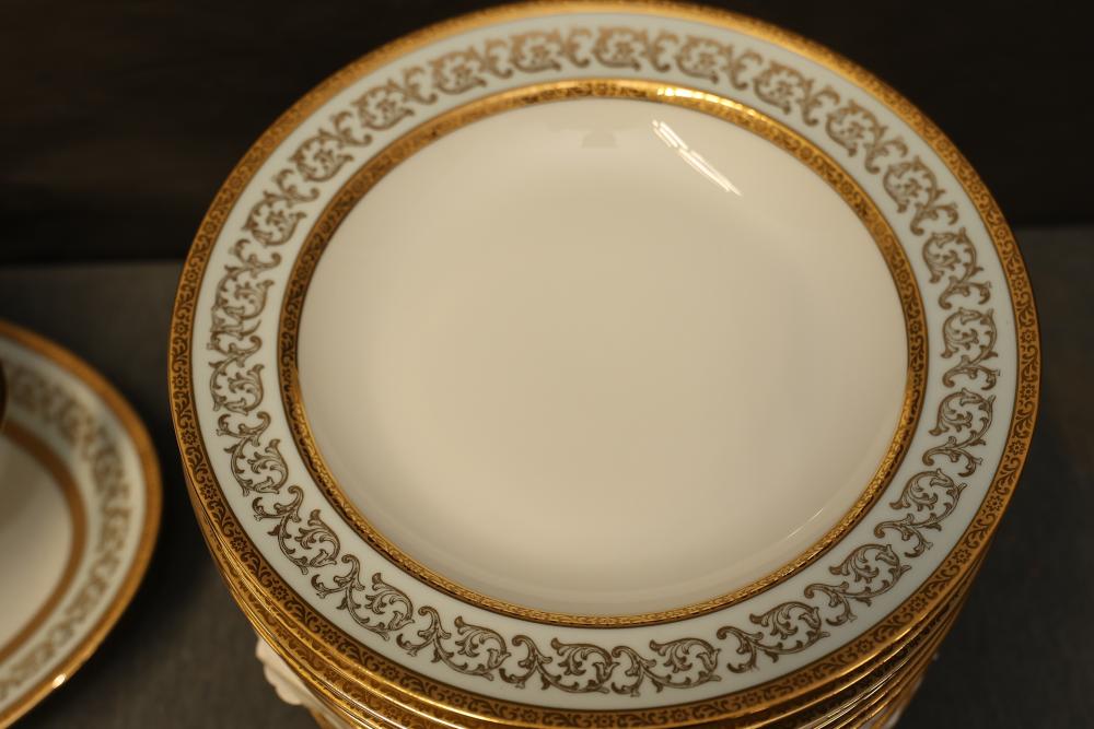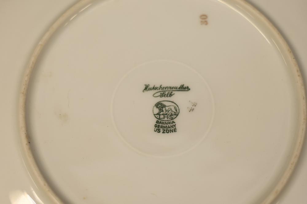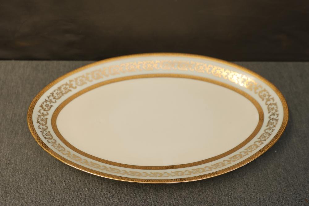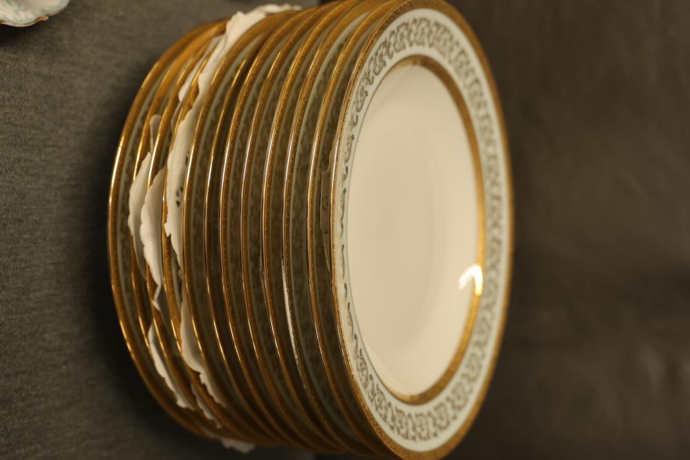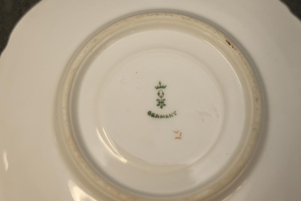 Dishware Assortment in Limoges China, Hutschenreuther, Noritake, Hermann Ohme, and Lenox. Includes 12 dining plates, 1 serving tray, and 2 dual-handled serving bowls in Limoges China, a Hutschenreuther Selb Bavaria porcelain plate, a Noritake relish dish, 3 tea saucers and 3 teacups by Hermann Ohme, and 2 Lenox Dorian nut dishes with a cabbage leaf design. Pickup only.