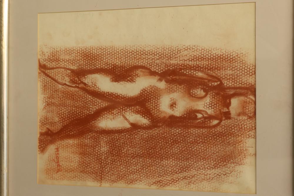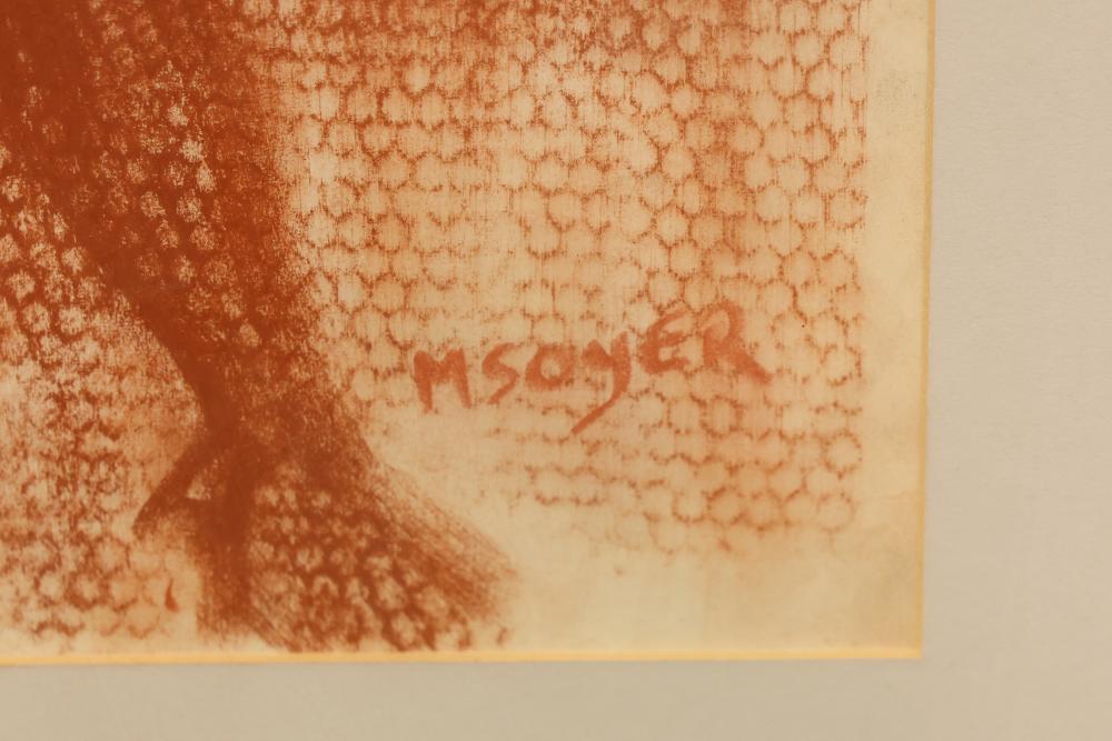 Framed lithograph of "Standing Nude," by Moses Soyer. Depicts a faceless, nude woman with a patterned background. Signed in art lower right. Measures approximately 24.75 inches long by 21 inches wide. Pickup only.