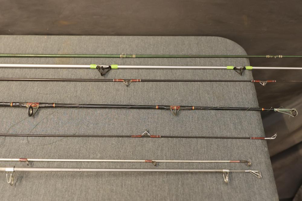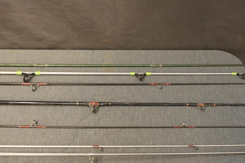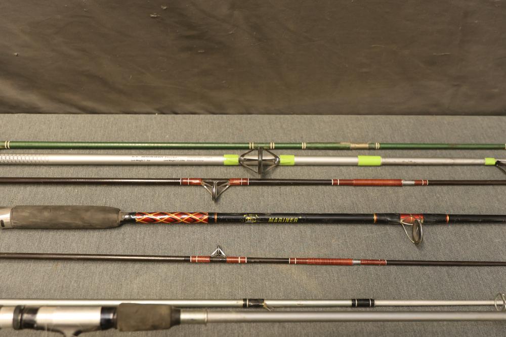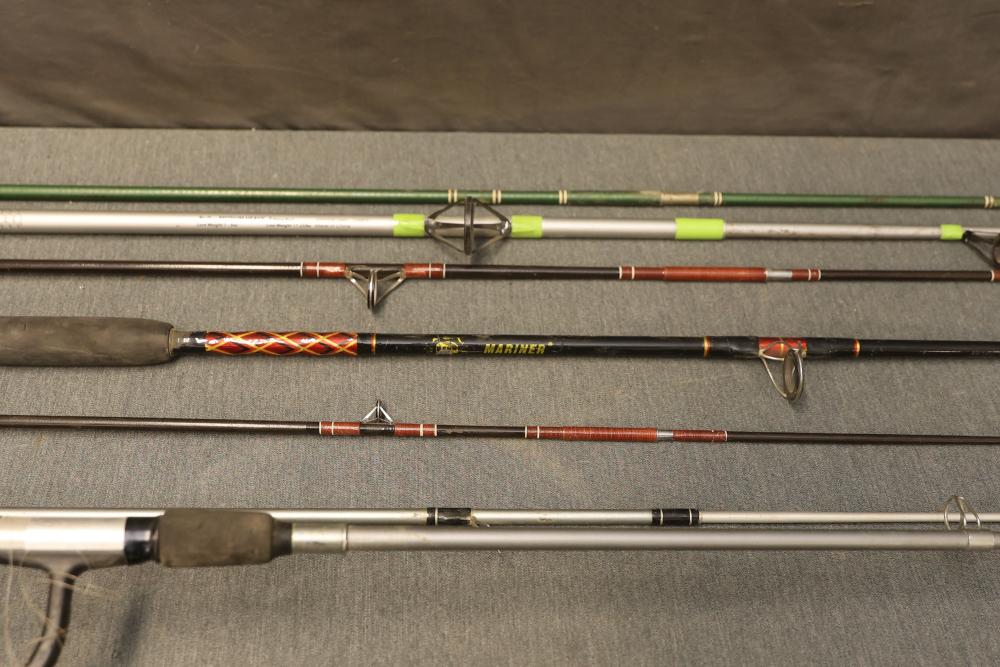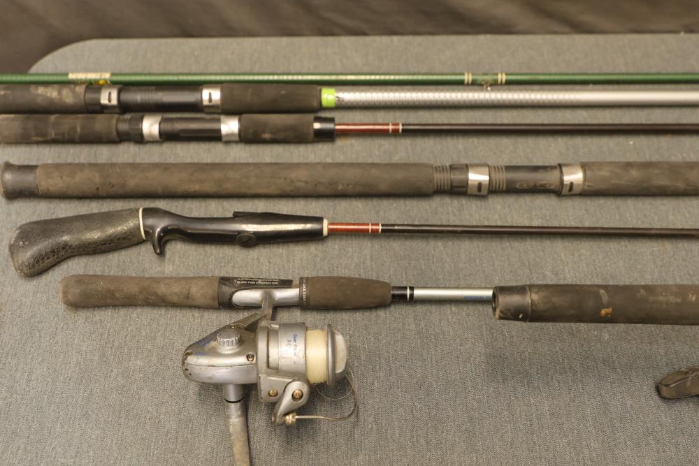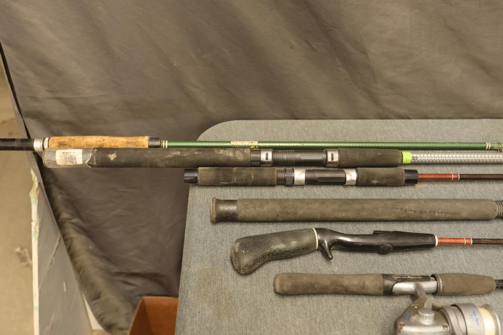 7 fishing rods including the Stinger by Zebco, the Mariner by Penn Fishing, and the Tiger by Shakespeare Fishing. Three rods are equipped with fishing reels. Pickup only.