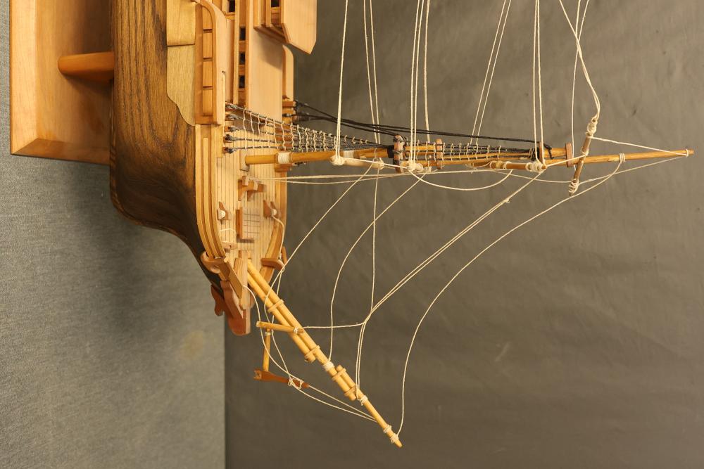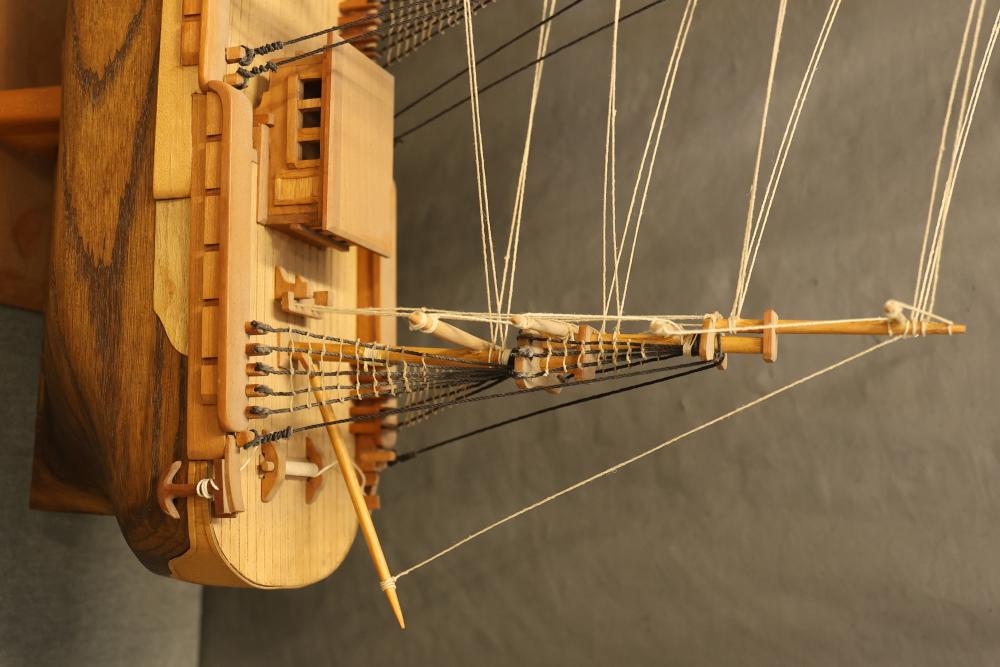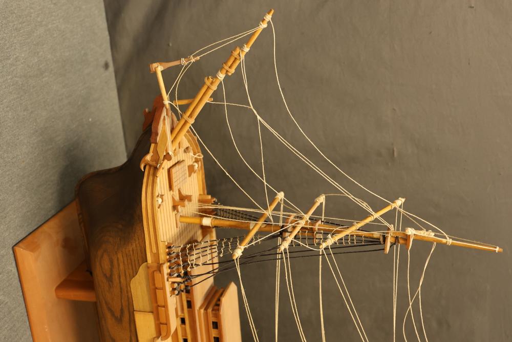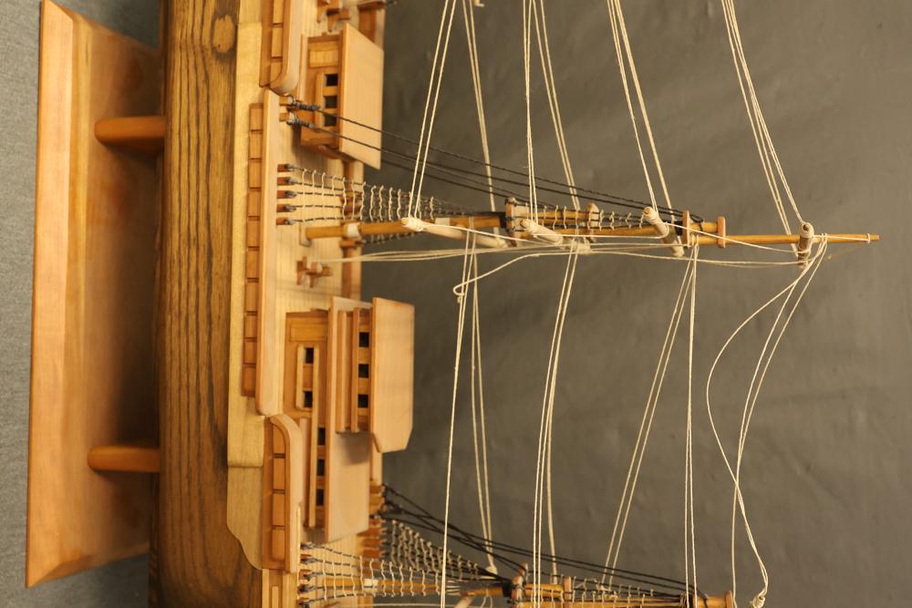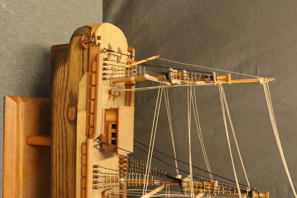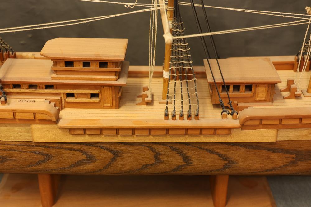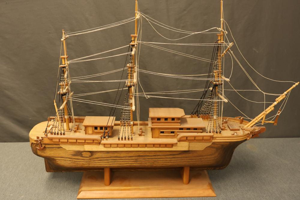 Decorative wooden model of a sailing ship with base. Measures approximately 20 inches high, 34 inches wide, 7 inches deep. Height changes to approximately 23.5 inches high when sitting on the base. Pickup only.