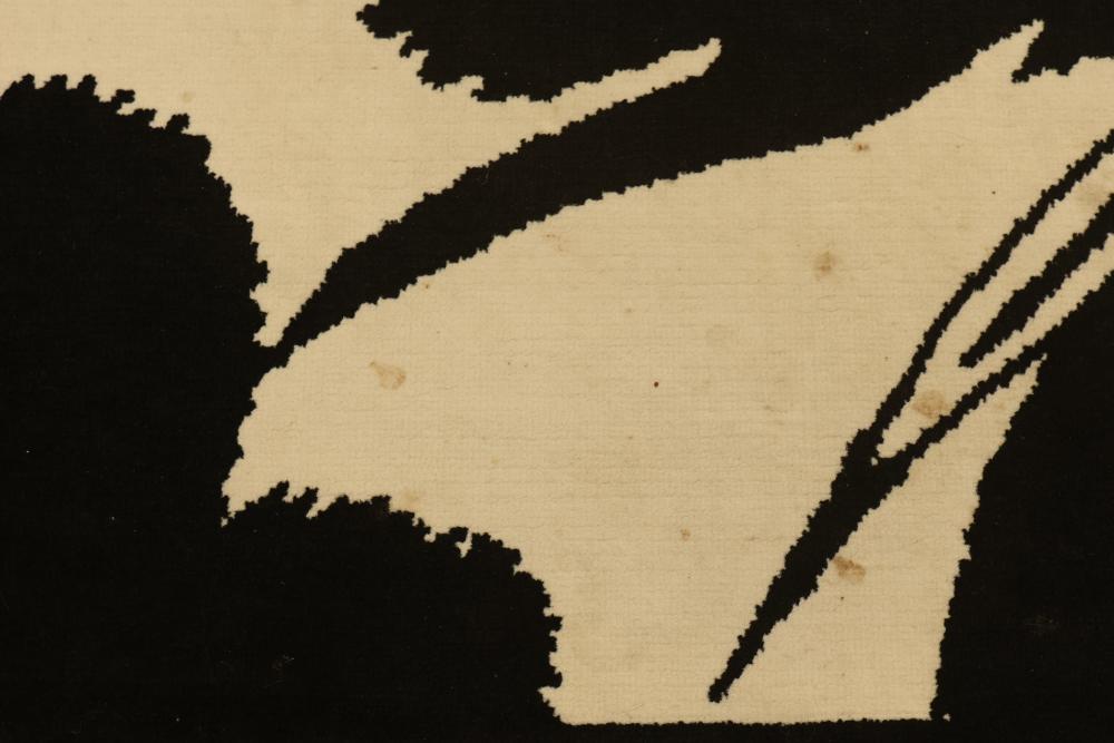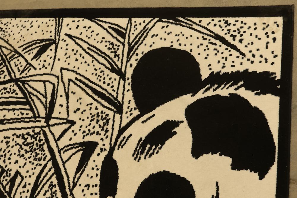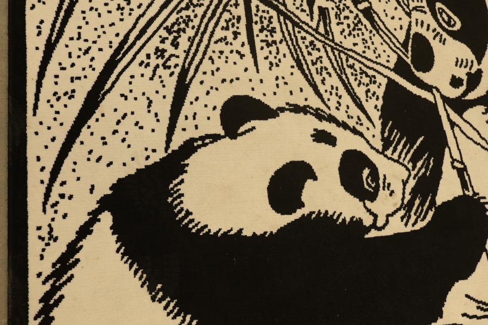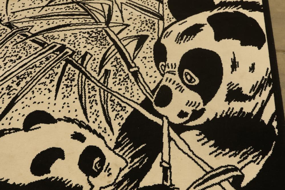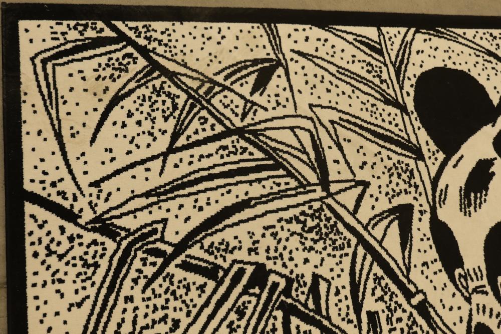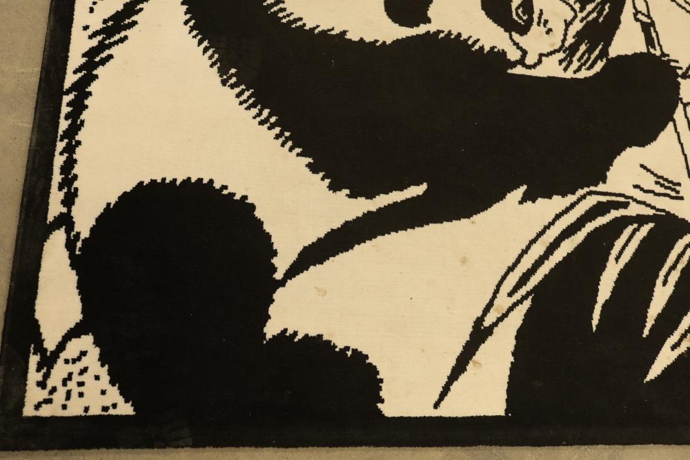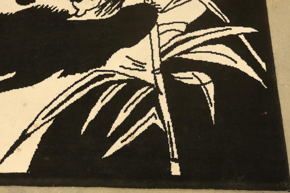 Black and White Panda-Themed Area Rug, Machine Made. Measures approximately 88 inches long and 66 inches wide. Features a detailed panda design. Note some staining on the bottom third of the rug, see photos for details. Pickup only.