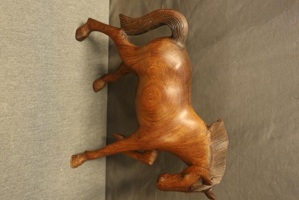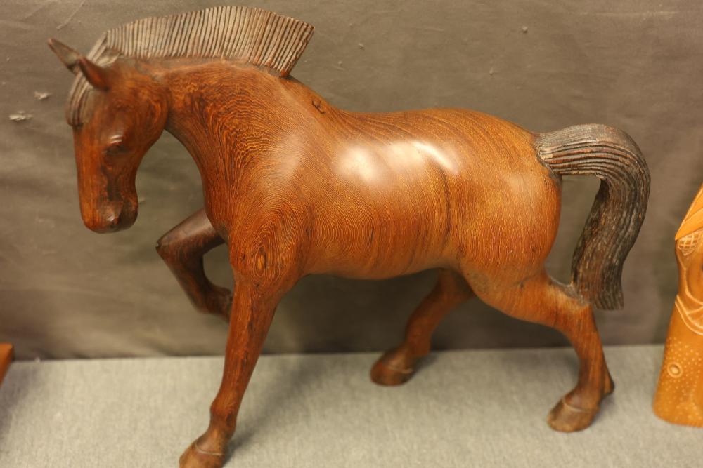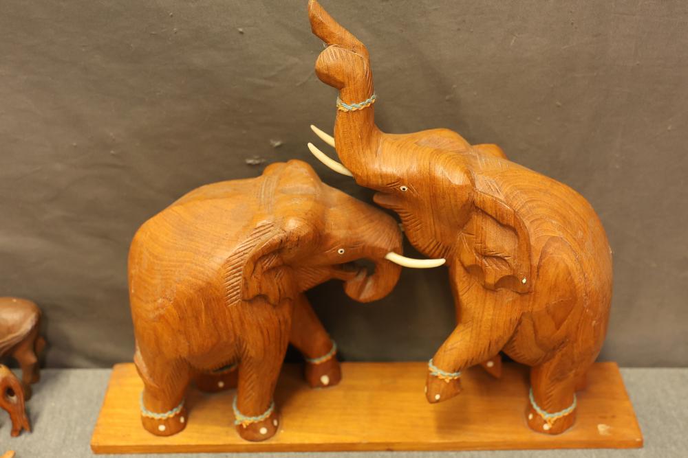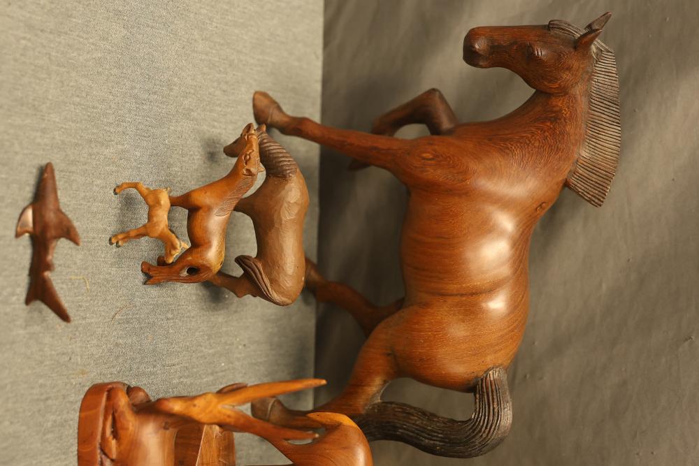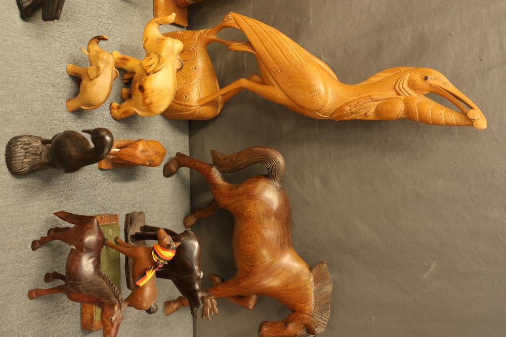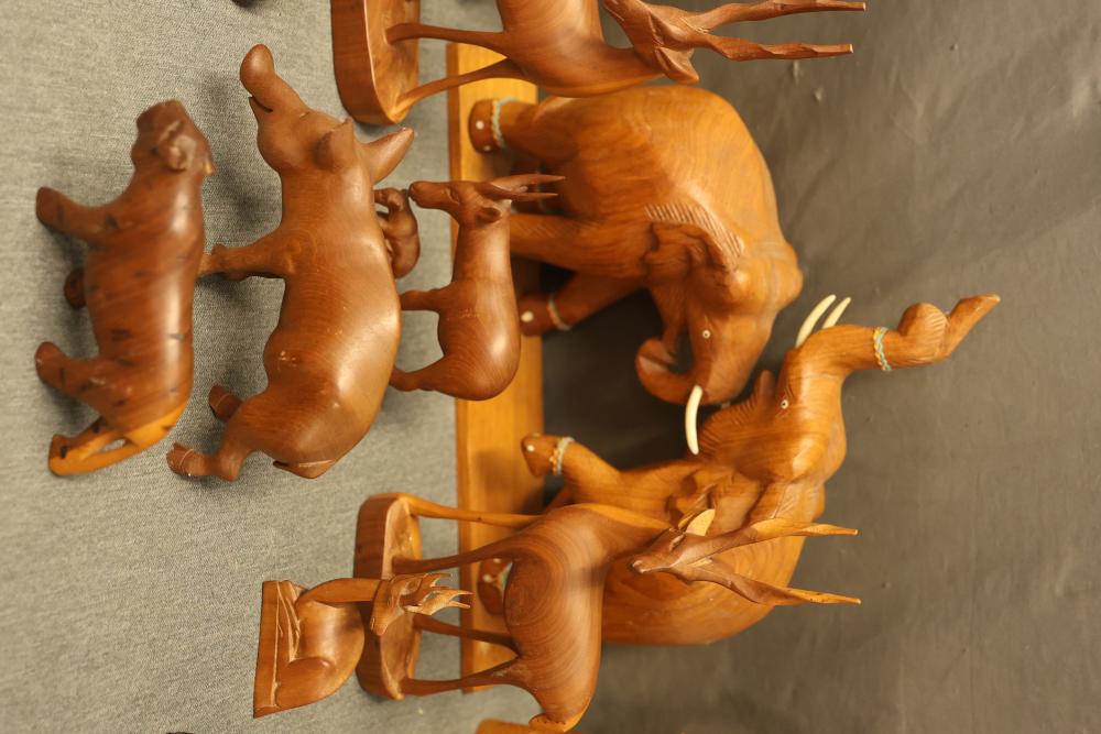 23 Wood-Carved Animal Figurines made from polished wood, depicting diverse animals including elephants, horses, antelopes, and birds. Intricately detailed, with variations in size and style. Pickup only.