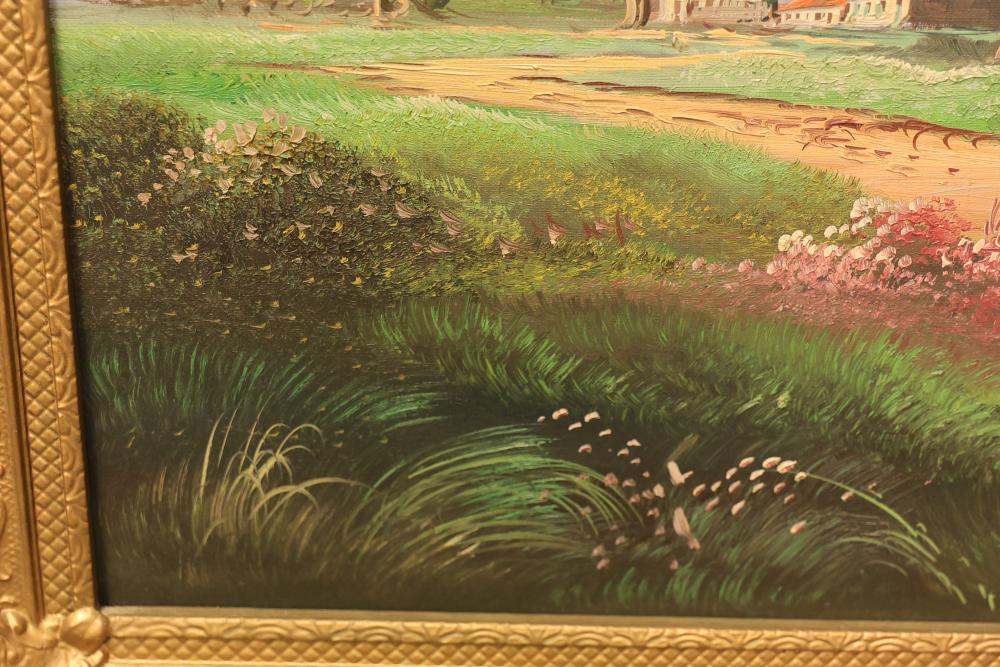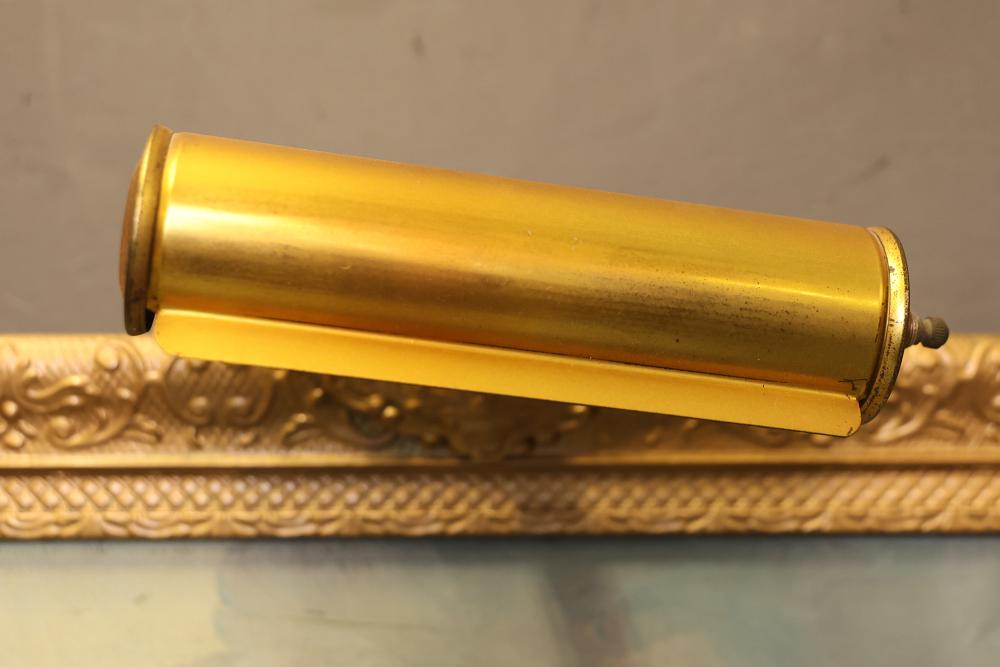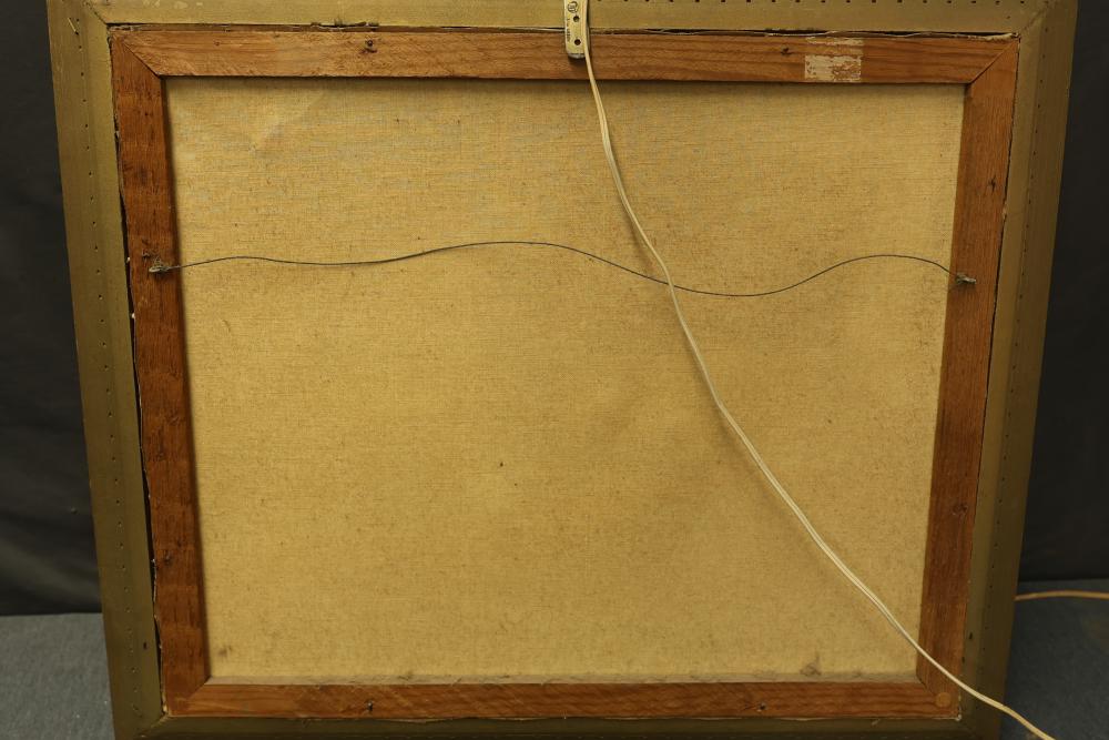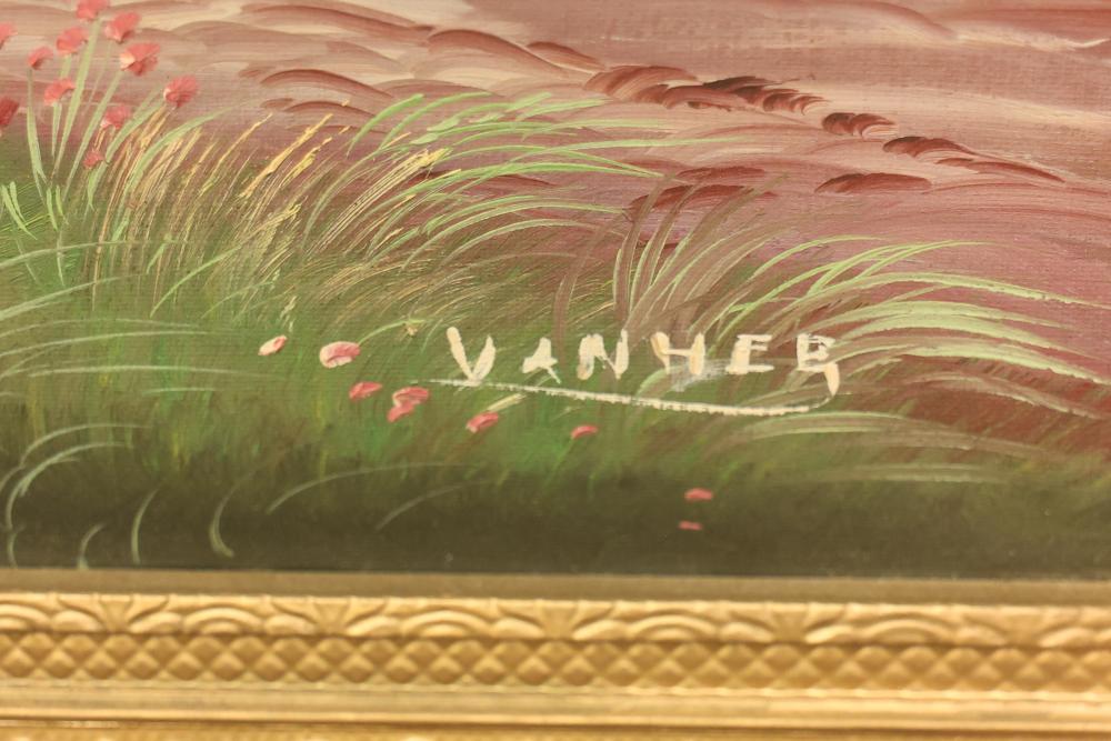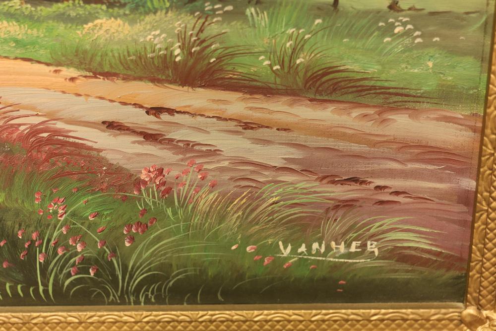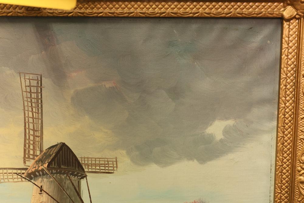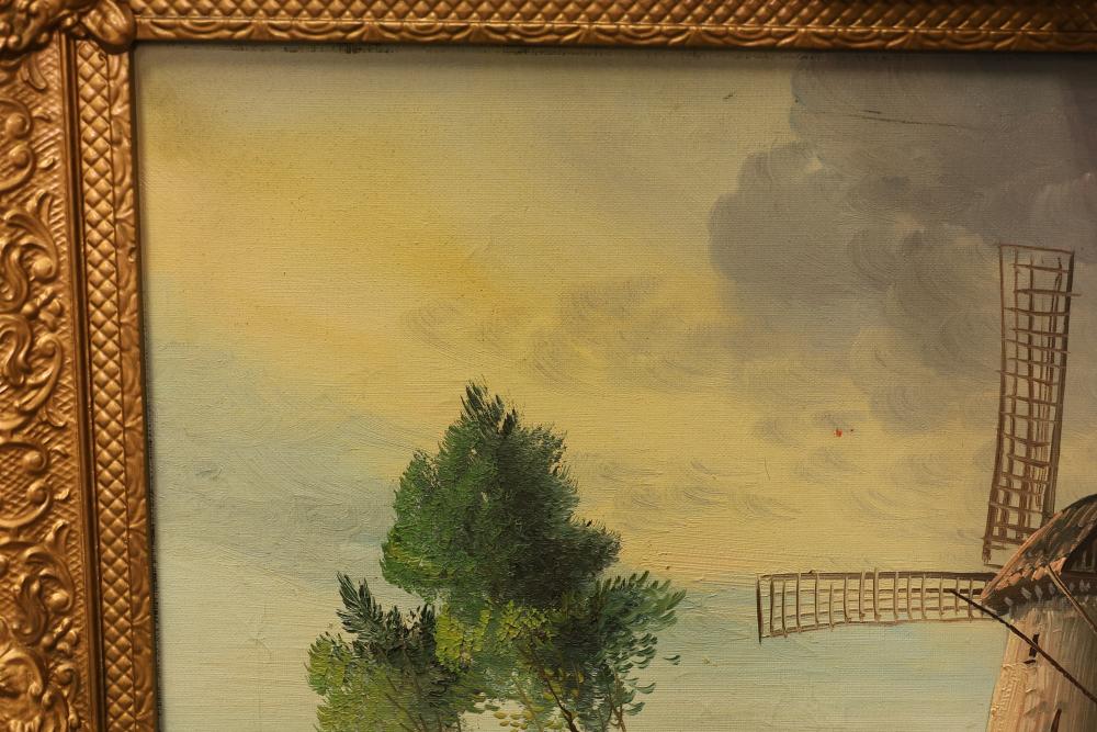 Framed oil painting on canvas measuring approximately 27 inches long and 23.5 inches wide depicting a windmill scene. Features a gilt frame with an attached functional light fixture and is signed "Vanher" on the lower right-hand side. Pickup only.