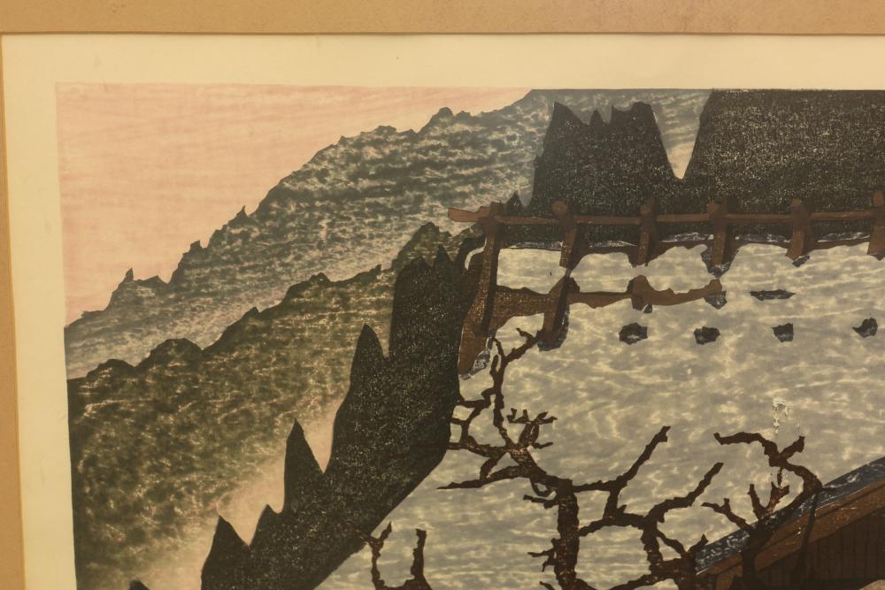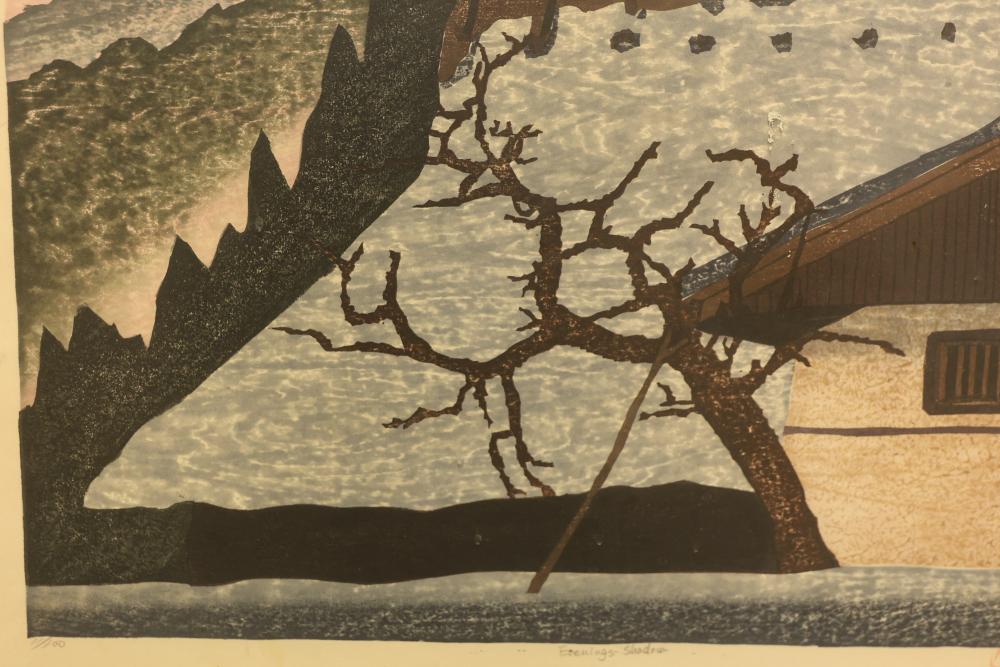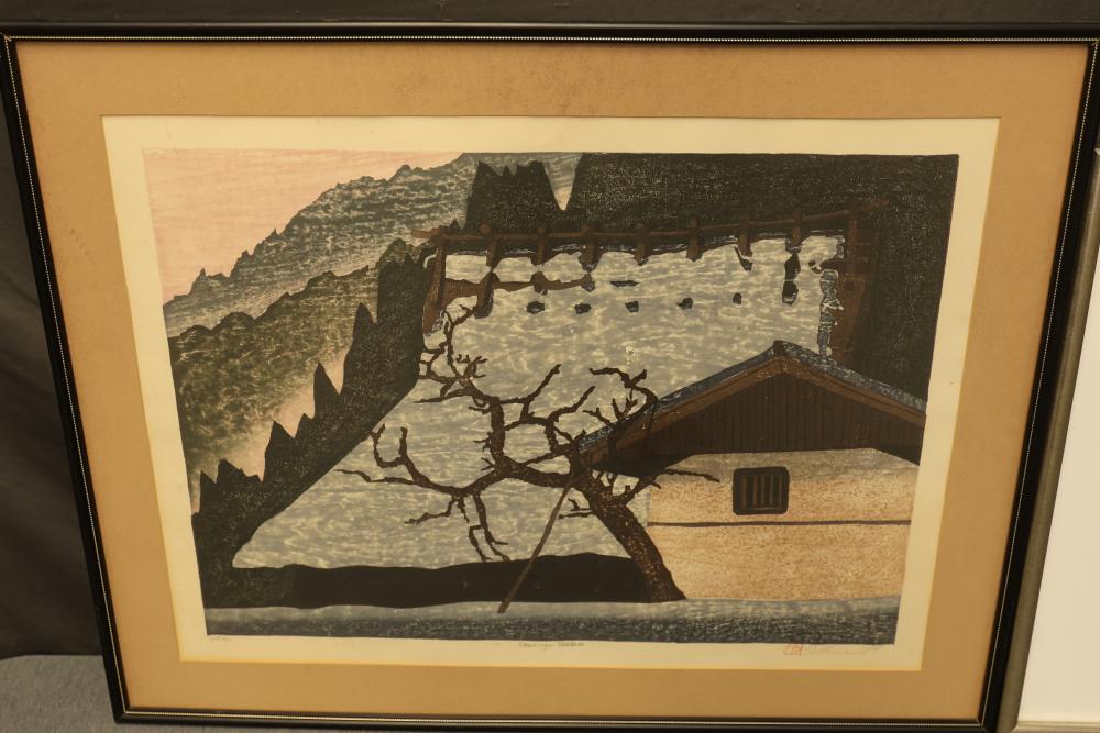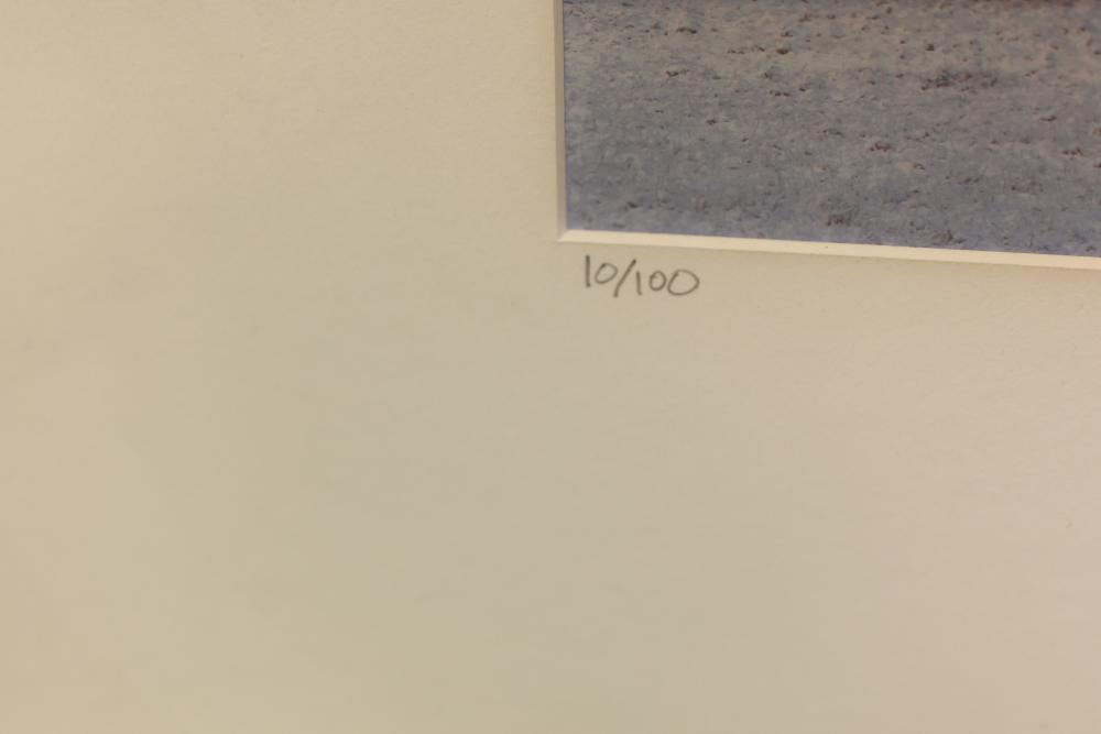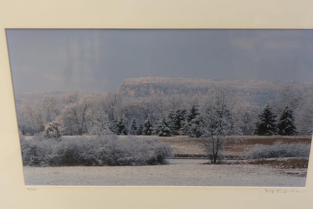 Framed Watercolor and Photograph with Signed Limited Editions. Includes a framed watercolor titled "Evening's Shadow," pencil-signed on the lower right, in a limited run of 11/100, measuring approximately 28.5 inches long and 22.5 inches wide. Also includes a framed landscape photograph of Minnewaska Mountain, pencil-signed on the lower right, in a limited run of 10/100, measuring approximately 27 inches long by 19 inches wide. Pickup only.