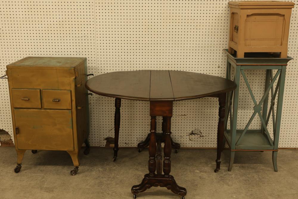 Furniture and accessories including Gateleg Dropleaf Table with Mahogany Finish (approximately 29.5 inches high x 44 inches wide x 36 inches deep), Metal Rolling Medical Cabinet (approximately 34 inches high x 20 inches wide x 16 inches deep), Grange End Table (approximately 37 inches high x 17.5 inches wide x 17.5 inches deep), and Wooden Commode (approximately 16 inches high x 16 inches wide x 16 inches deep). Pickup only.