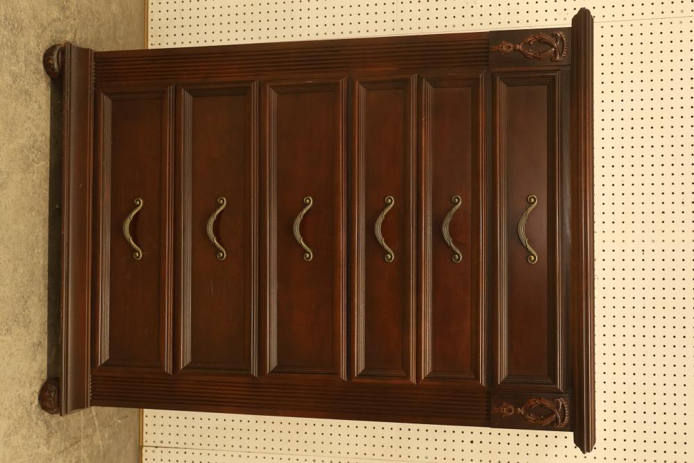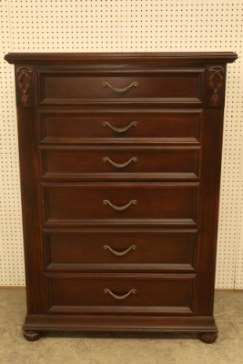 5-Drawer Dresser With Cherry Finish, Bunt Feet, and Applied Carving. Features all-matching metal pulls, a rich cherry finish, decorative applied carving, and bunt feet. Measures approximately 53 inches high, 34.5 inches wide, and 19 inches deep. Pickup only.