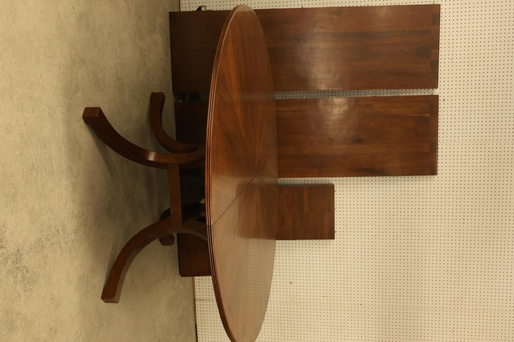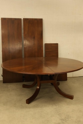 Round Wooden Expandable Dining Table. Table measures approximately 29 inches high with a 72 inch diameter. Features a wooden finish and comes with two leaves measuring approximately 72 inches long by 22 inches wide each. Includes two base extensions, one measuring 44 inches long by 15.75 inches wide and one measuring 22.25 inches long by 15.75 inches wide. Pickup only.