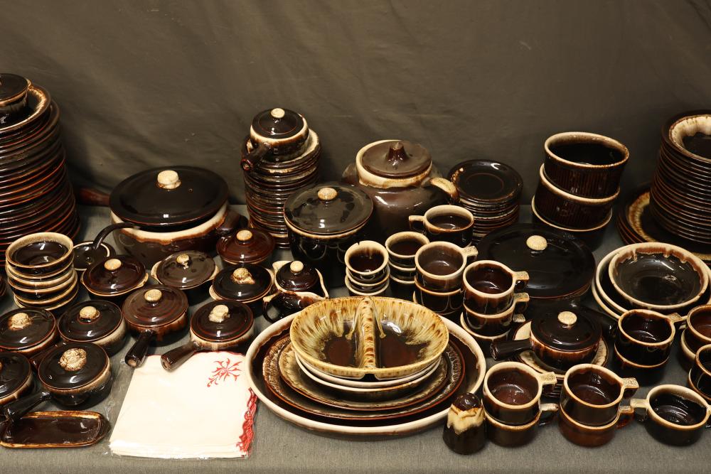Pfaltzgraff Brown Drip Dinnerware Set with Tablecloth. Includes dinner plates, teapots, coffee mugs, bowls, pans, and a tablecloth. Pickup only.