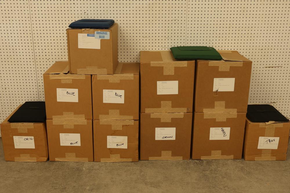 11 Cases of Backthings with Multiple Blue, Green, and Black Cushions. Includes 48 blue 6-slat cushions with 1-inch foam, 40 green 8-slat cushions with 1-inch foam, 25 black 6-slat cushions with 1/4-inch foam, and 10 black 6-slat cushions with 1-inch foam. Used for back support on chairs. Pickup only.