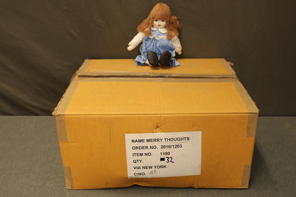 Quantity of 32 Merry Thoughts Dolls in original packaging. Each doll features brown yarn hair, a painted face, and a blue floral dress. Includes a sealed box labeled with the product and quantity details. Pickup only.