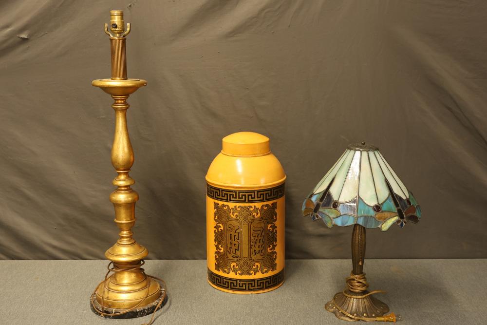 18 Inch Bronze-Toned Lamp with Flared Feet and Leaded Stained Glass Style Lamp Shade featuring a Dragonfly design. Includes a 30.5 Inch Candlestick Brass Lamp with Decorative Base and a Decorative Tea Caddy with Chinoiserie design. Both lamps are functional, but light bulbs are not included. Pickup only.