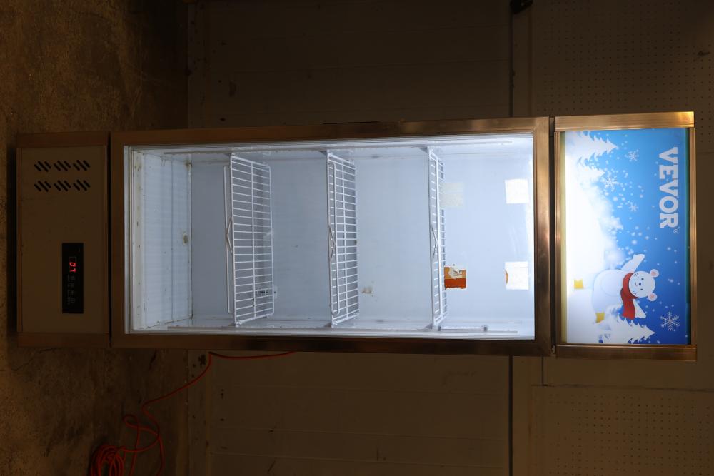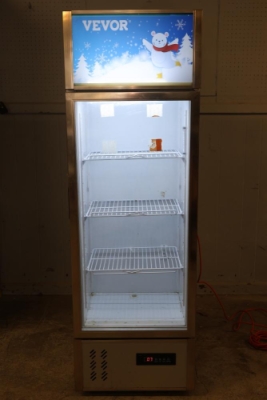 Vevor Cooler Model LC-228 R290 Refrigerant 110 V 50 Hz with a capacity of 228 liters. Measures approximately 66.75 inches high, 21.5 inches wide, and 18.75 inches deep. Includes internal shelves and temperature gauge. Extension cord is not included. Pickup only.