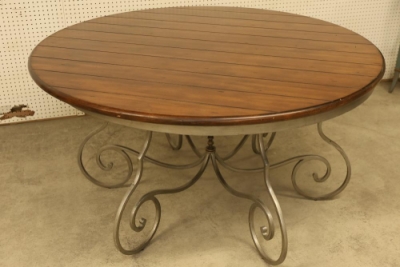 Harden Round Dining Table with Metal Legs. Features wooden finish and metal frame and legs. Hardware is included and attached to the legs. Table measures approximately 30 inches high with a 60 inch diameter. Pickup only.