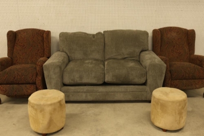 Lounge Furniture Set with Greenland Charcoal Gray Loveseat, Two Brown Paisley Recliners, and Two Footstools. The loveseat measures approximately 32 inches high x 65 inches wide x 41 inches deep. Recliners measure approximately 38 inches high x 29.5 inches wide x 29 inches deep each. Footstools measure approximately 16.5 inches high with a 16-inch diameter. Pickup only.