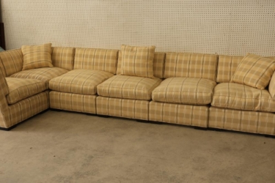 6-Piece Modular Sectional Donghia John Hutton Design. Features cushions, three throw pillows, and a checkered fabric pattern. Measures approximately 29 inches high, 156 inches wide, and 72 inches deep. Pickup only.